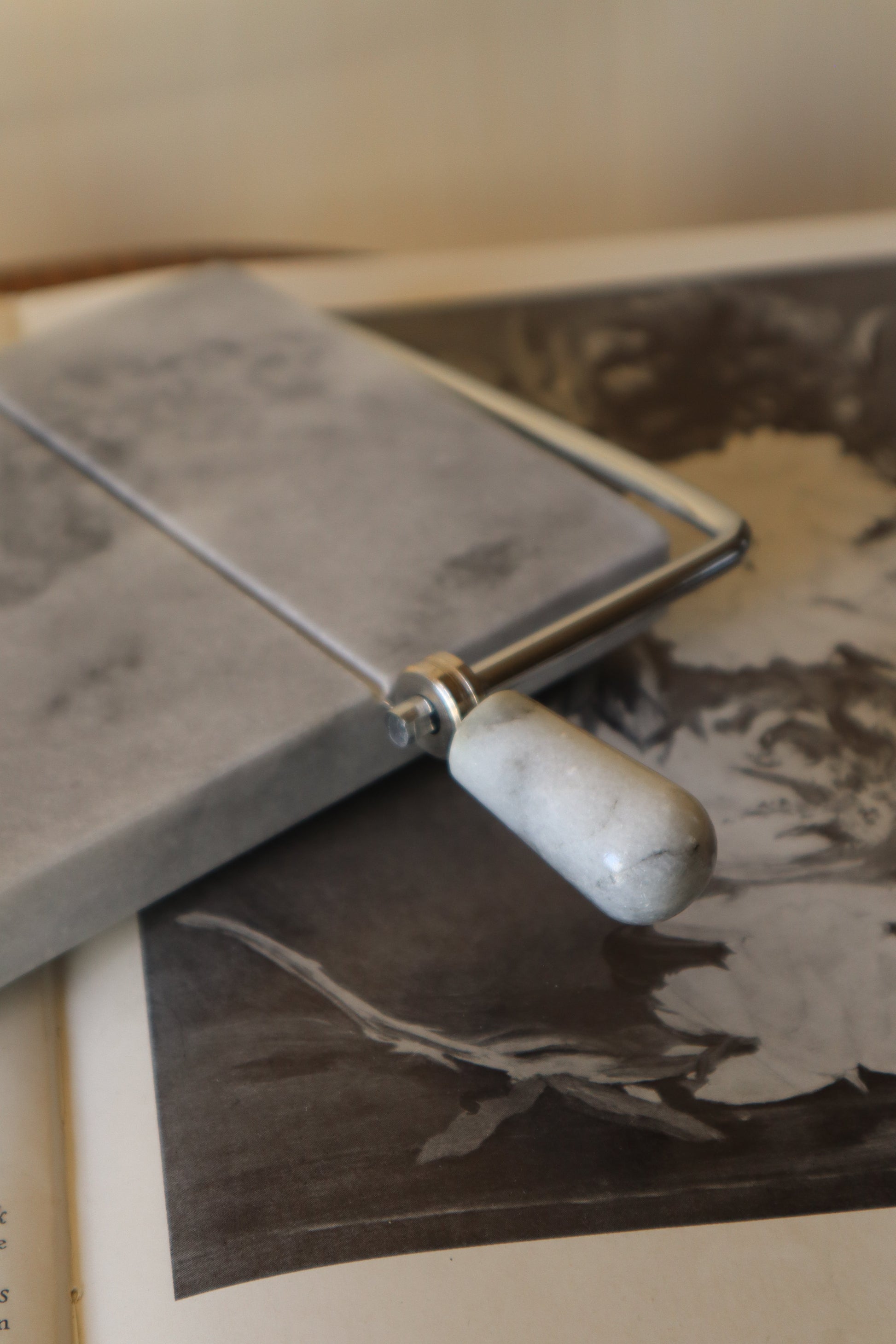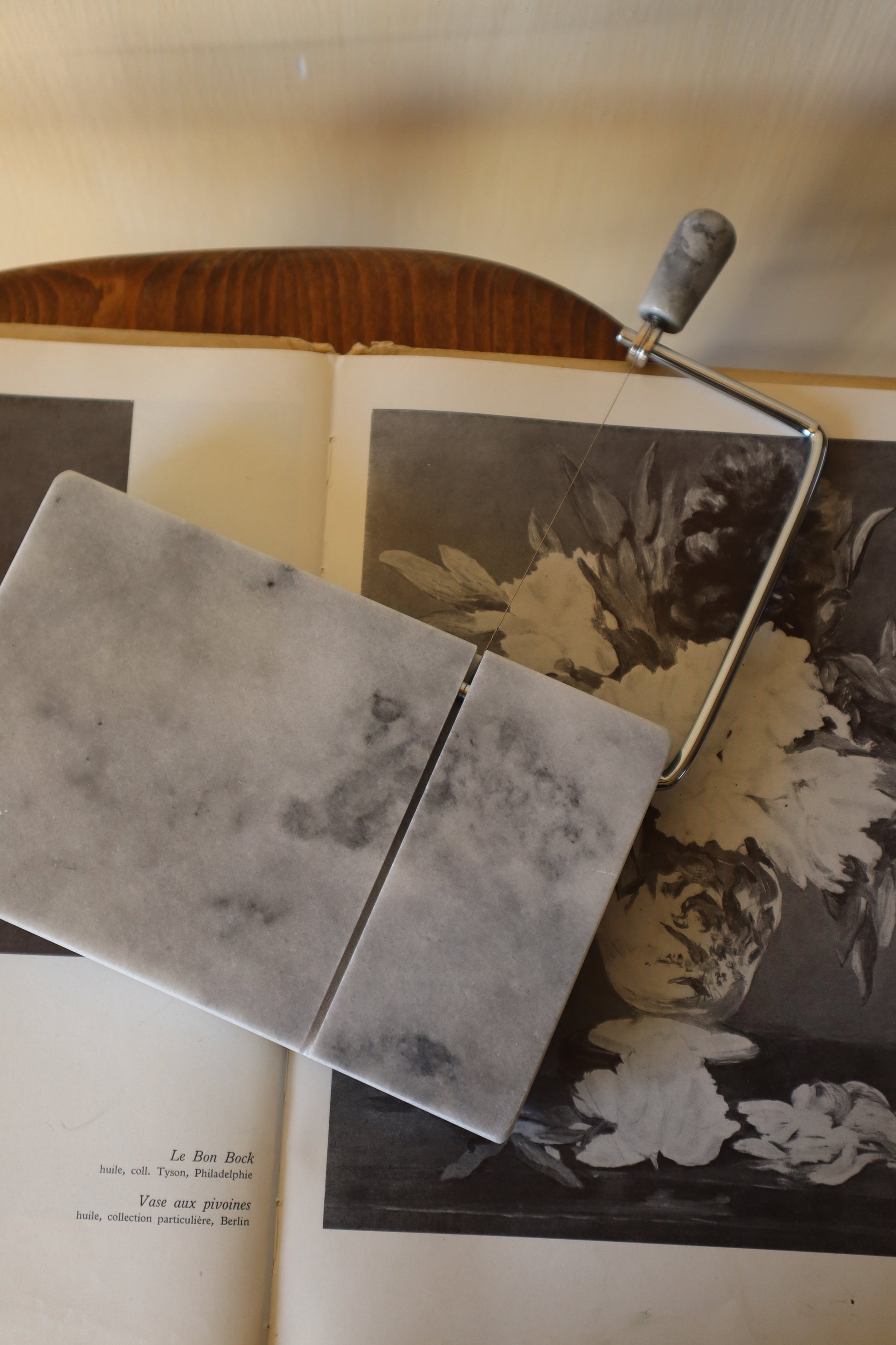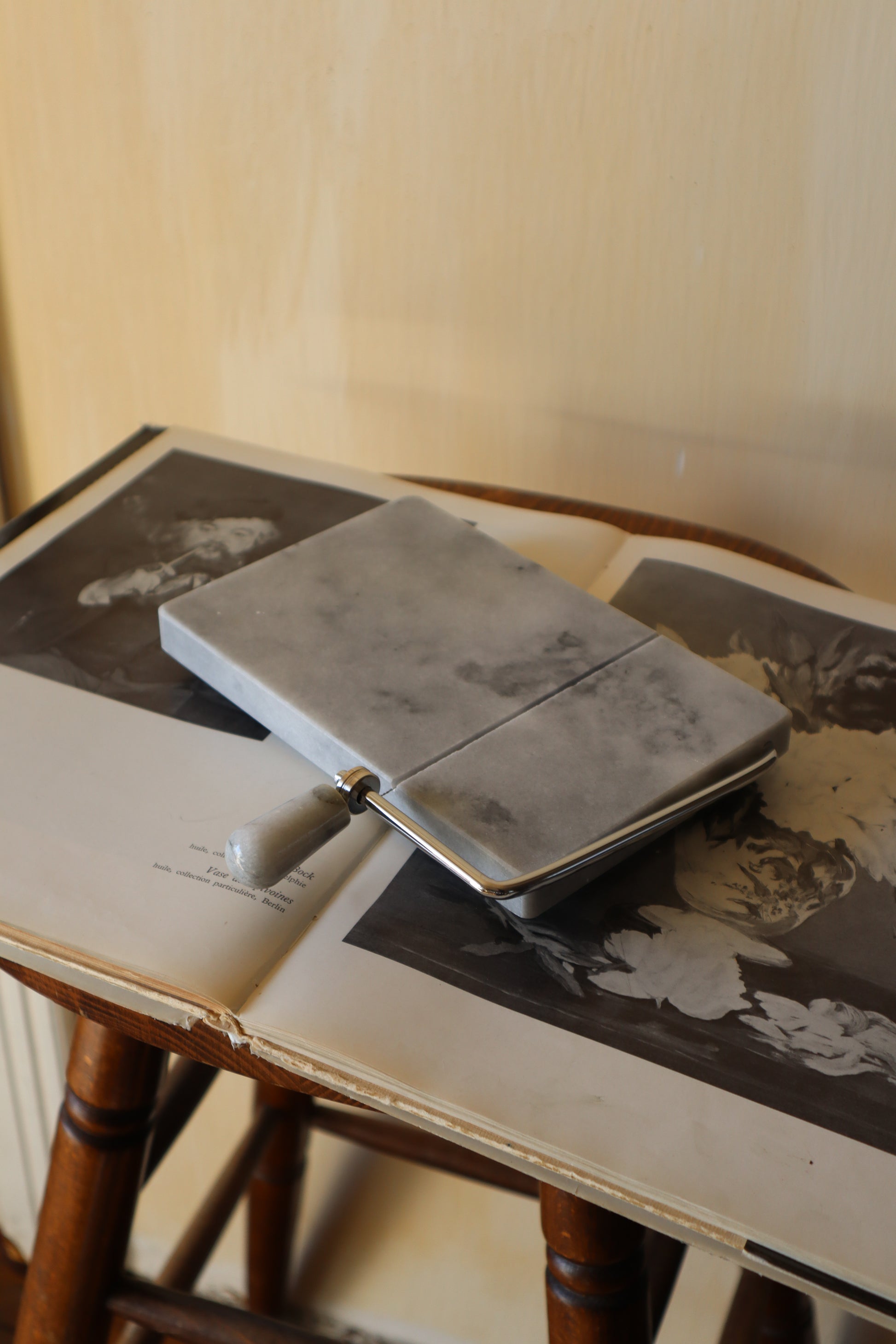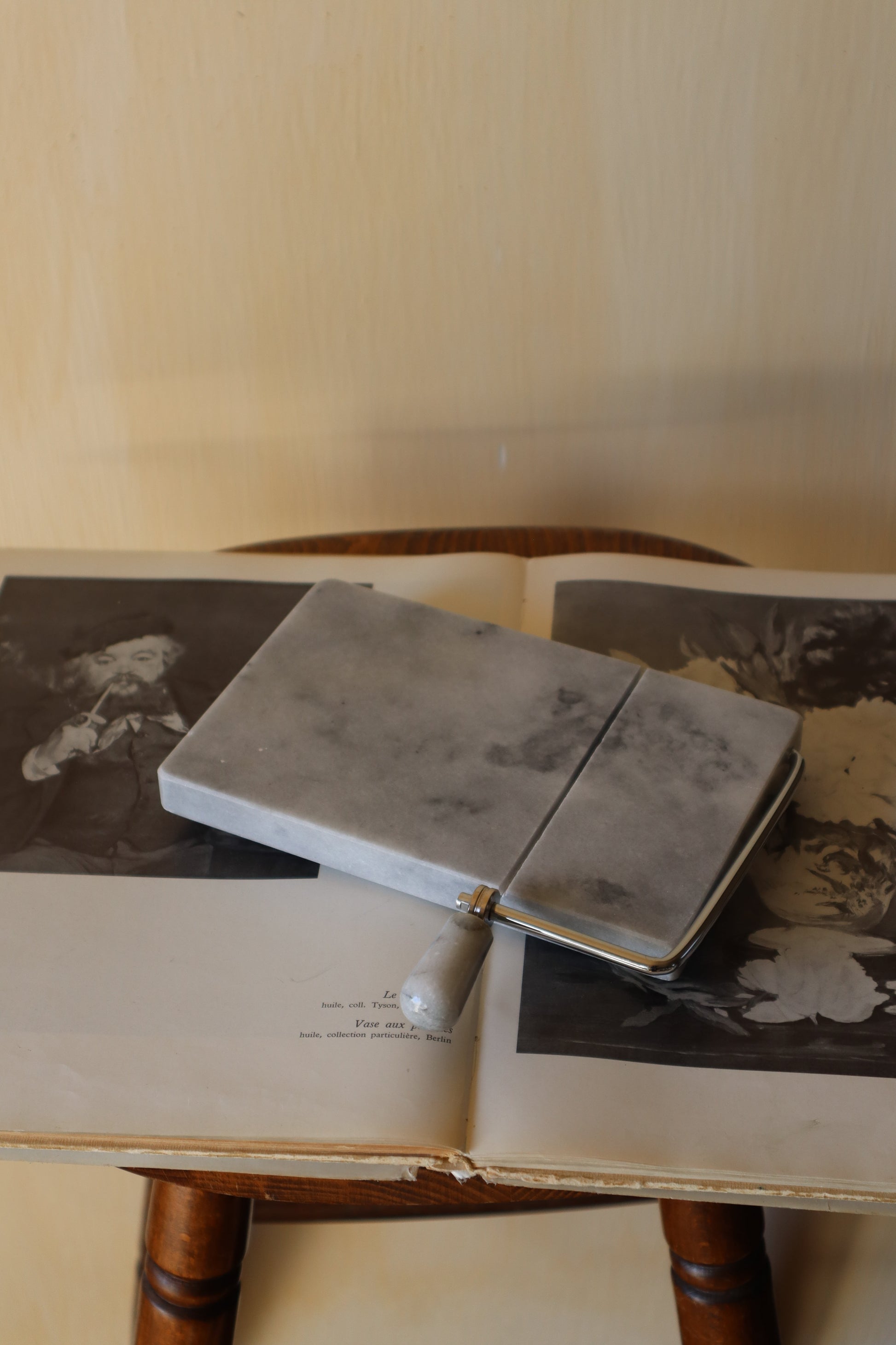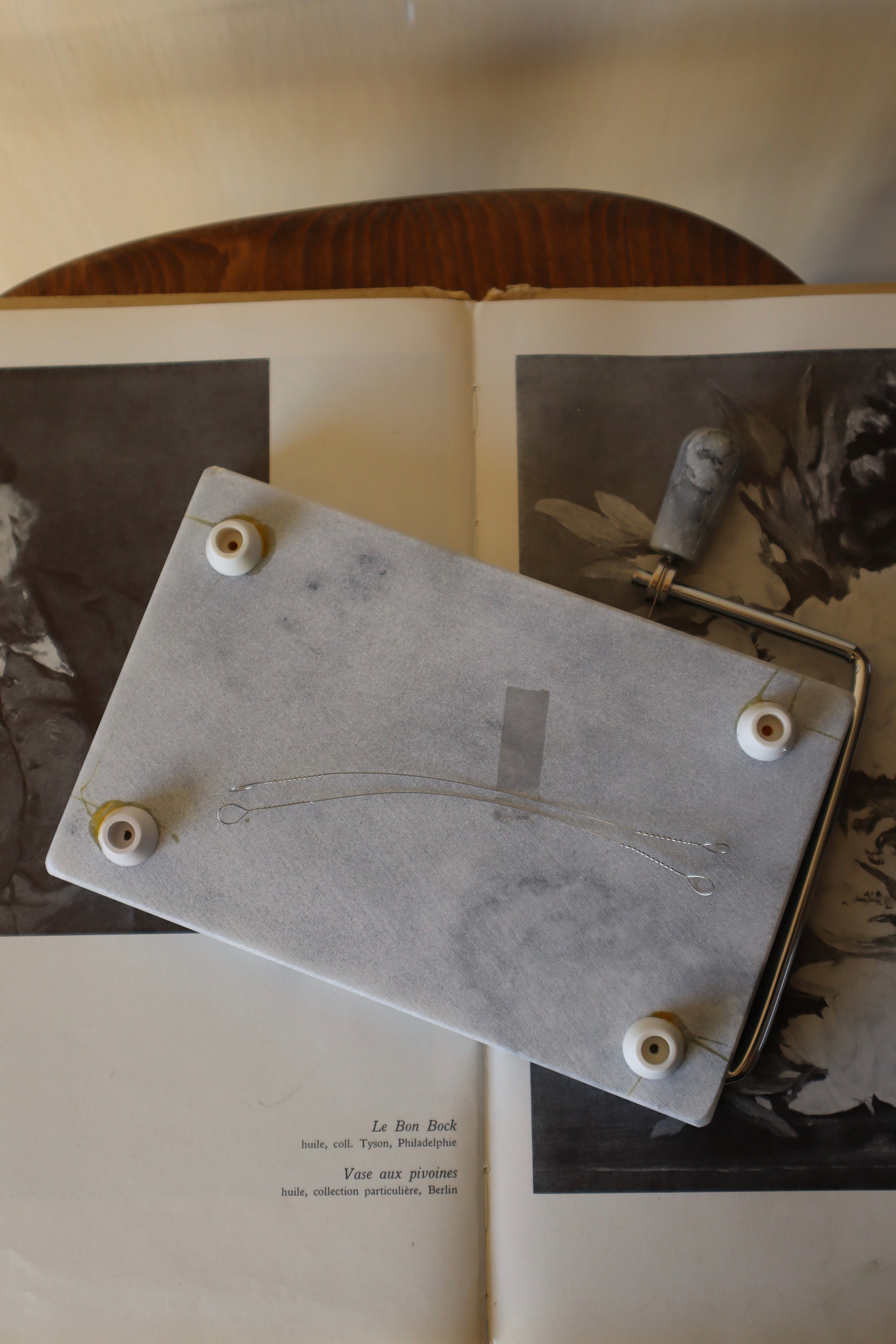 Feliator vintage și tavă de servire din marmură cu braț de oțel.