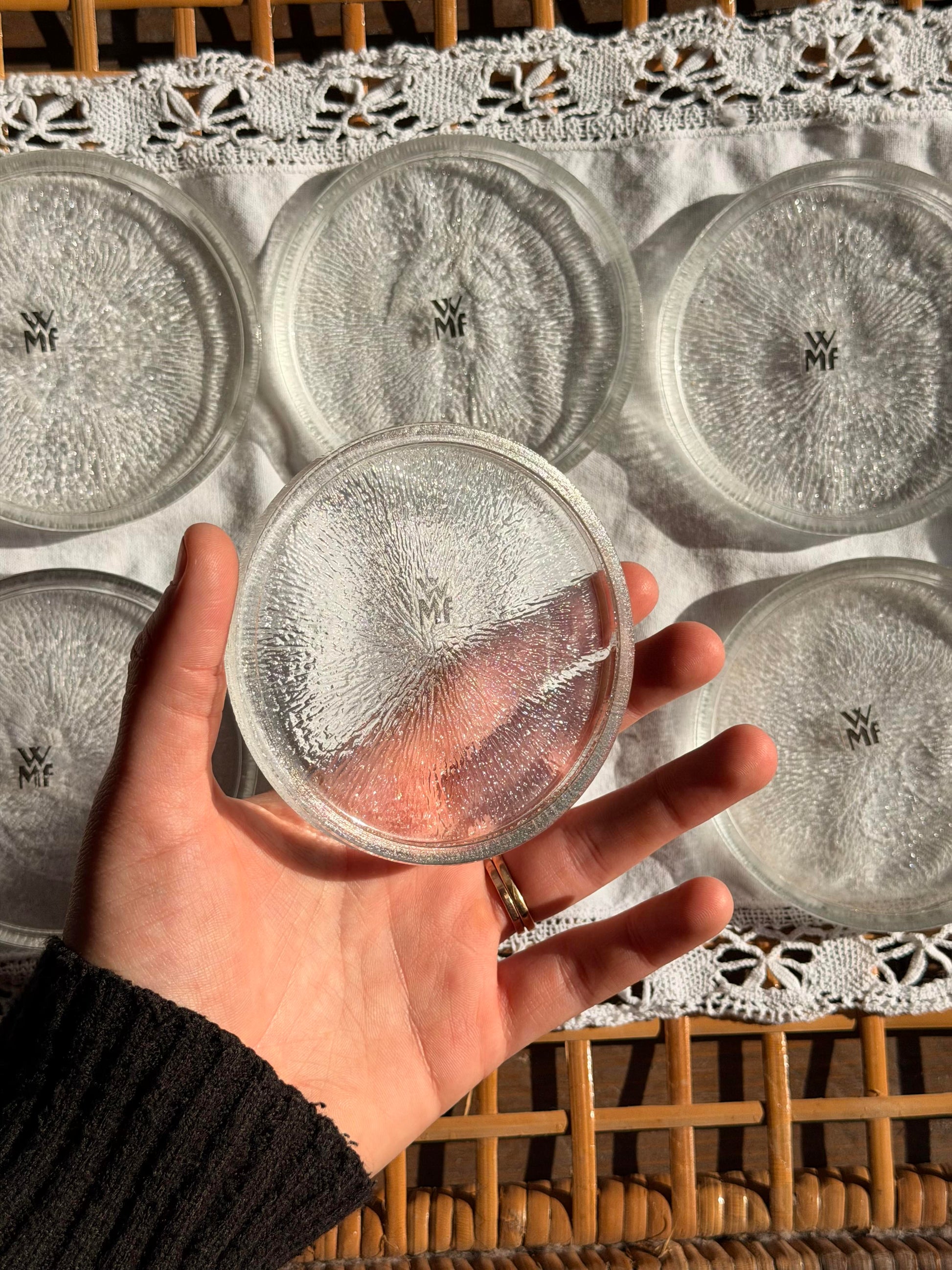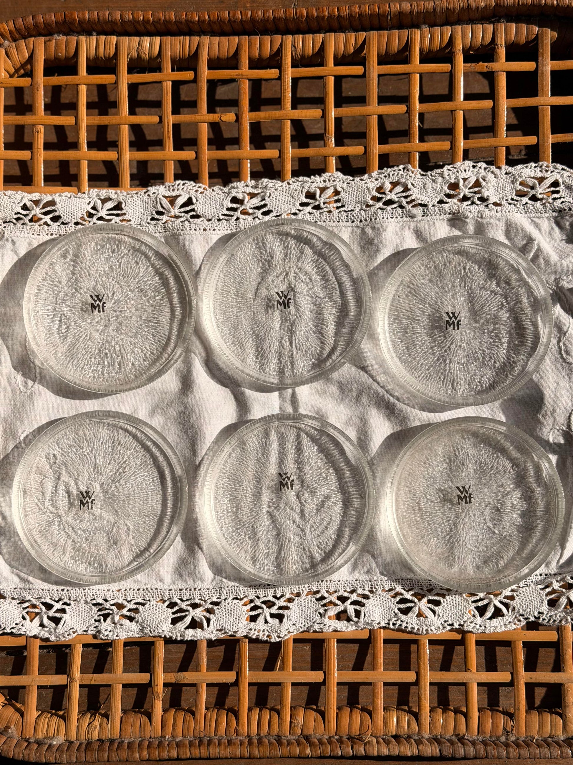 Set de 6 suporturi vintage WMF din sticlă texturată. Realizate din sticlă de calitate superioară, aceste suporturi sunt durabile și rezistente la uzură cotidiană. Designul vintage le conferă o apariție sofisticată, potrivite atât pentru mese de zi cât și pentru colecții de obiecte decorative. Marca WMF garantează calitate și atenție la detalii în fiecare piesă.