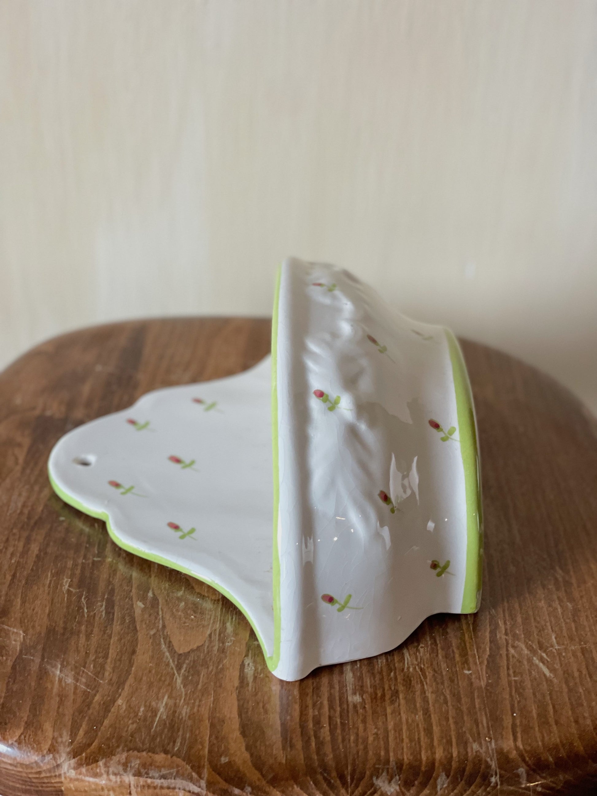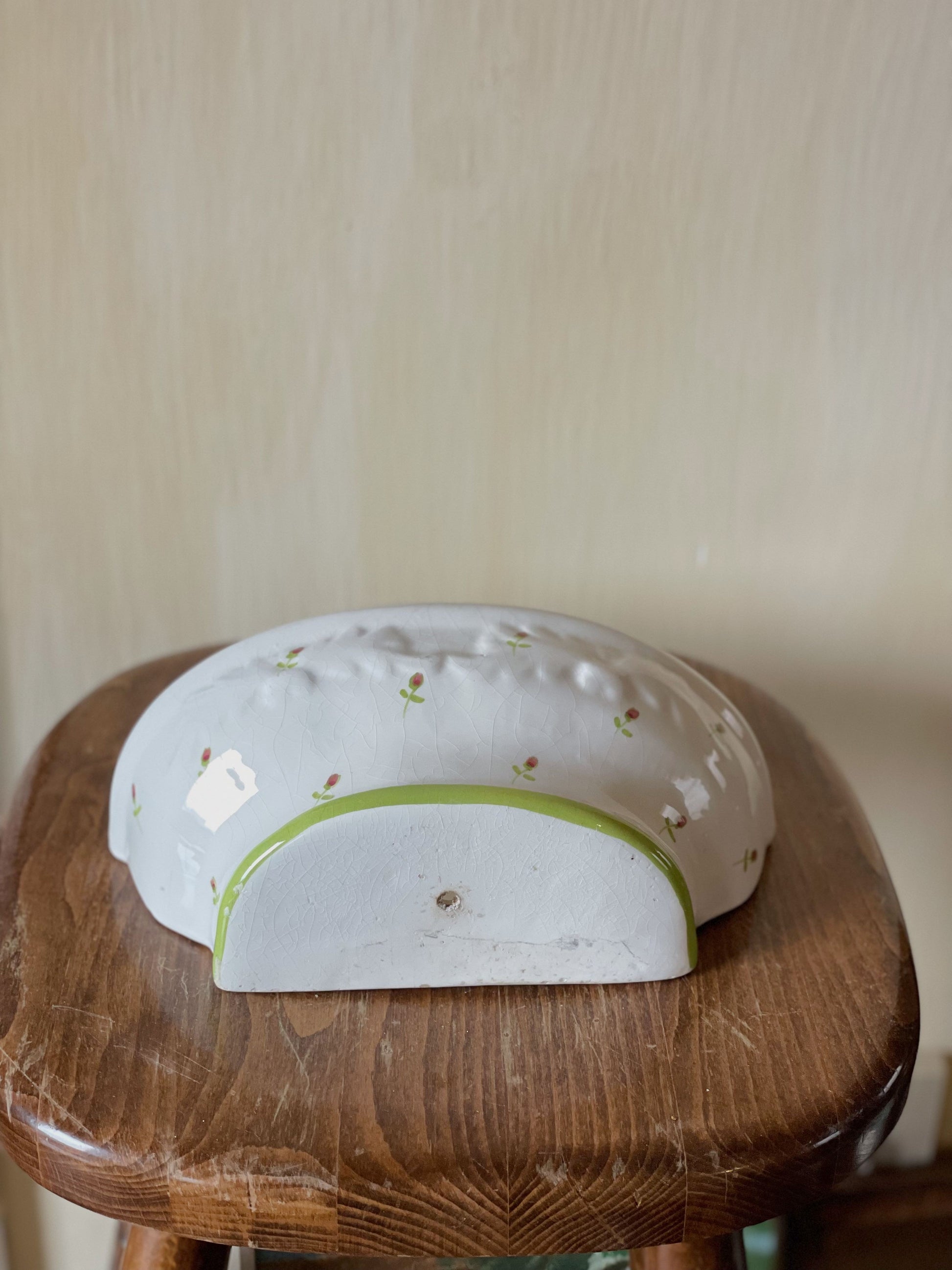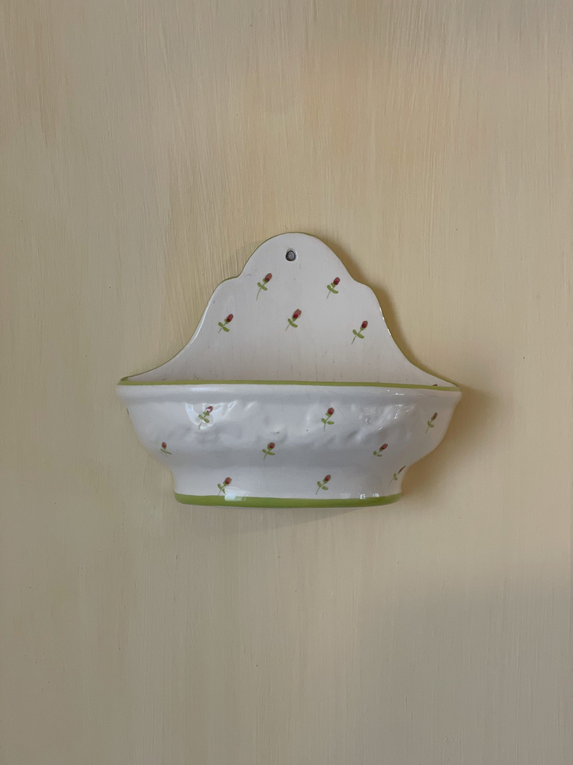Suport pentru flori lucrat manual, prezintă orificiu pentru prindere în perete.