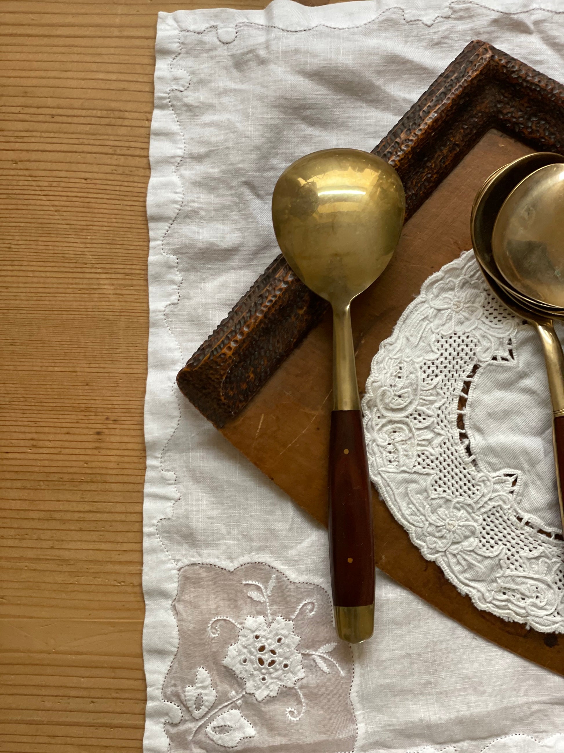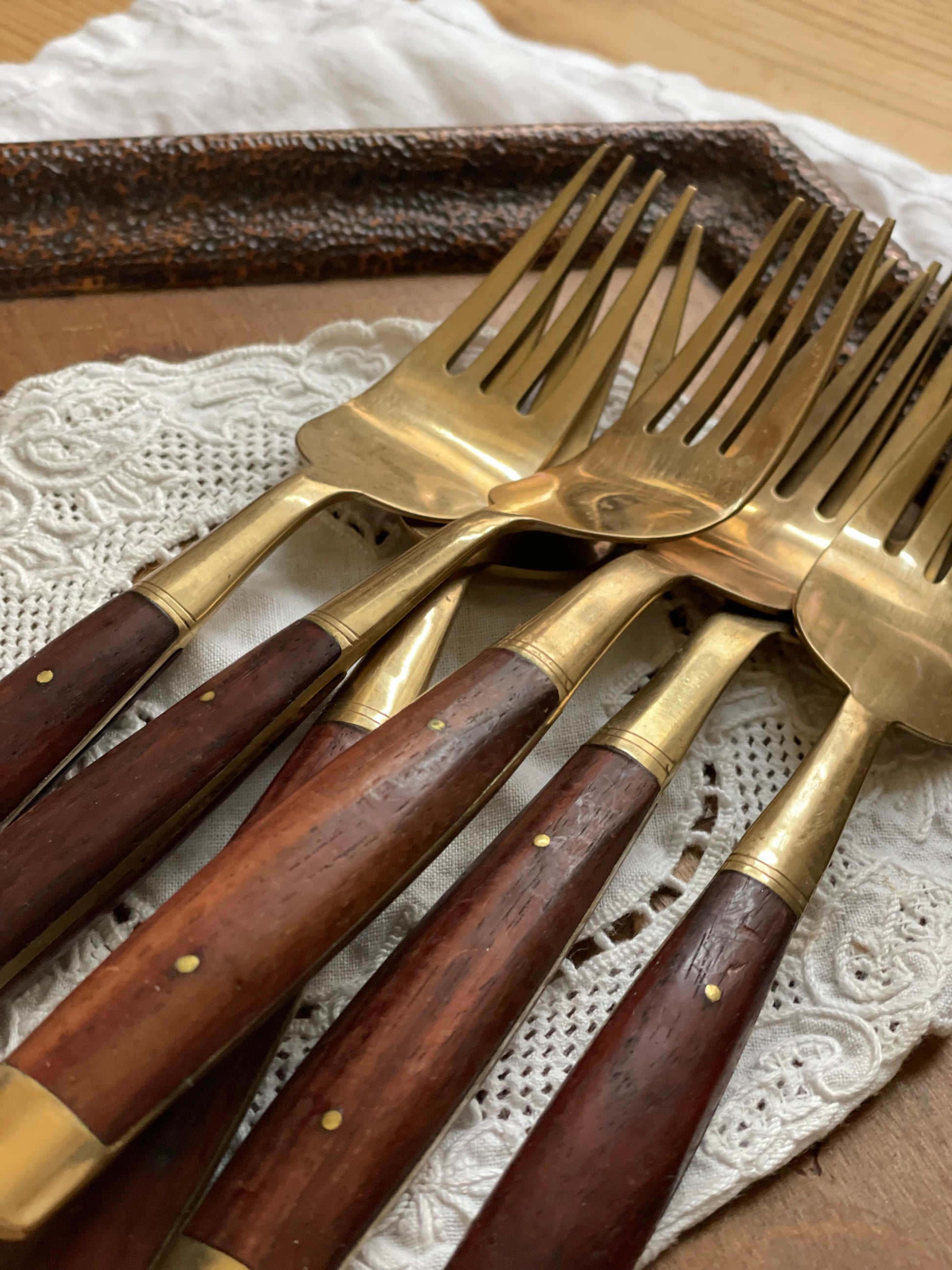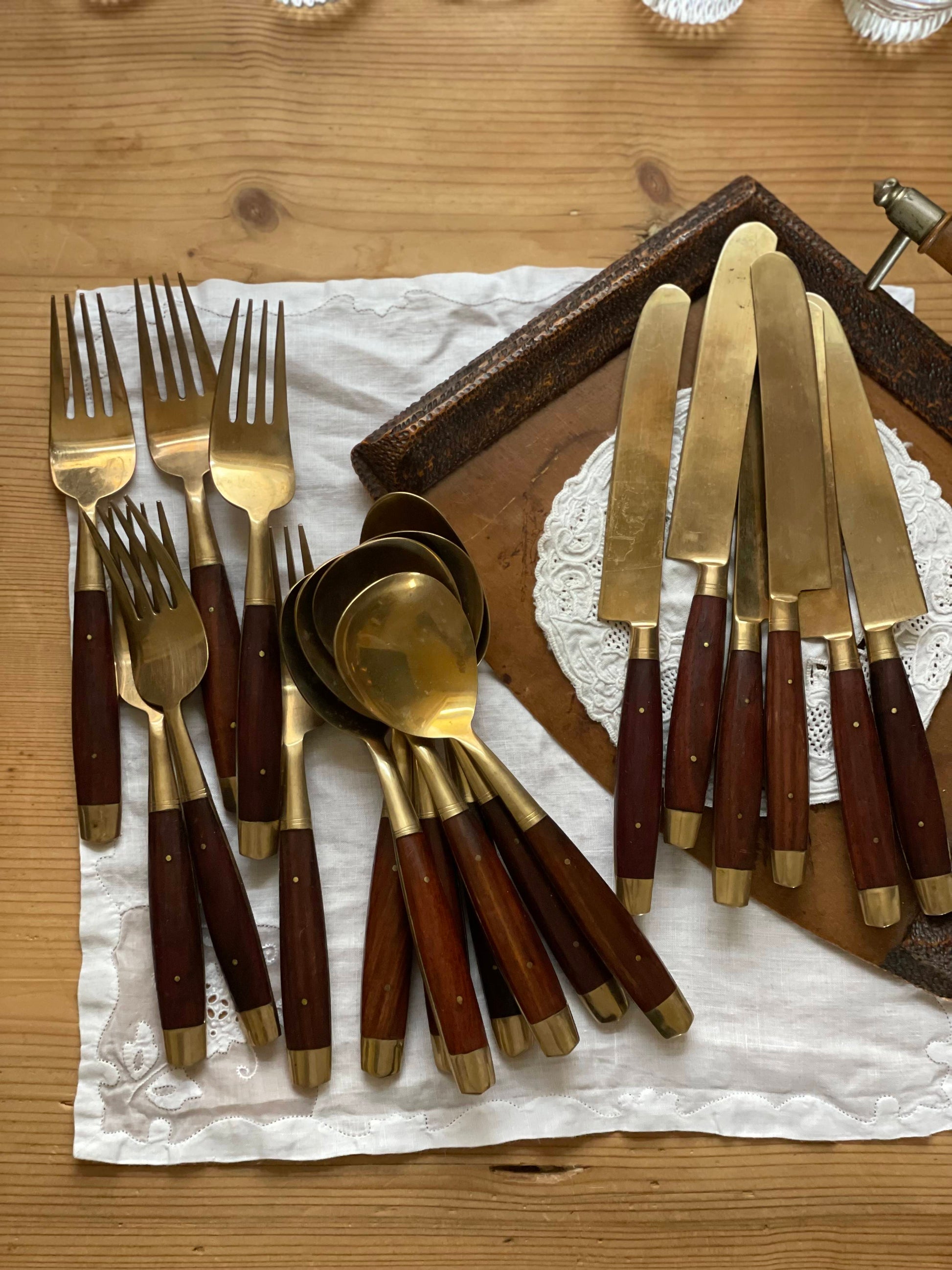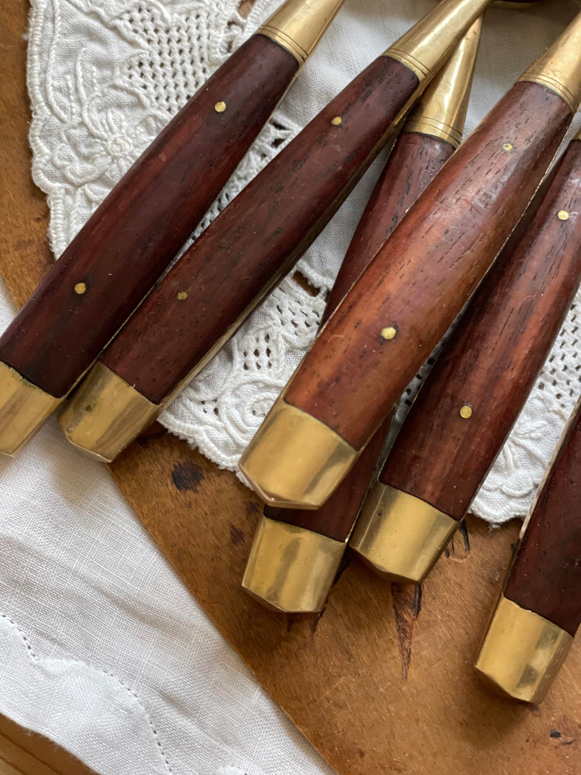 Tacâmuri vintage din alamă și lemn de trandafir, mid-century