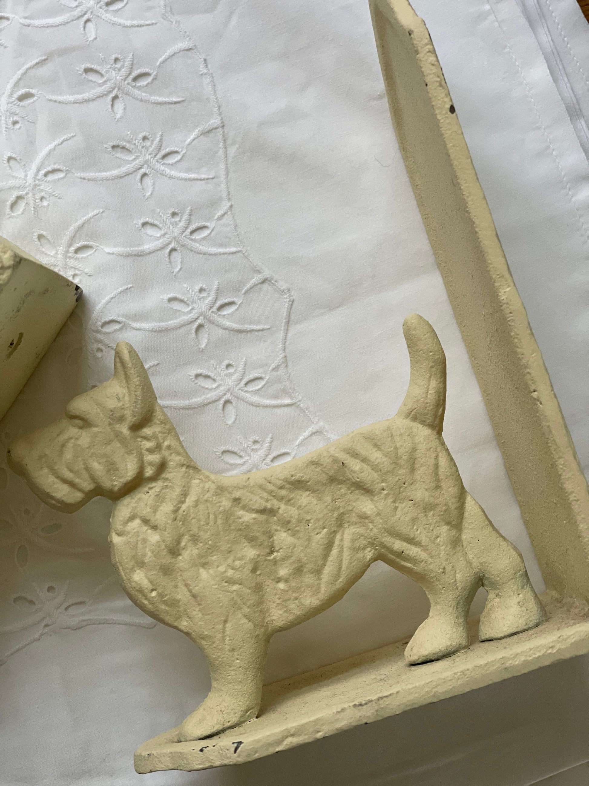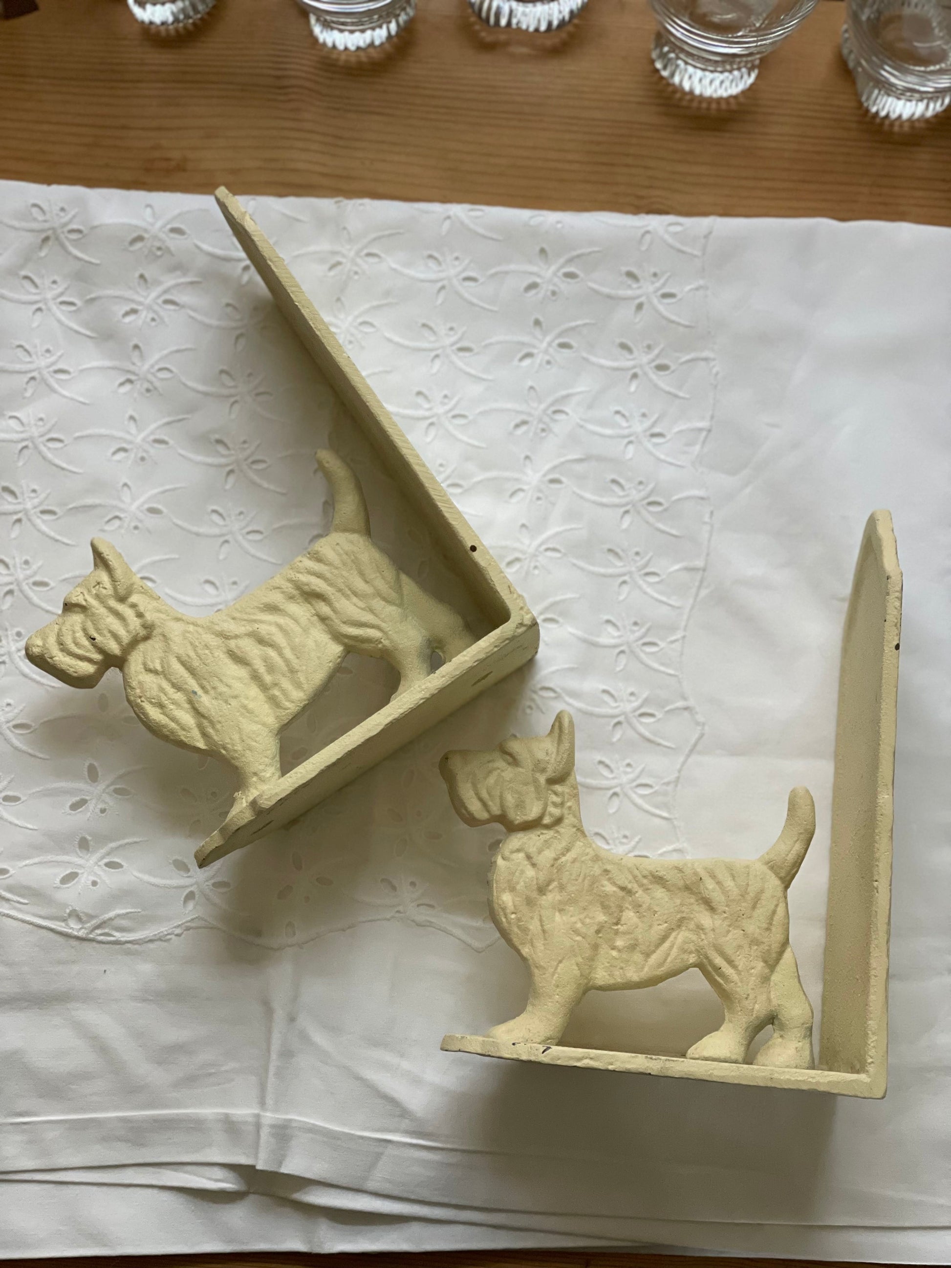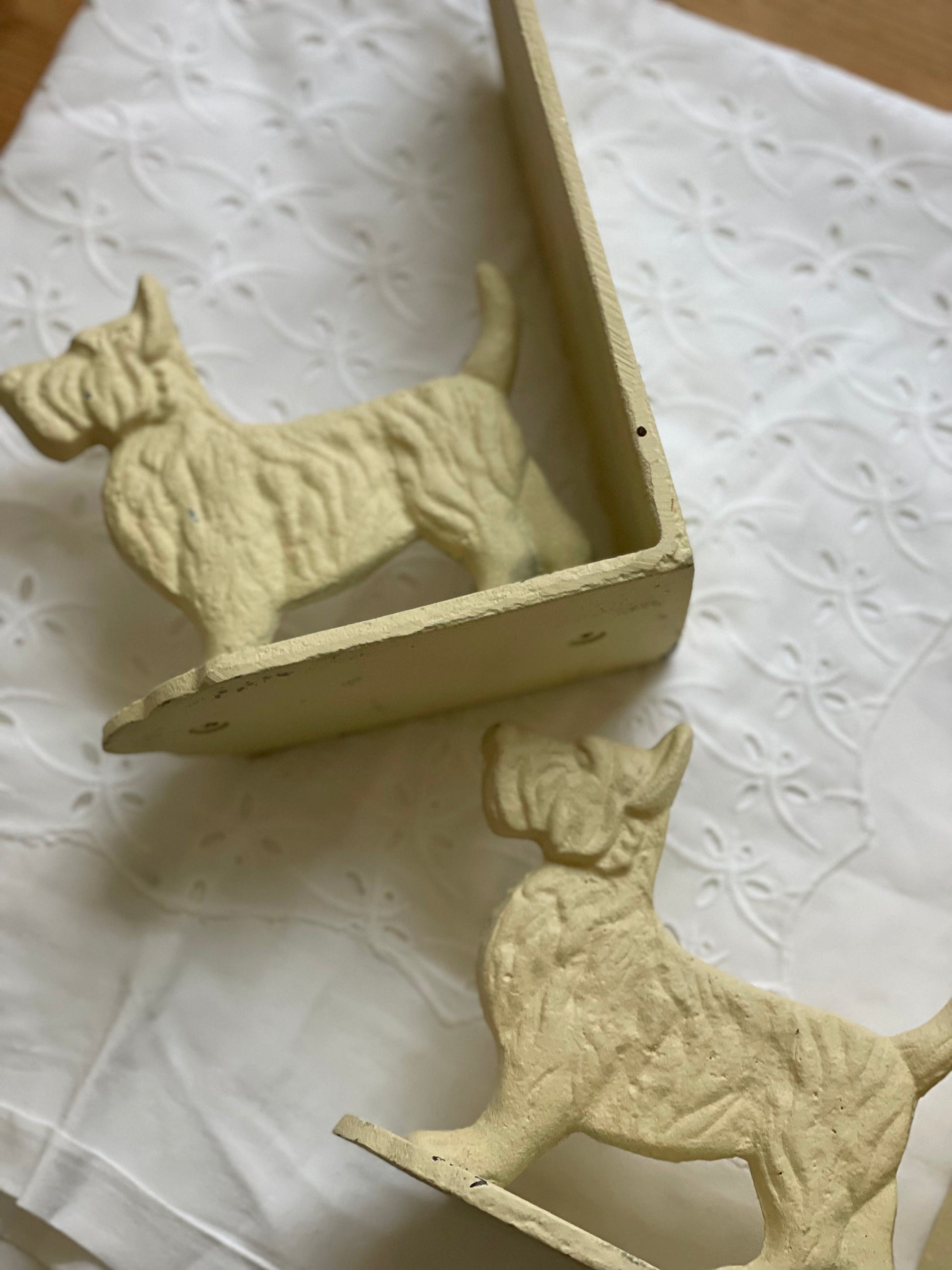 Perechea de suporturi pentru cărți în stil vintage prezintă o construcție robustă din fontă vopsită bej, ideală pentru stabilizarea volumelor grele pe raft.