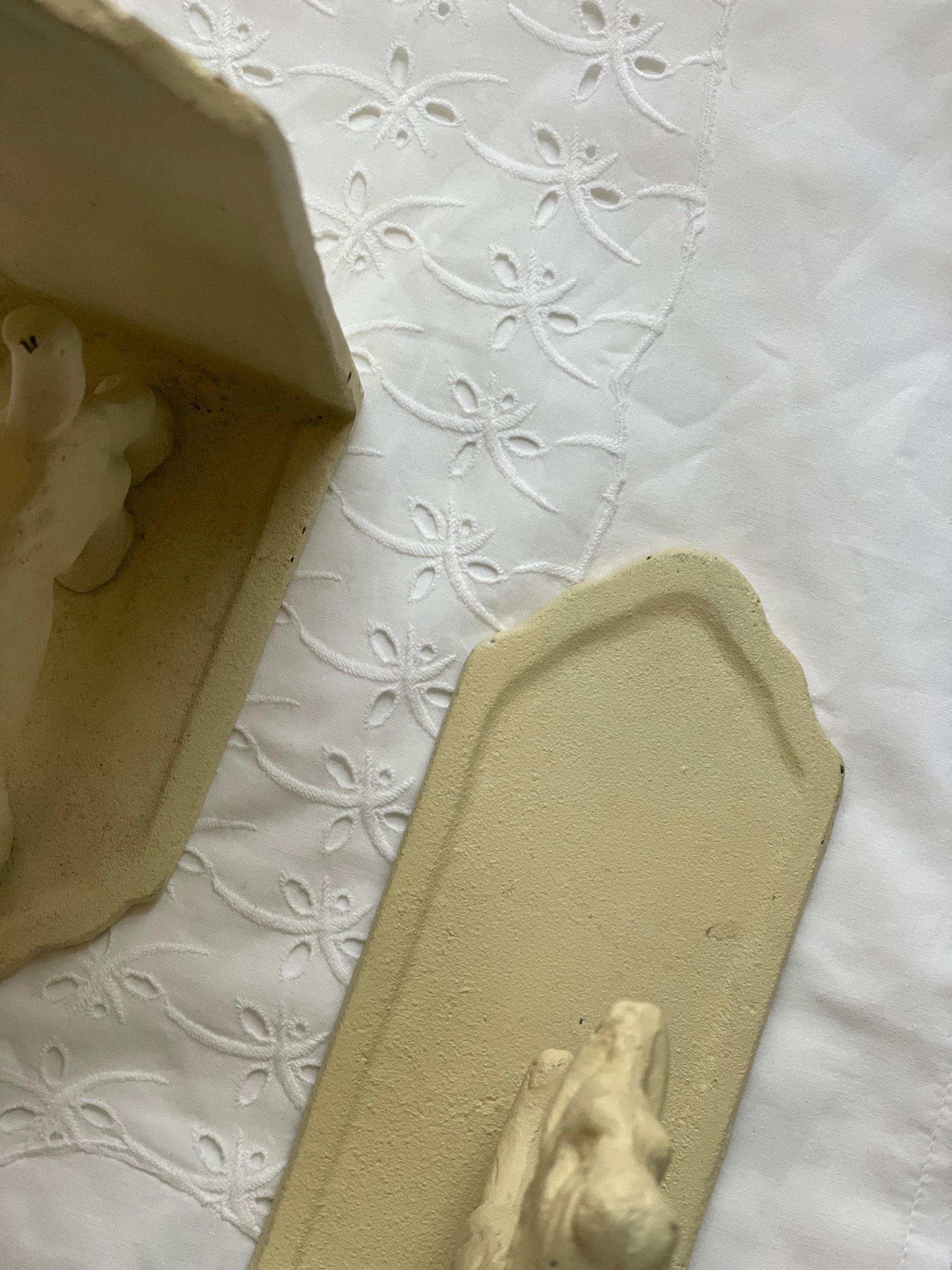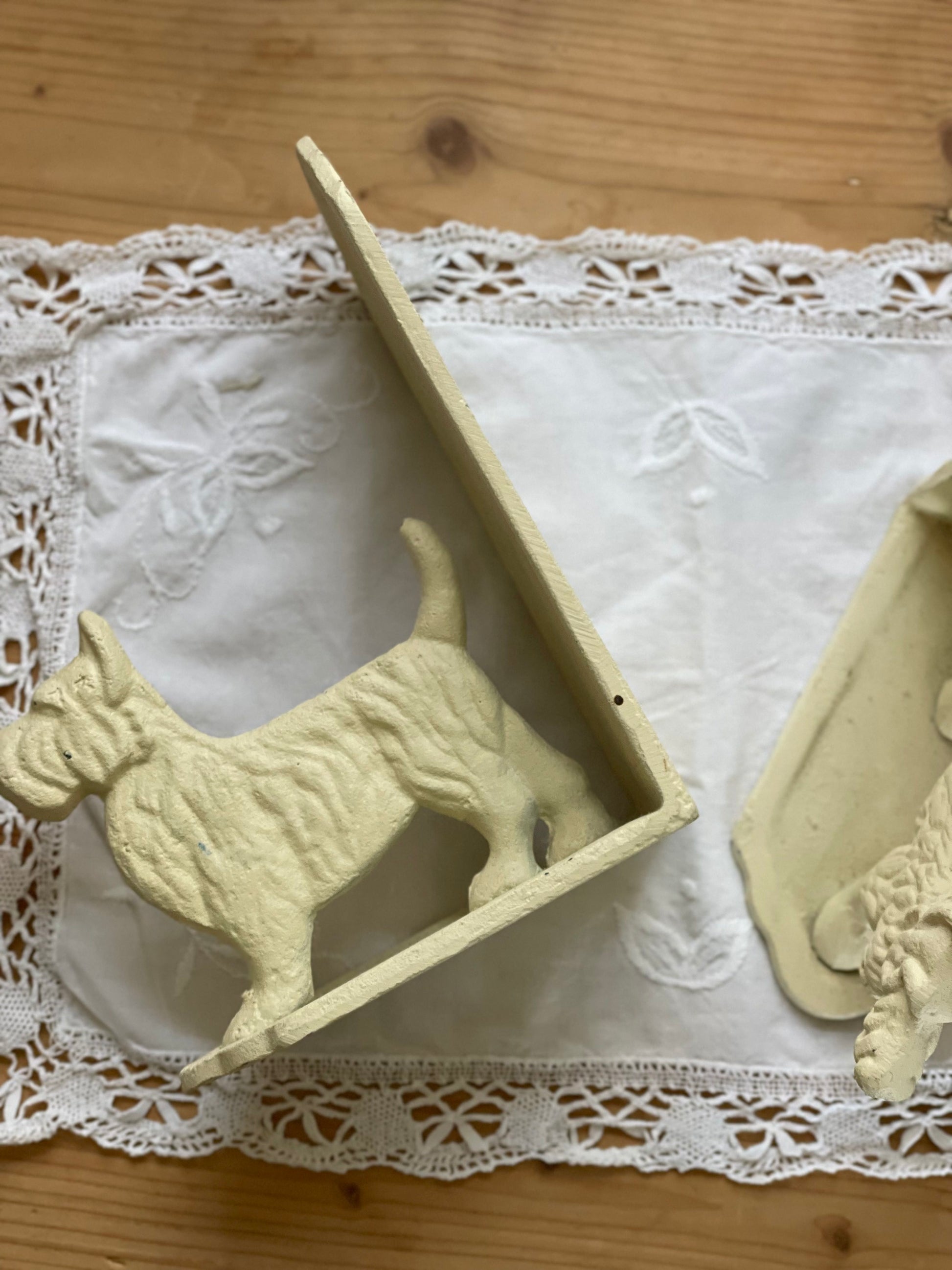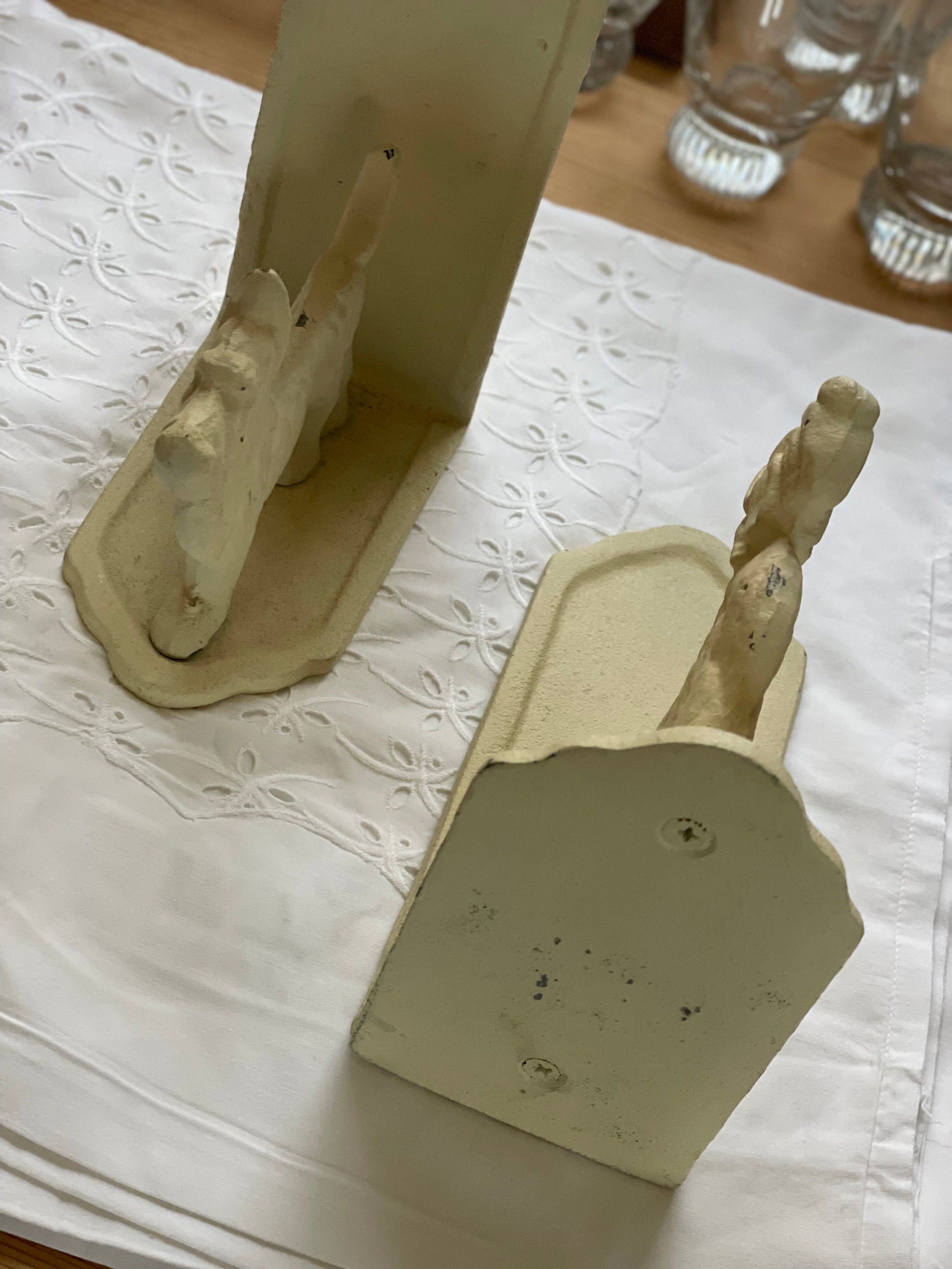 Perechea de suporturi pentru cărți în stil vintage prezintă o construcție robustă din fontă vopsită bej, ideală pentru stabilizarea volumelor grele pe raft.