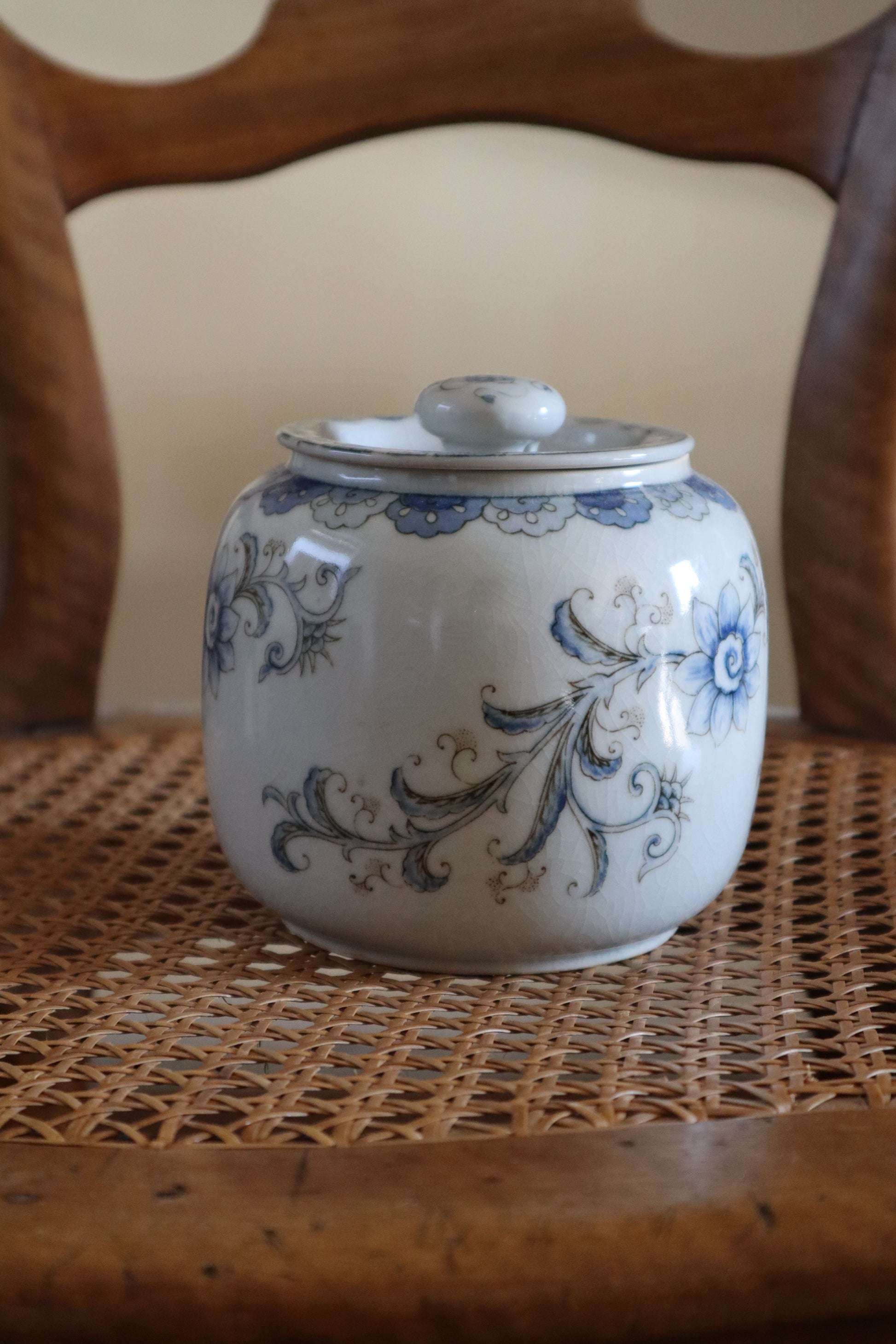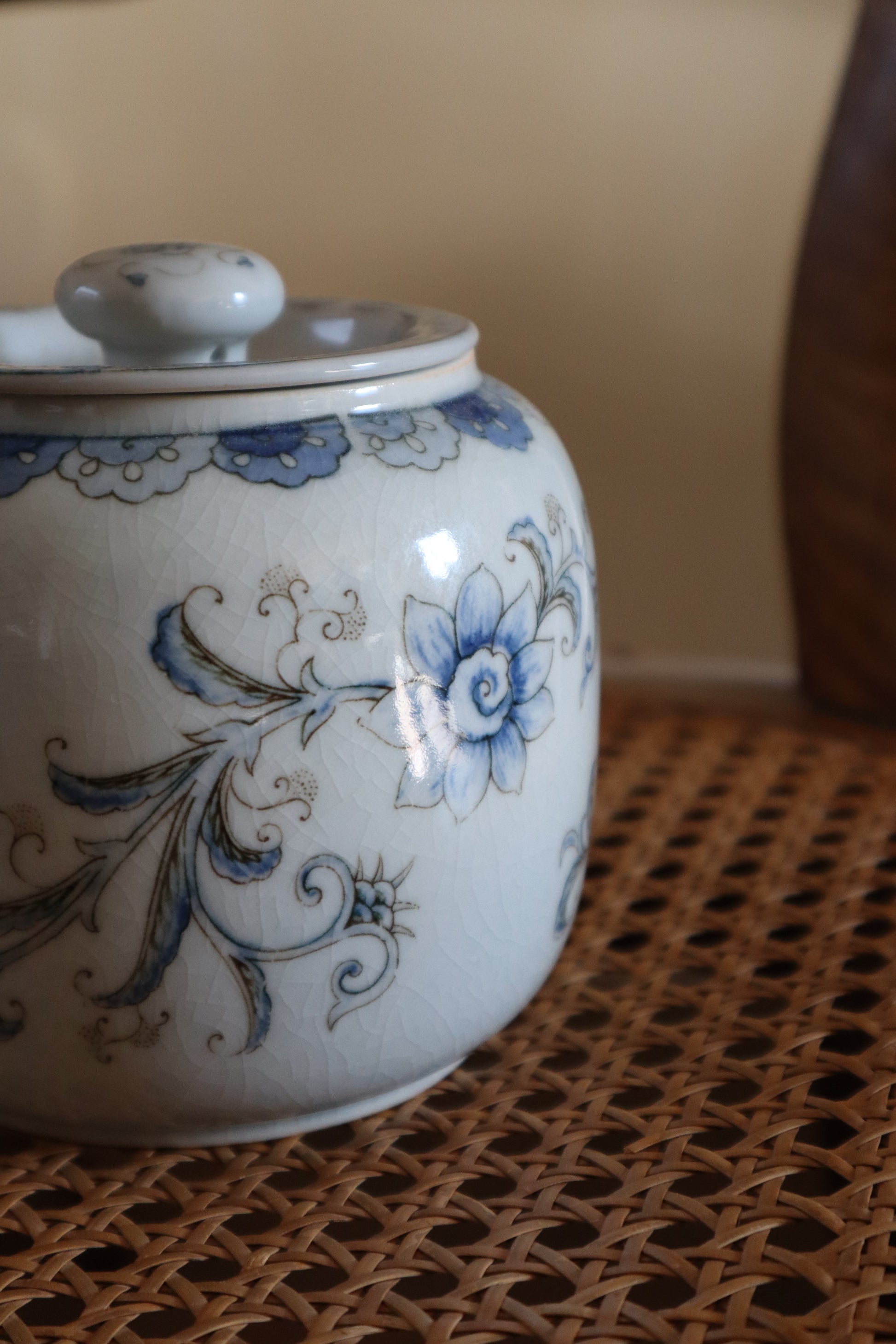 Borcan de ghimbir/ceai vintage din porțelan fabricat în Japonia cu motive florale albastre și albe.