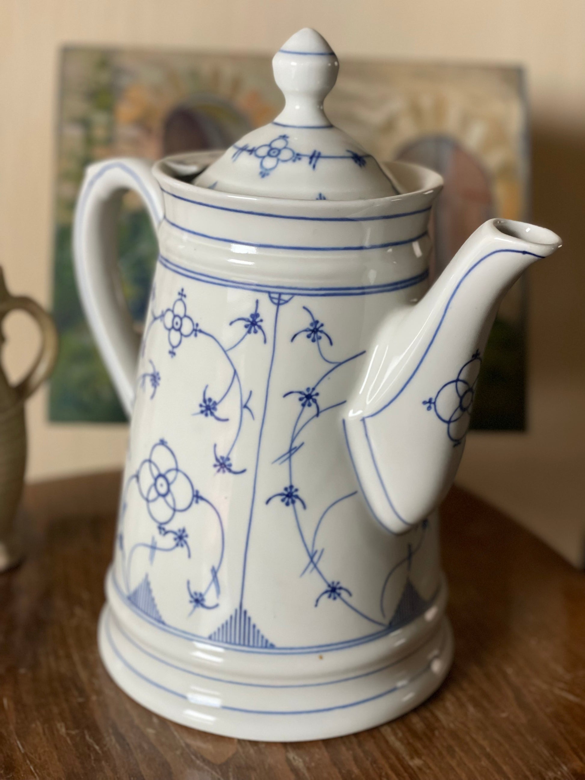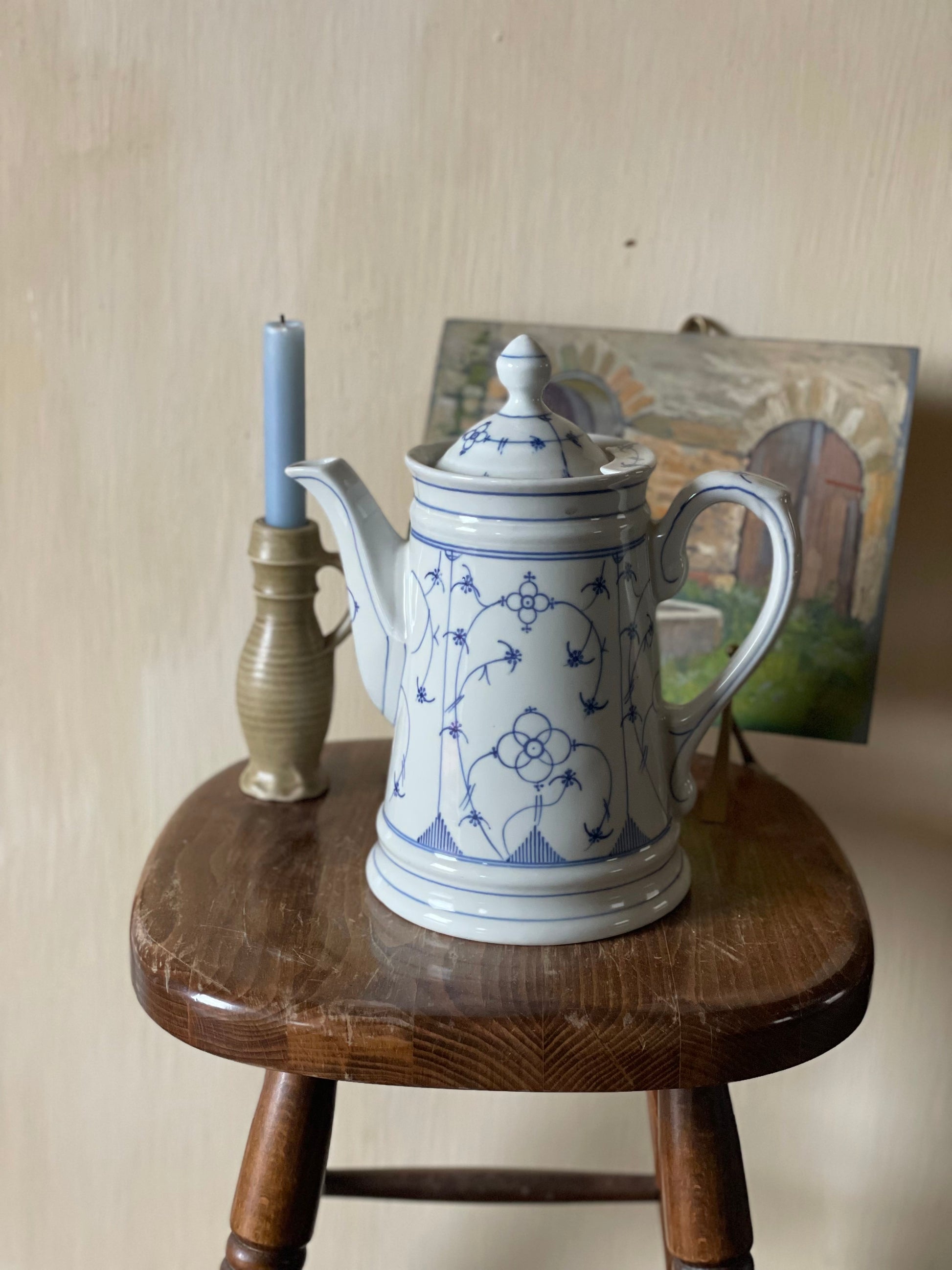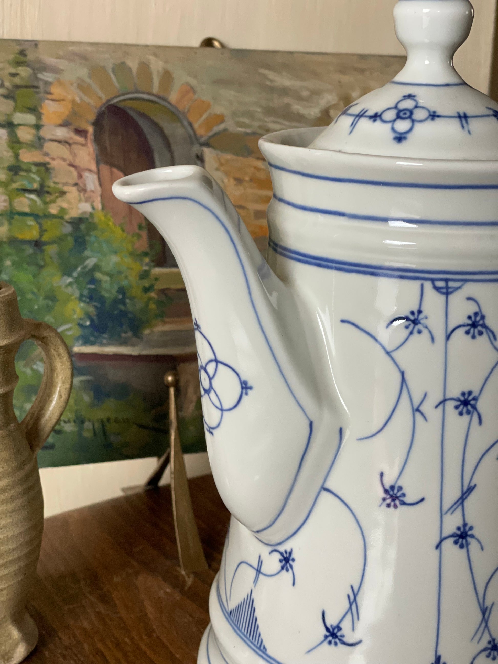 Cafetieră/Ceainic vintage albastru-alb din porțelan, model "Floare de pai".