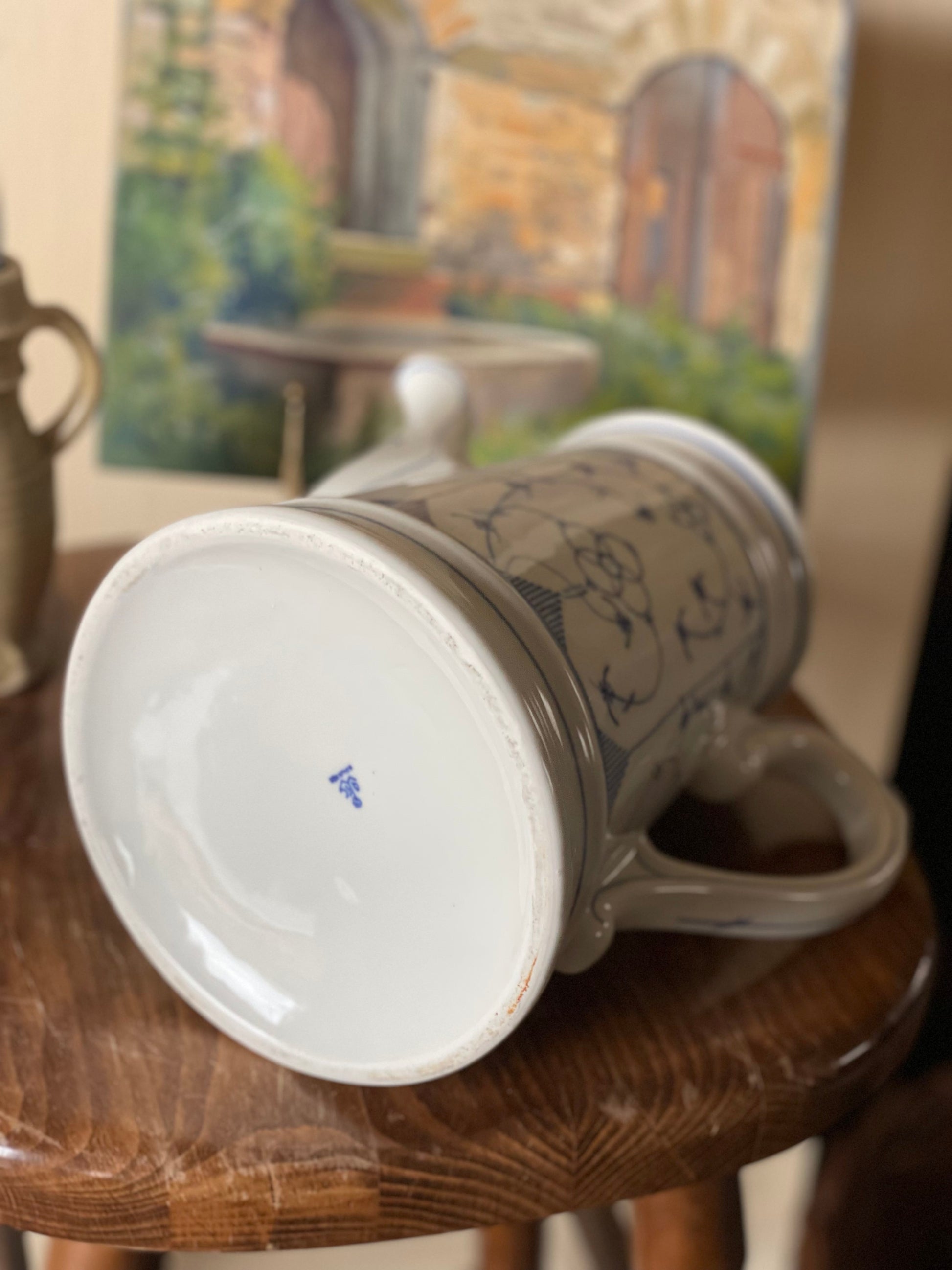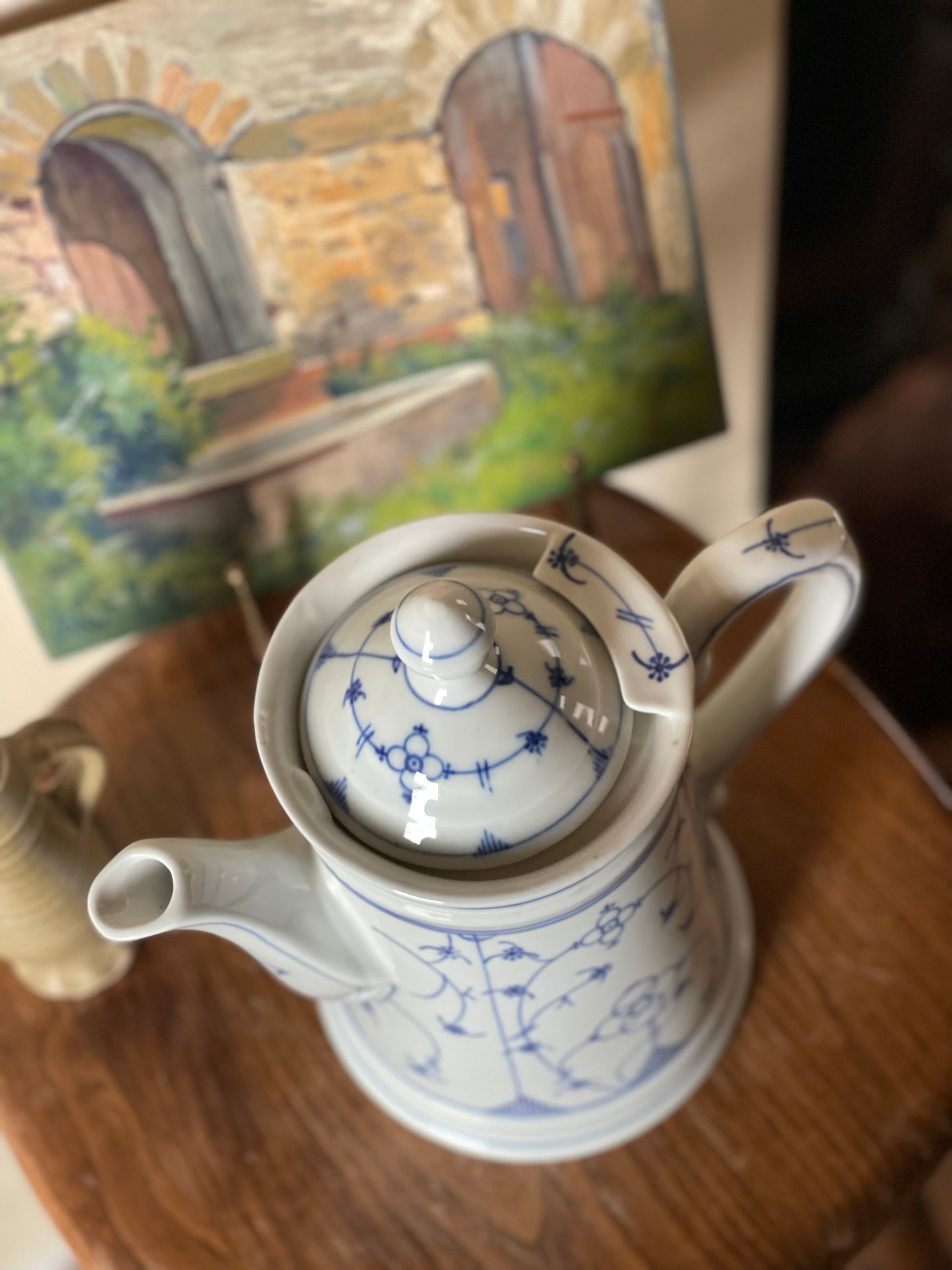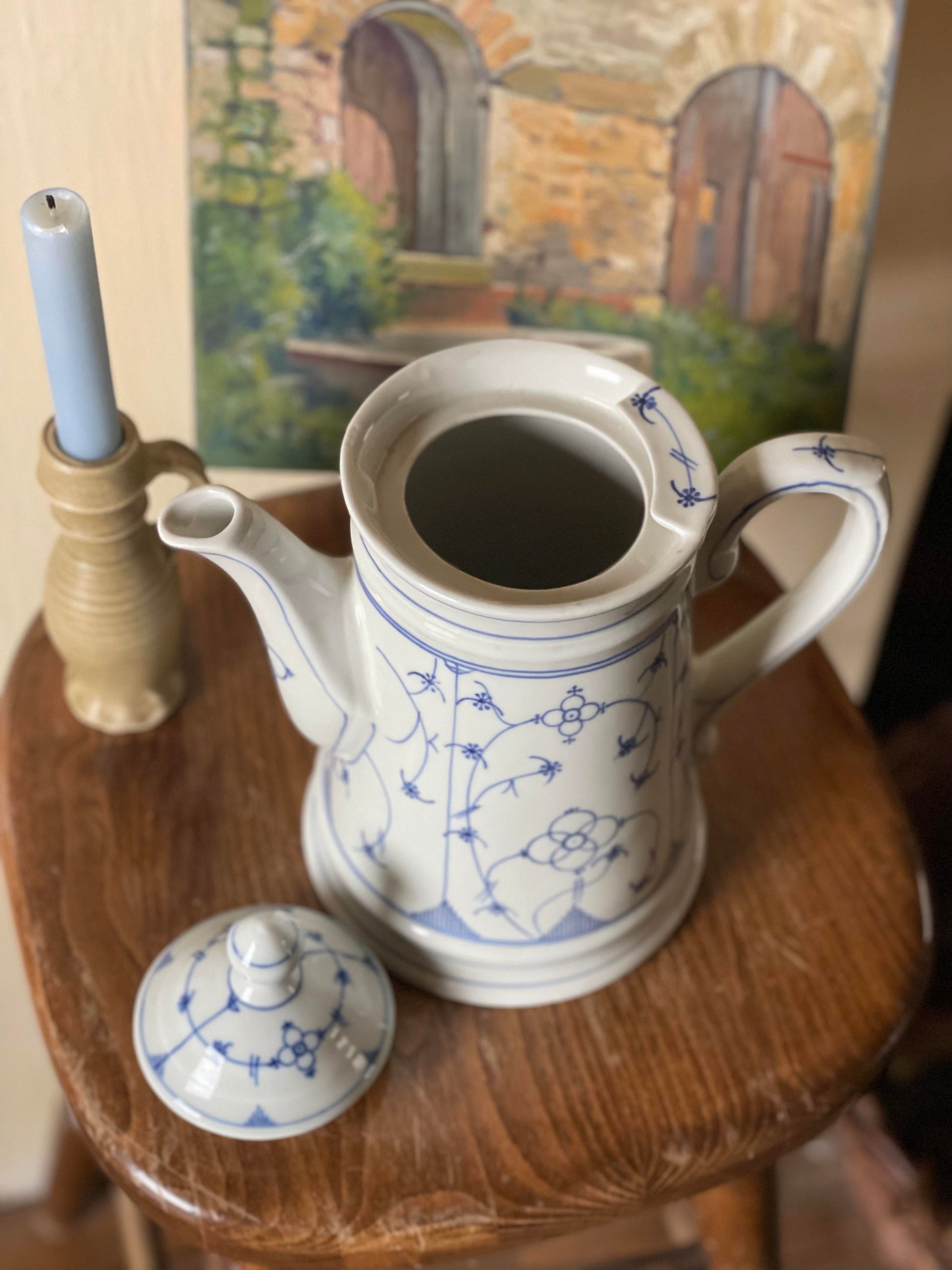 Cafetieră/Ceainic vintage albastru-alb din porțelan, model "Floare de pai".