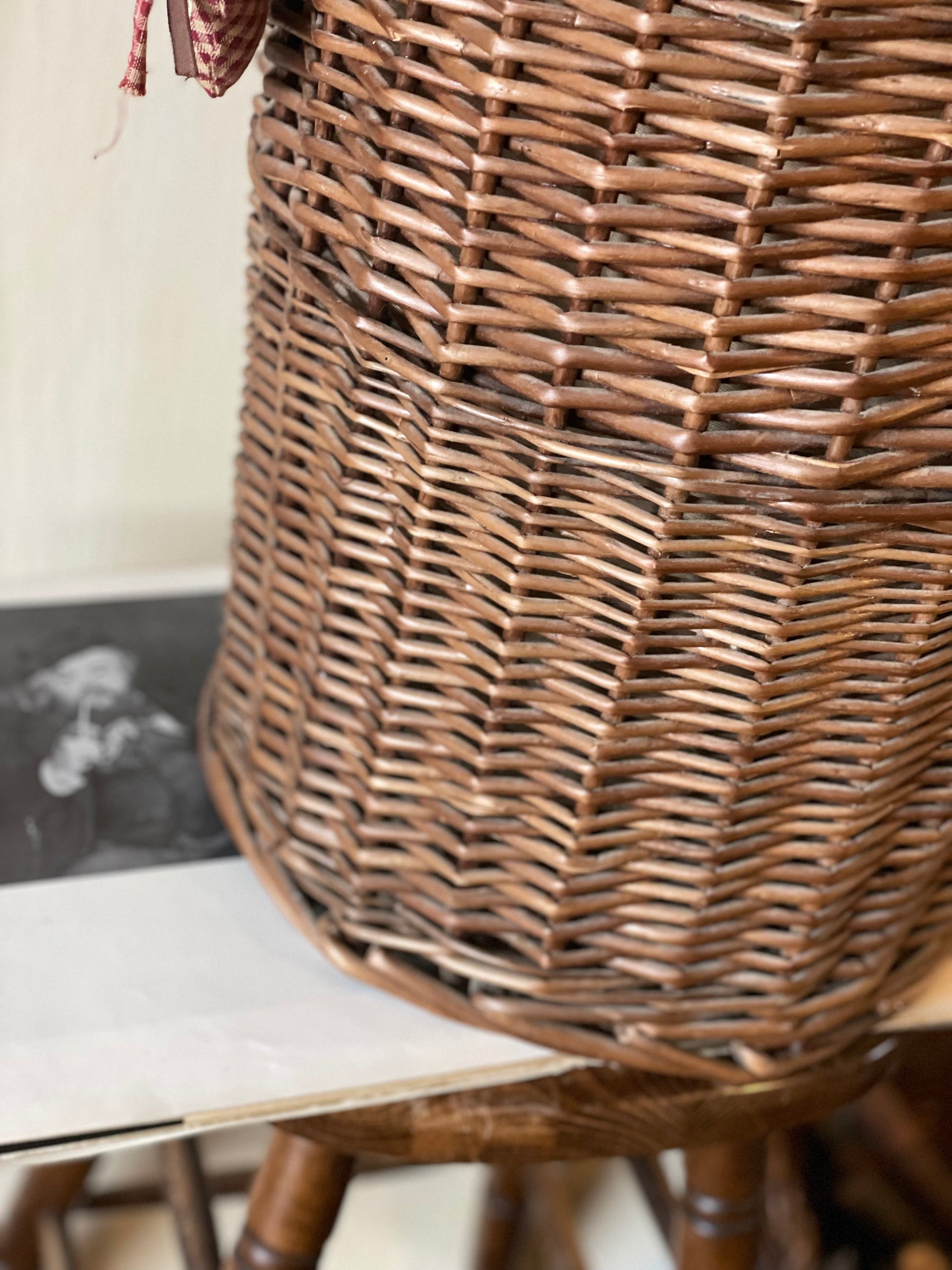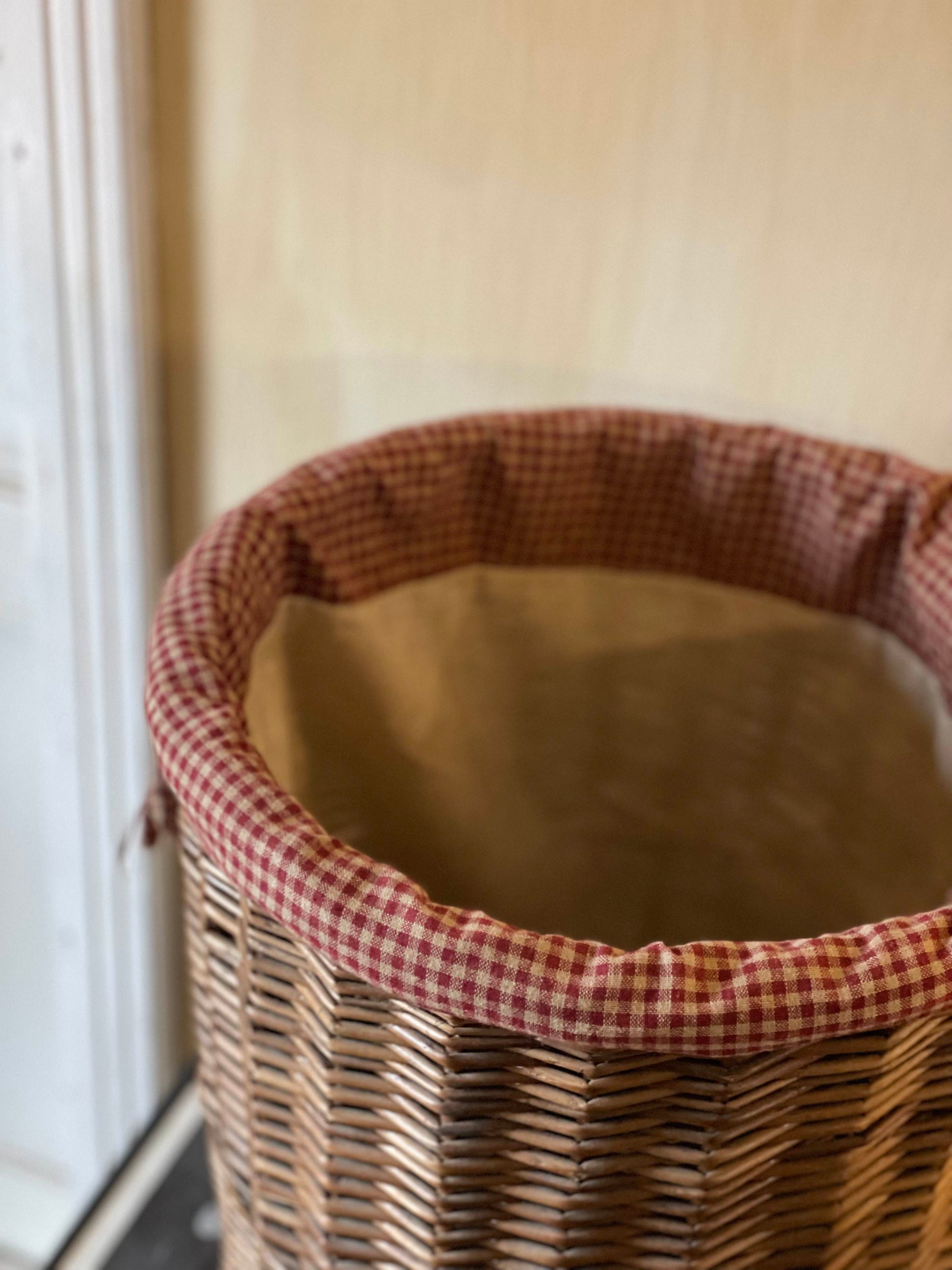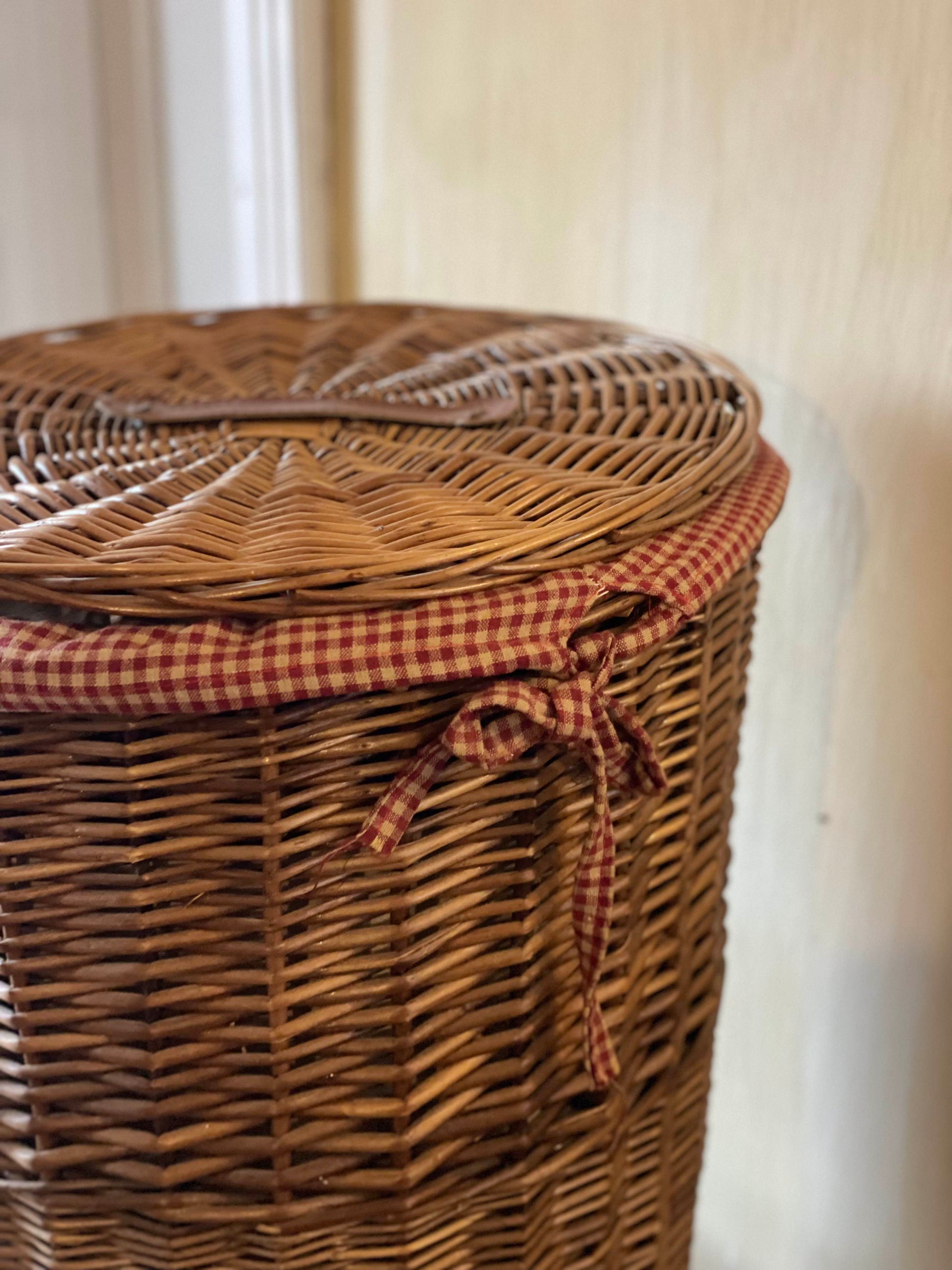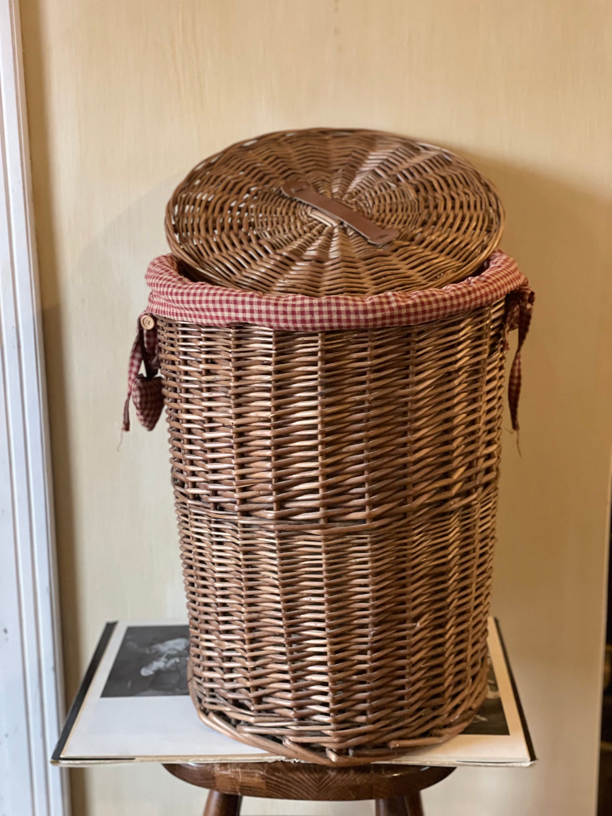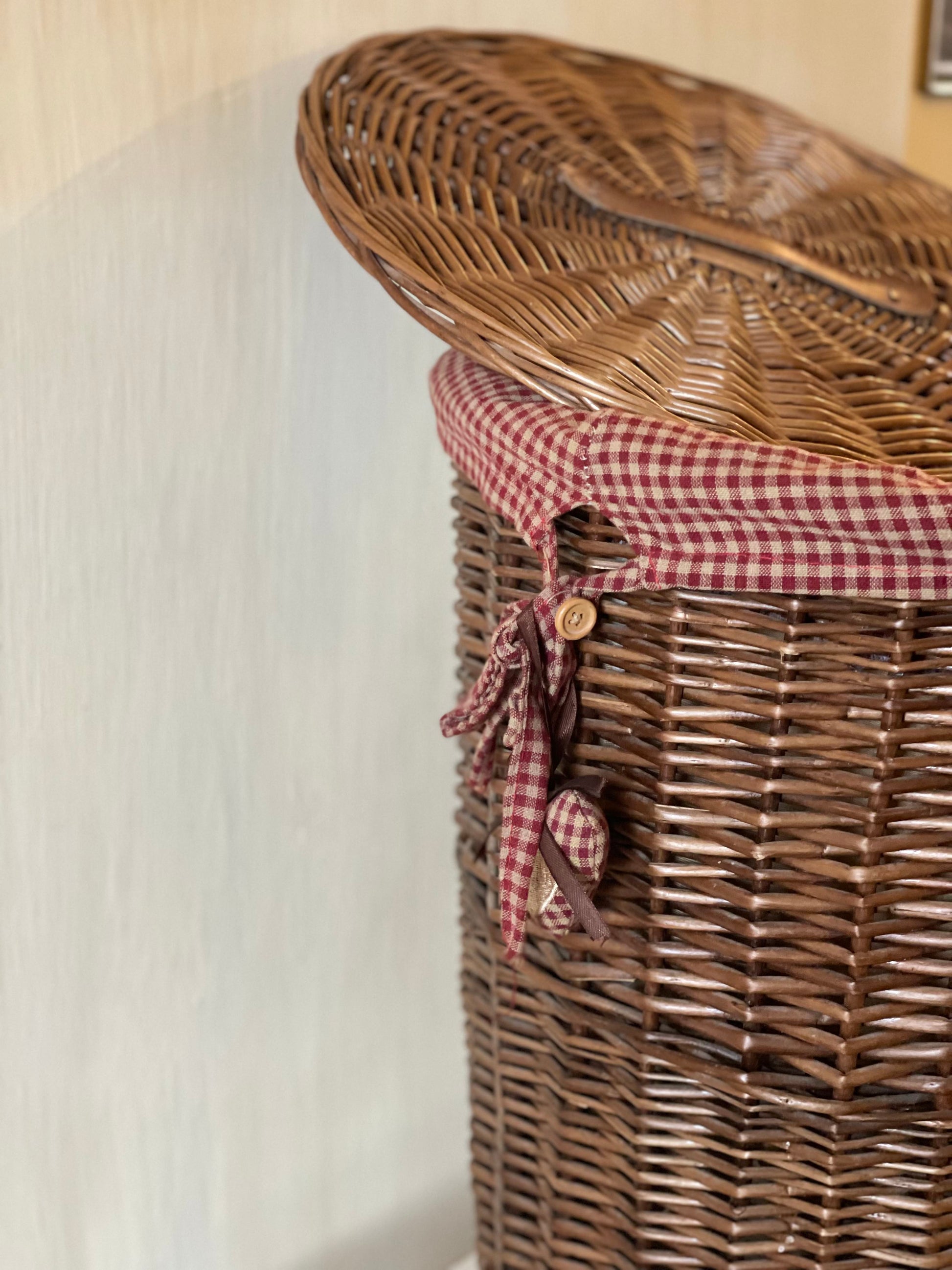 Coș pentru rufe lucrat manual din răchită, vine cu textil din bumbac în interior. Capacul deține mâner.