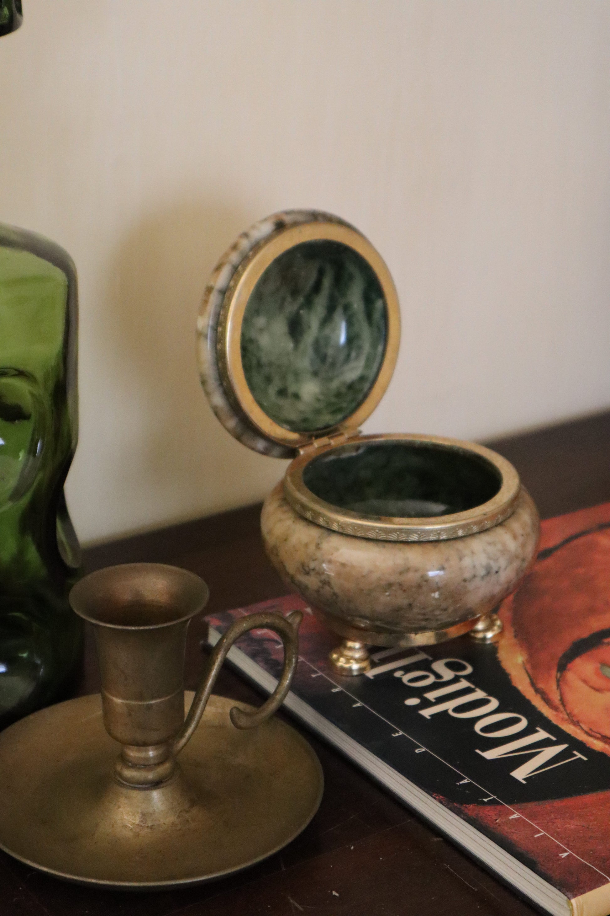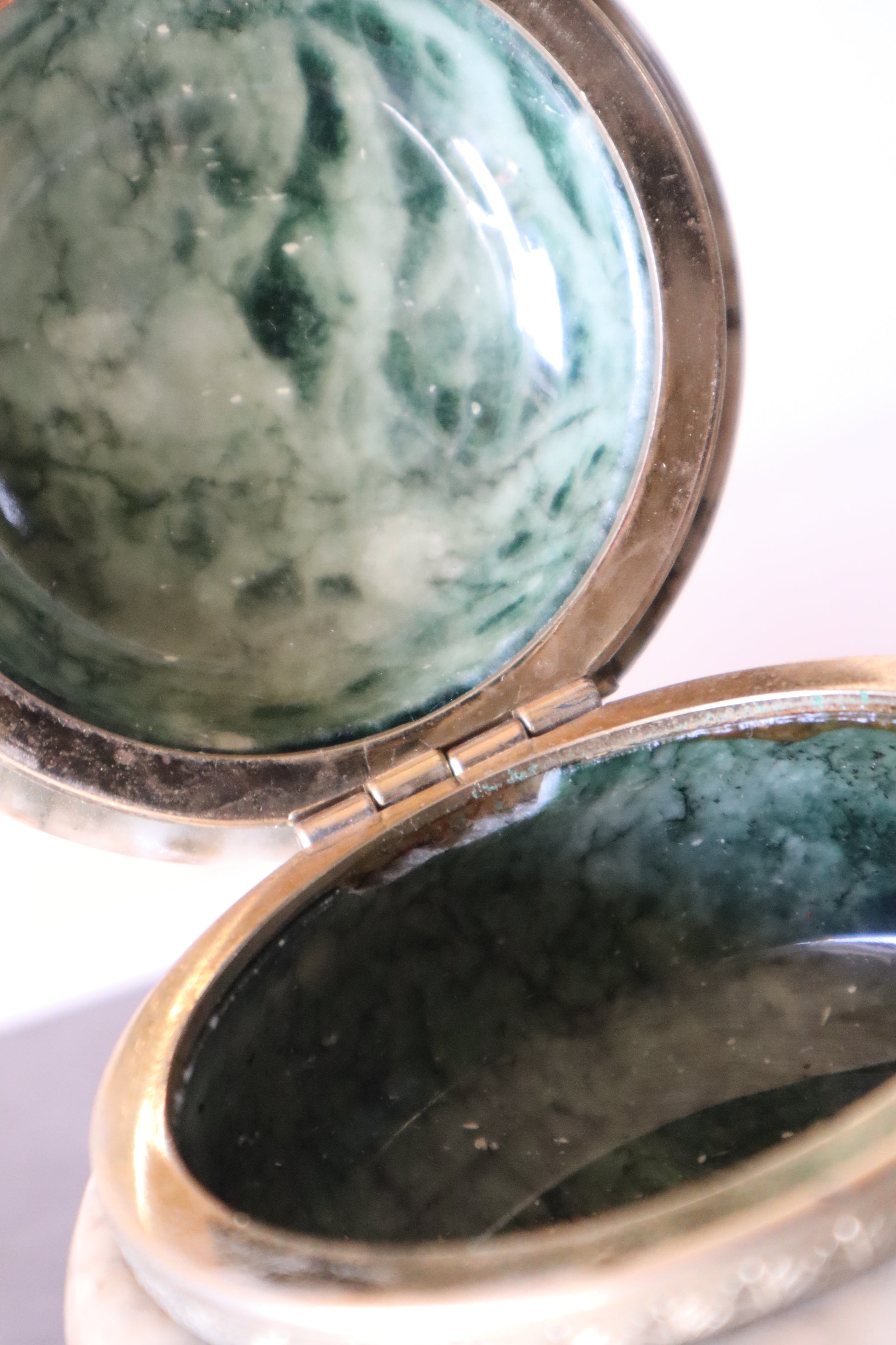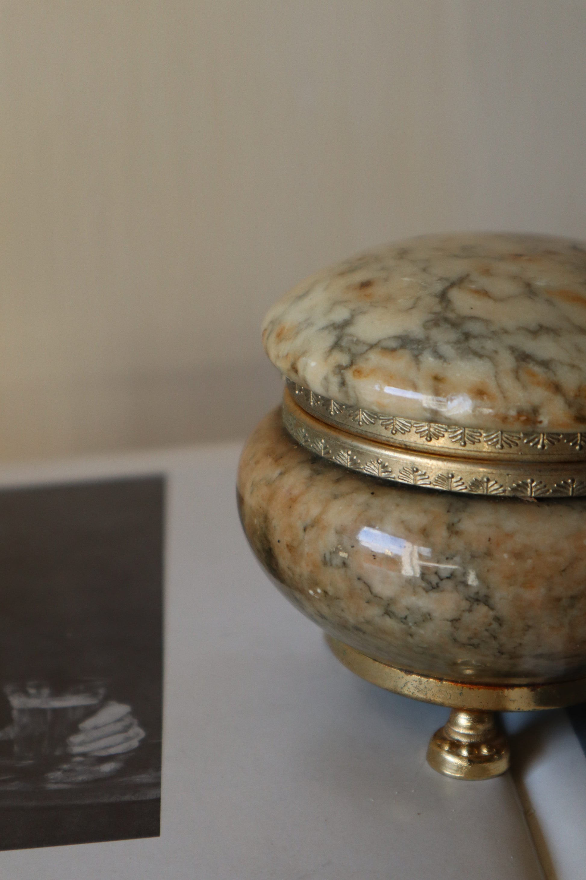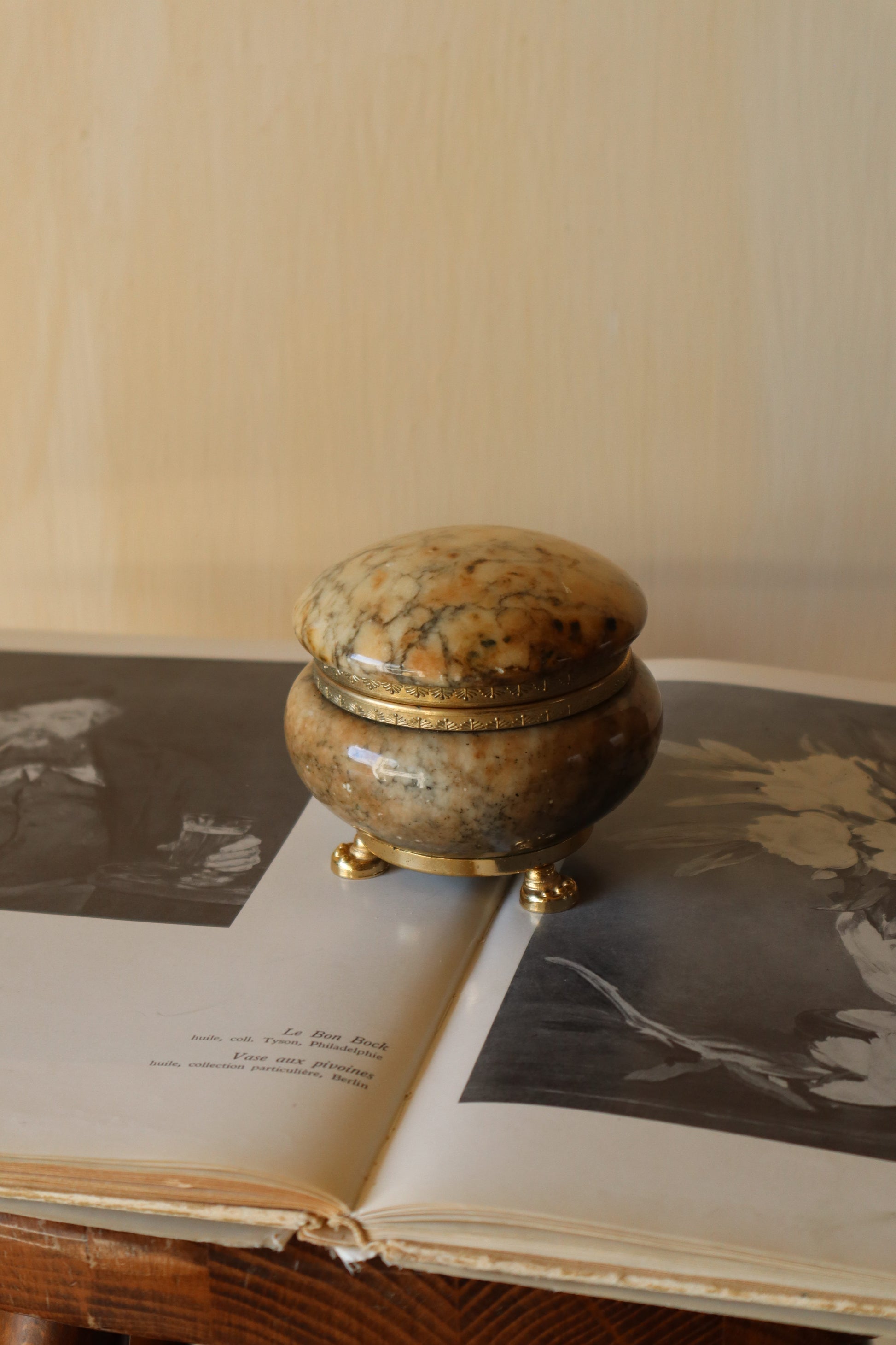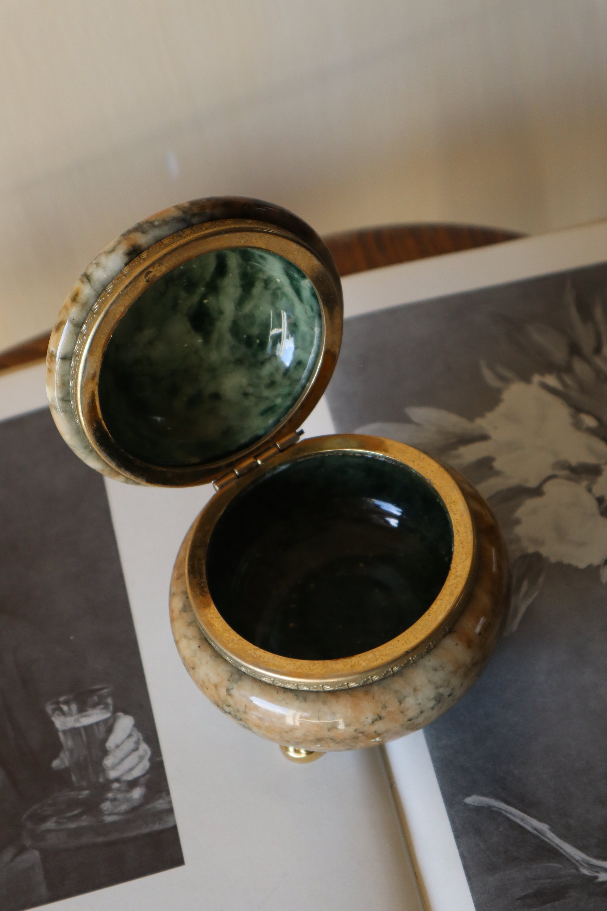 Cutie de bijuterii antică din onix lucrată manual cu capac și 3 picioare tip labă de leu.