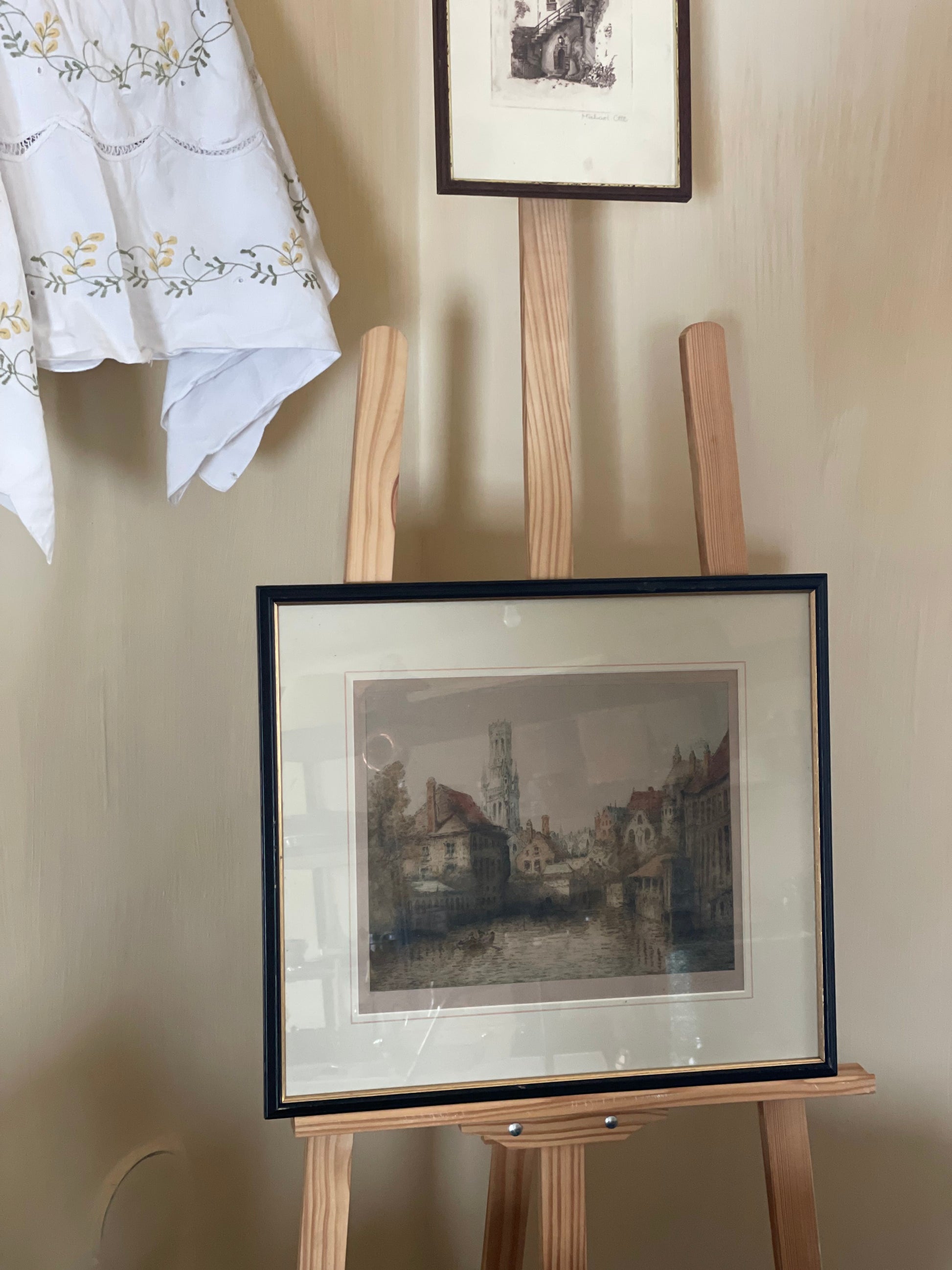 Această gravură autentică prezintă o perspectivă captivantă asupra unui peisaj urban clasic "View of Burgen", încadrată cu eleganță într-o ramă din lemn cu patină.