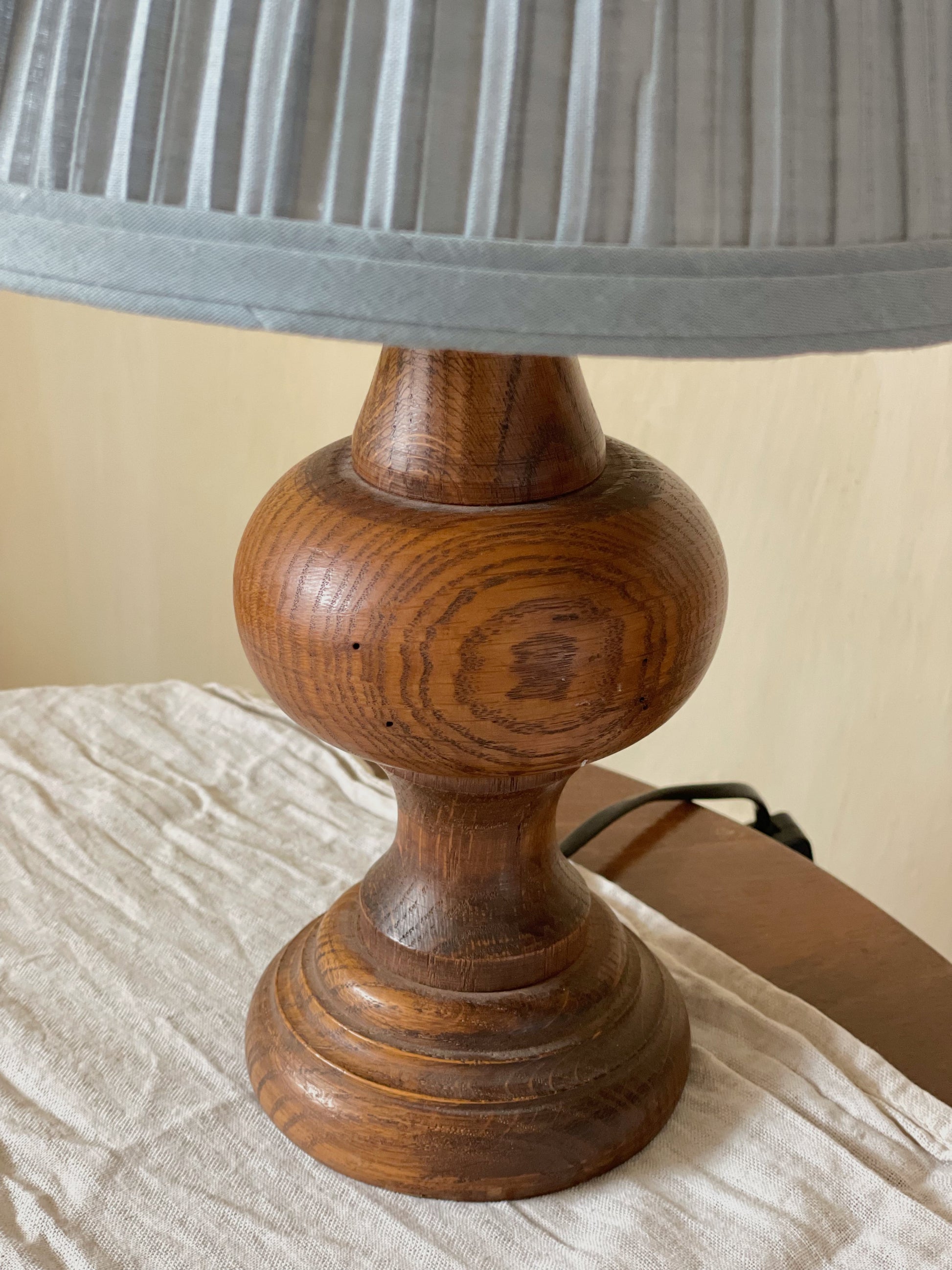 Lampă vintage din lemn masiv, abajur textil din in