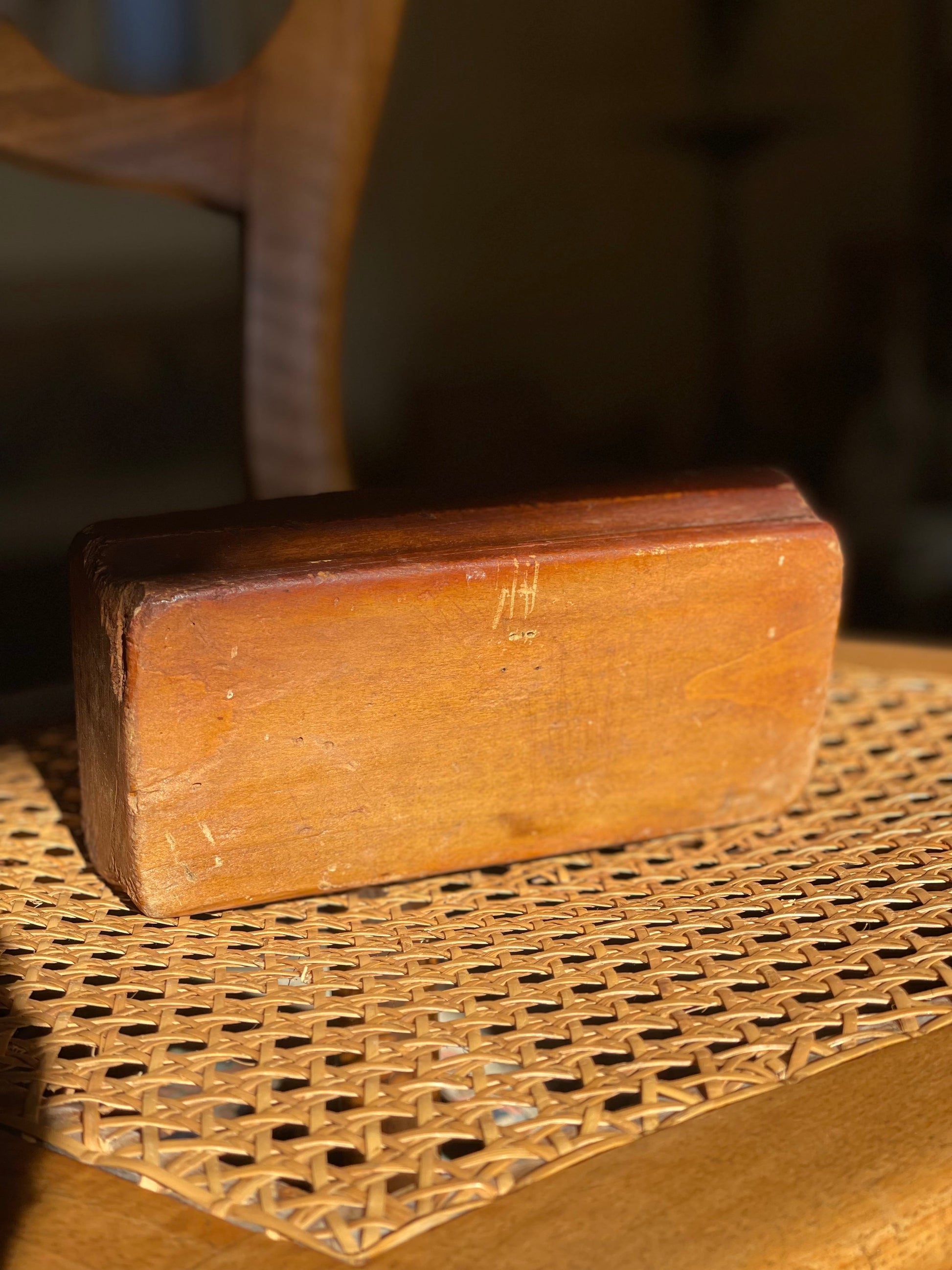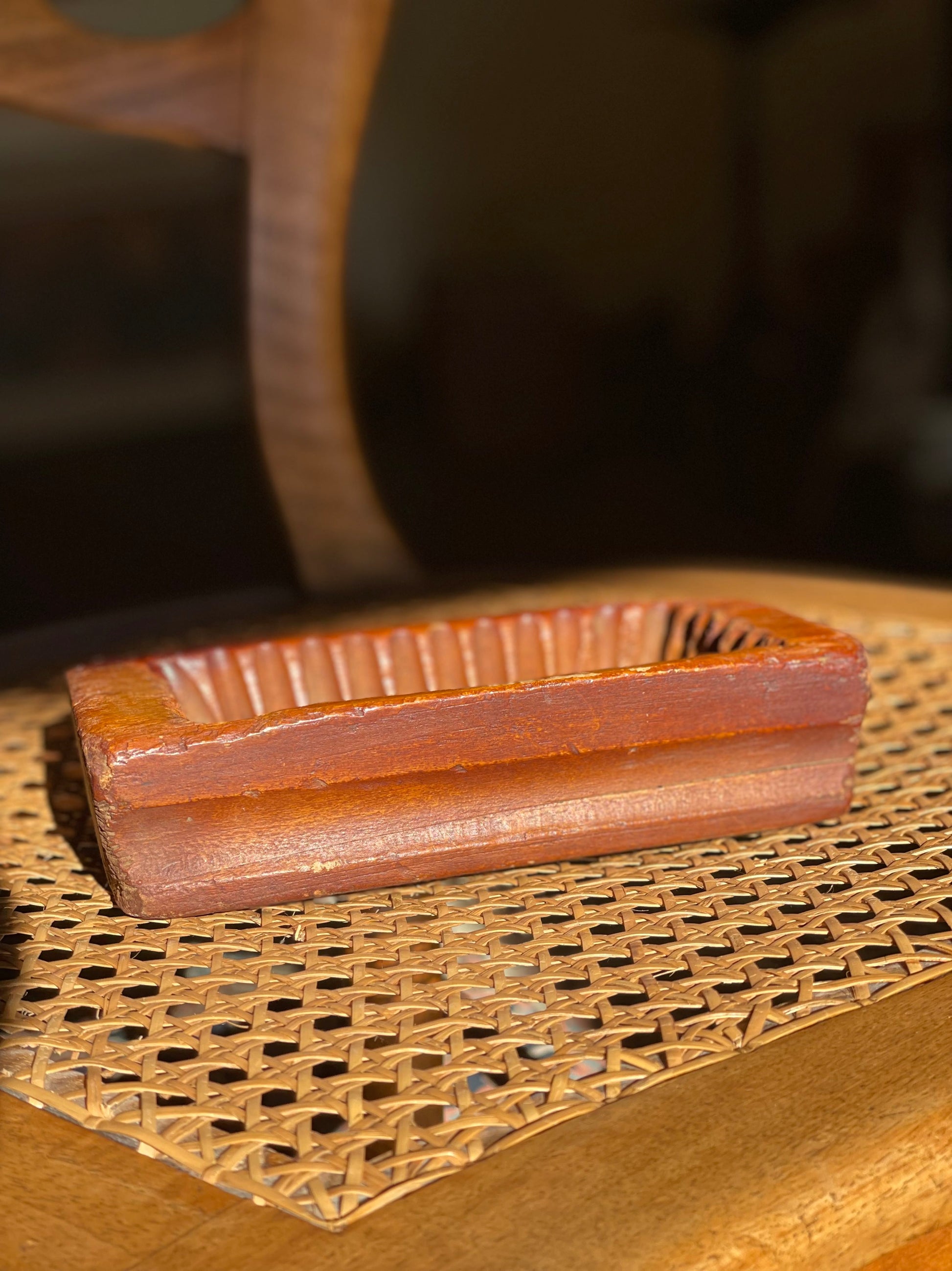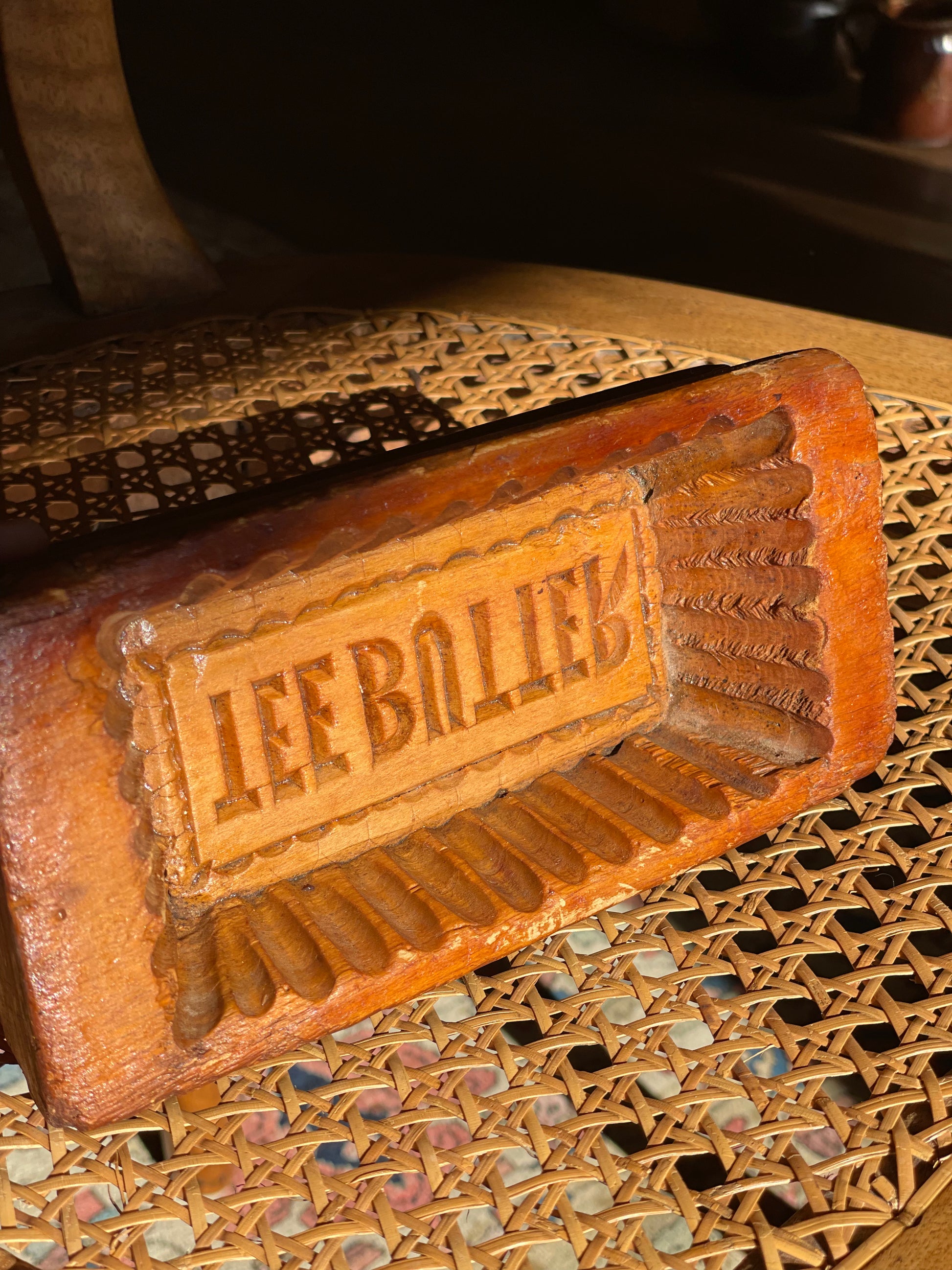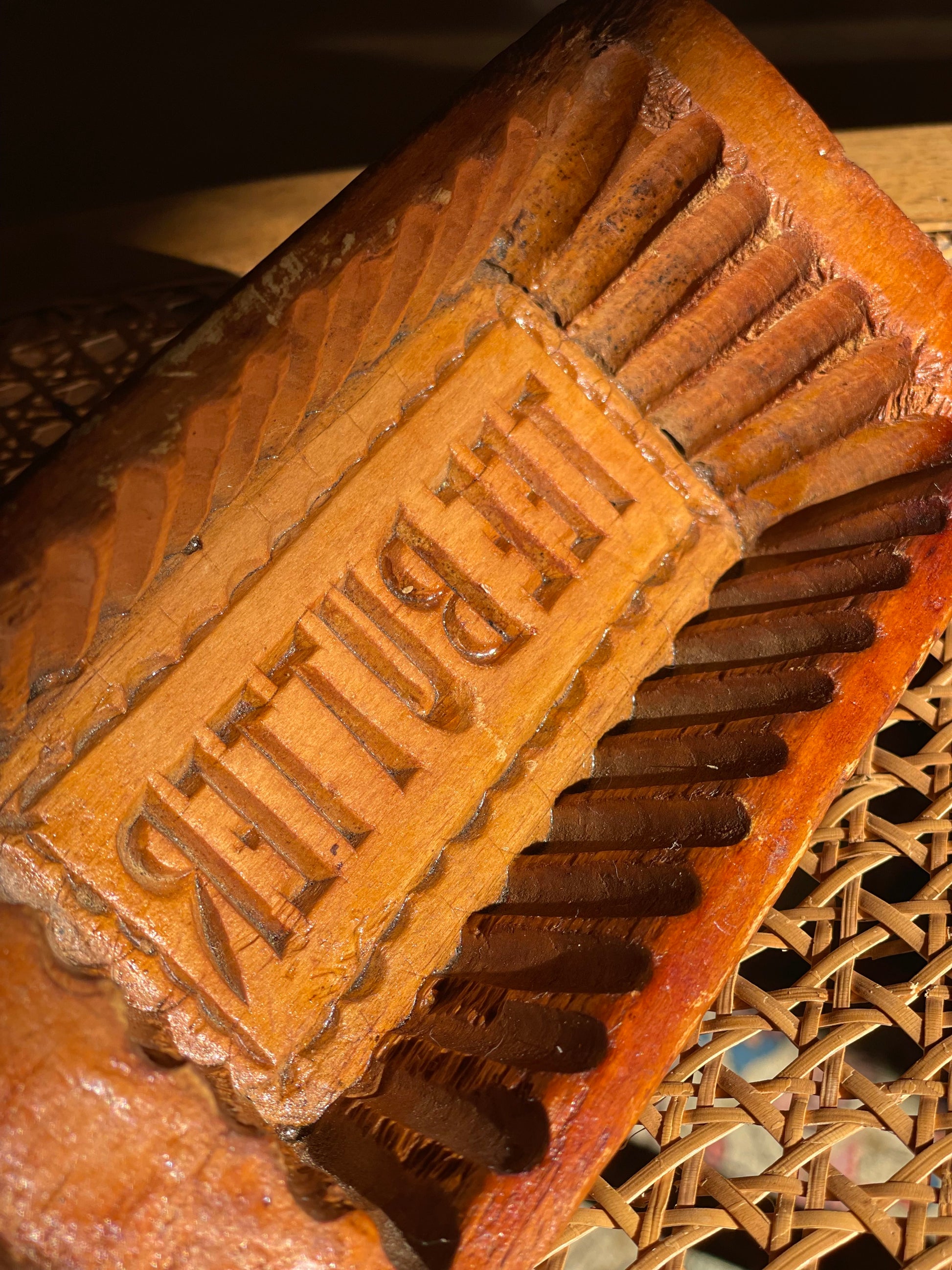 Matriță vintage din lemn gravat TEEBUTTER cu margini ondulate.