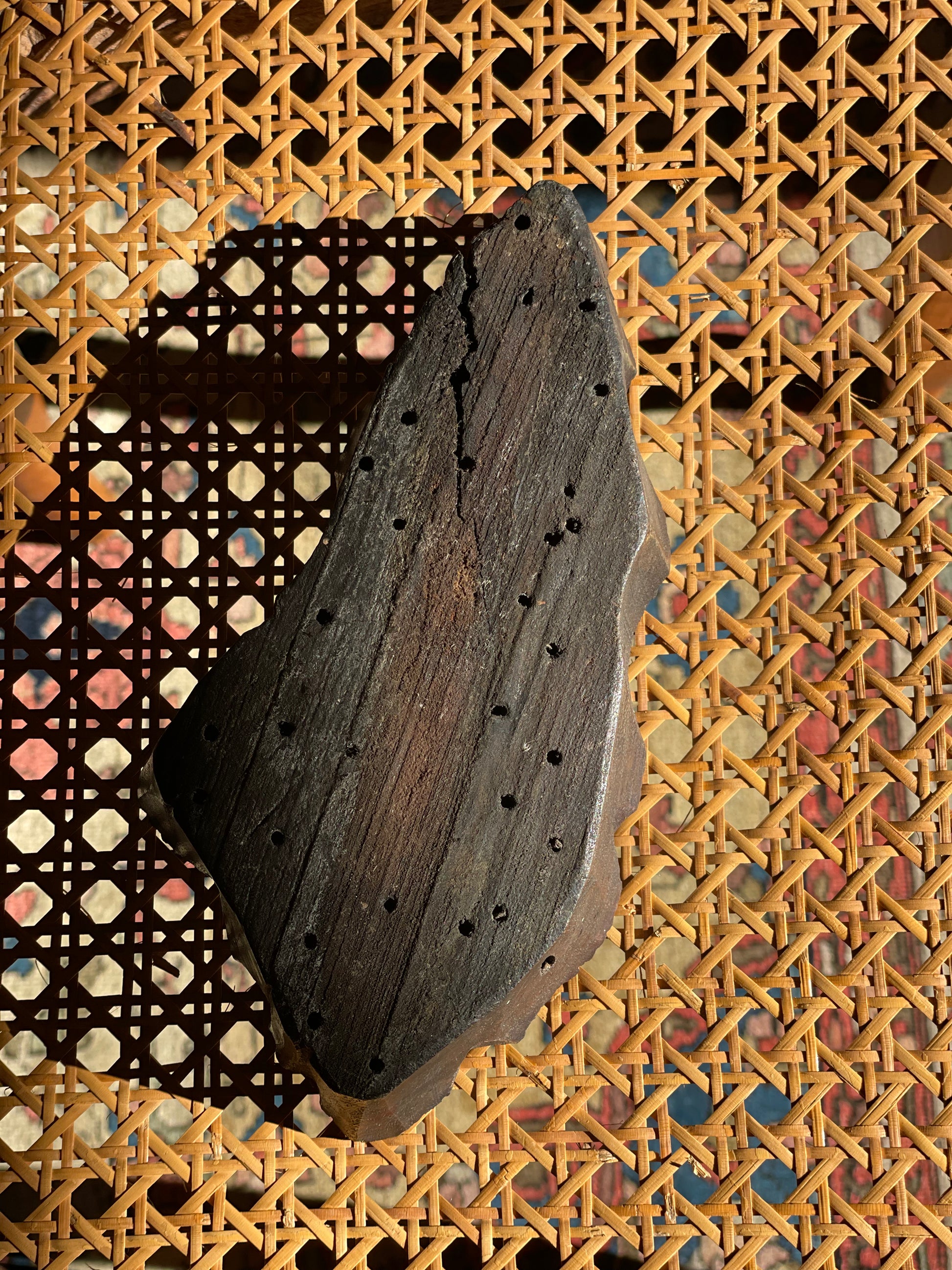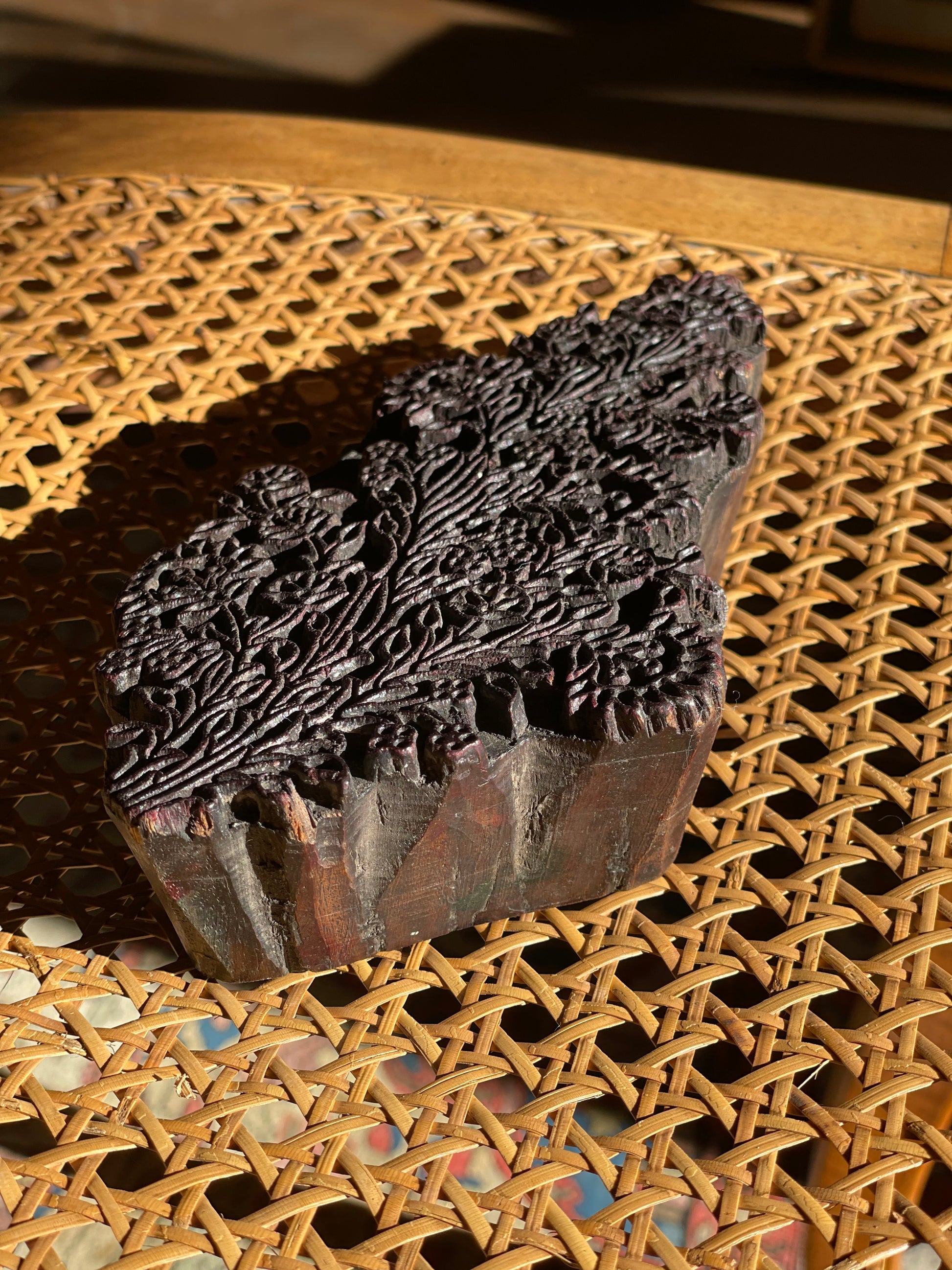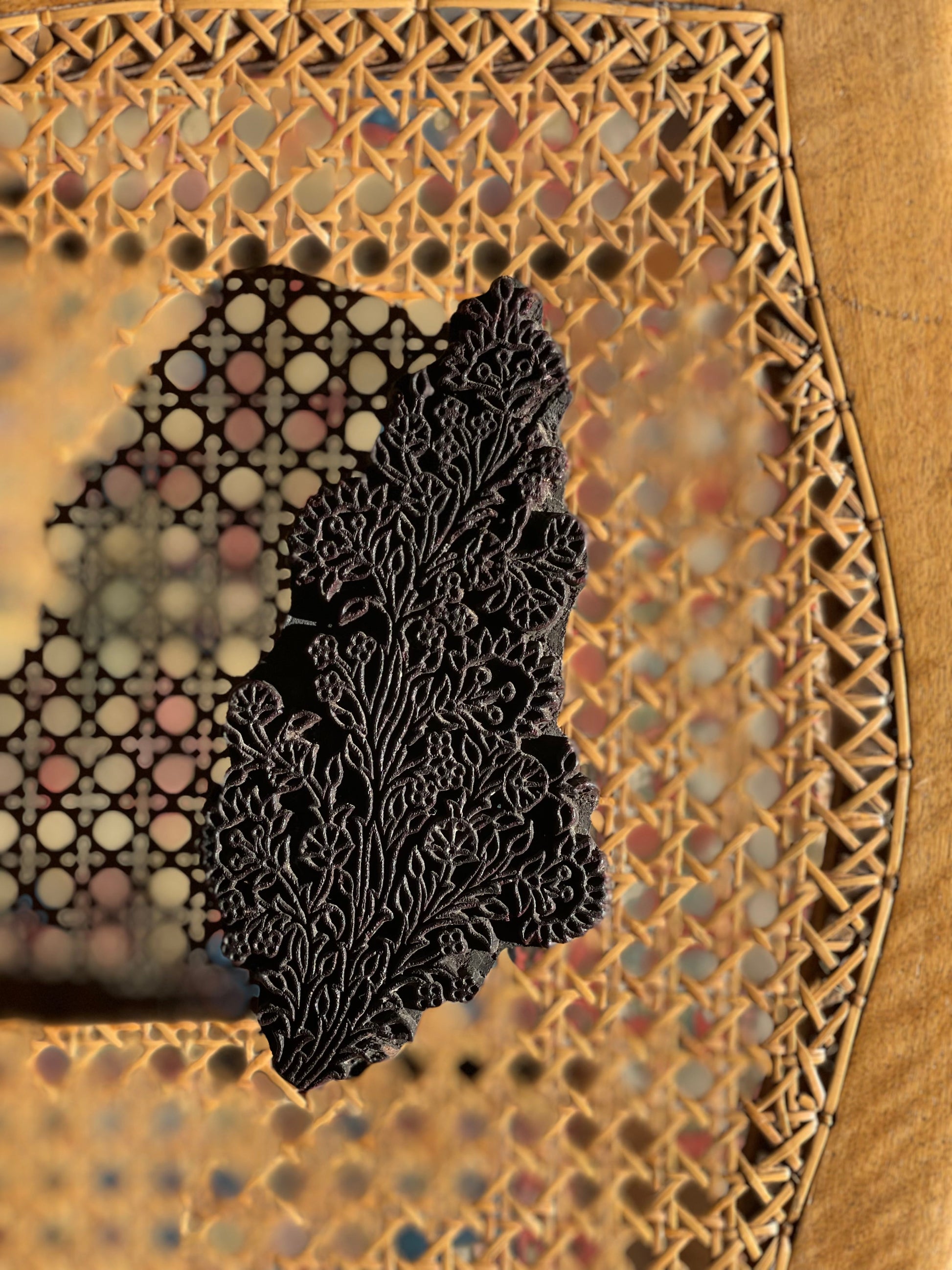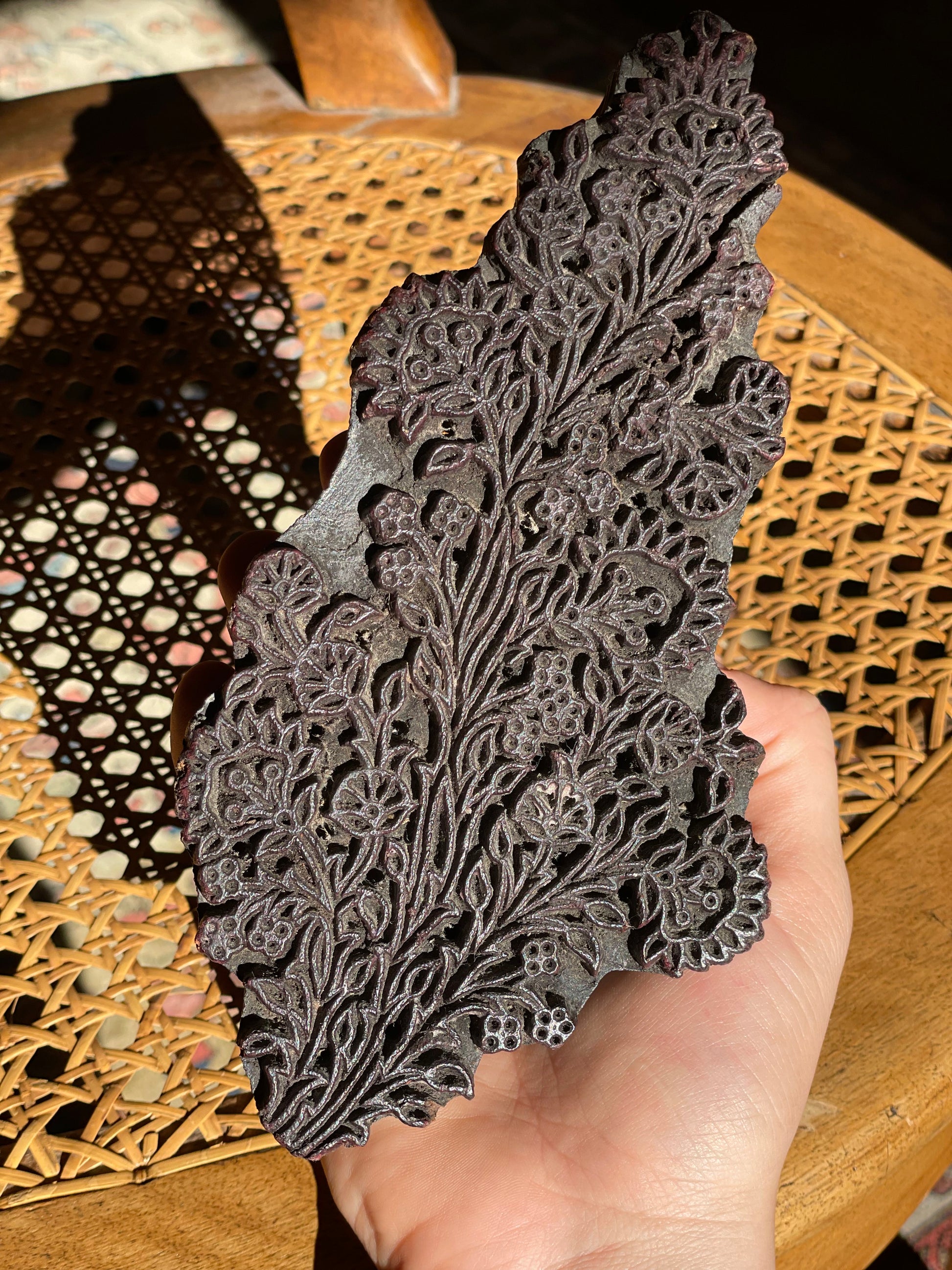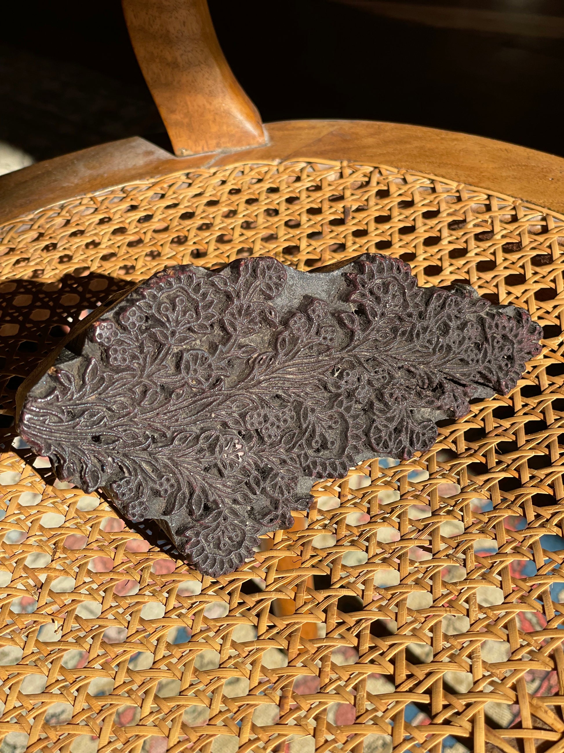 Placă/matriță veche din lemn sculptat manual pentru imprimare textilă-model floral.