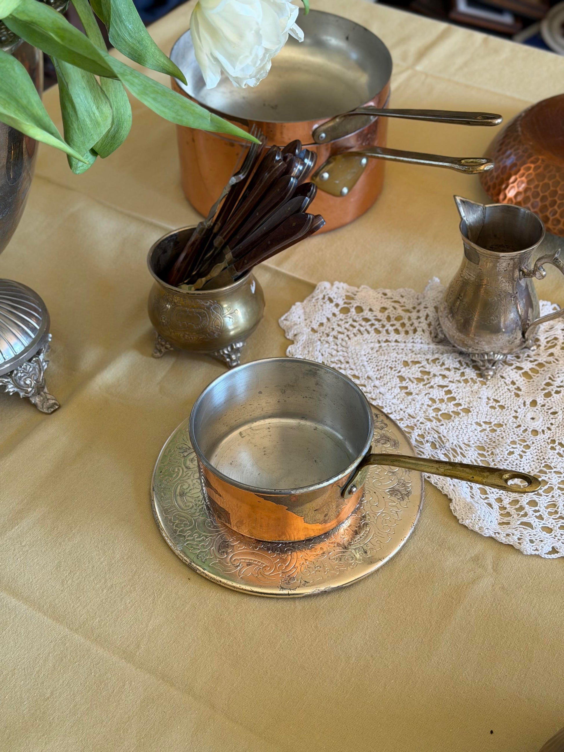 Cratițǎ mini din cupru și alamă, fabricată în Portugalia în anii 1970, perfectă pentru prepararea sosurilor. Design clasic cu mâner ergonomic, ideală pentru colecționari de obiecte vintage sau pentru cei care apreciază bucătăria tradițională. Stare conform pozelor.
