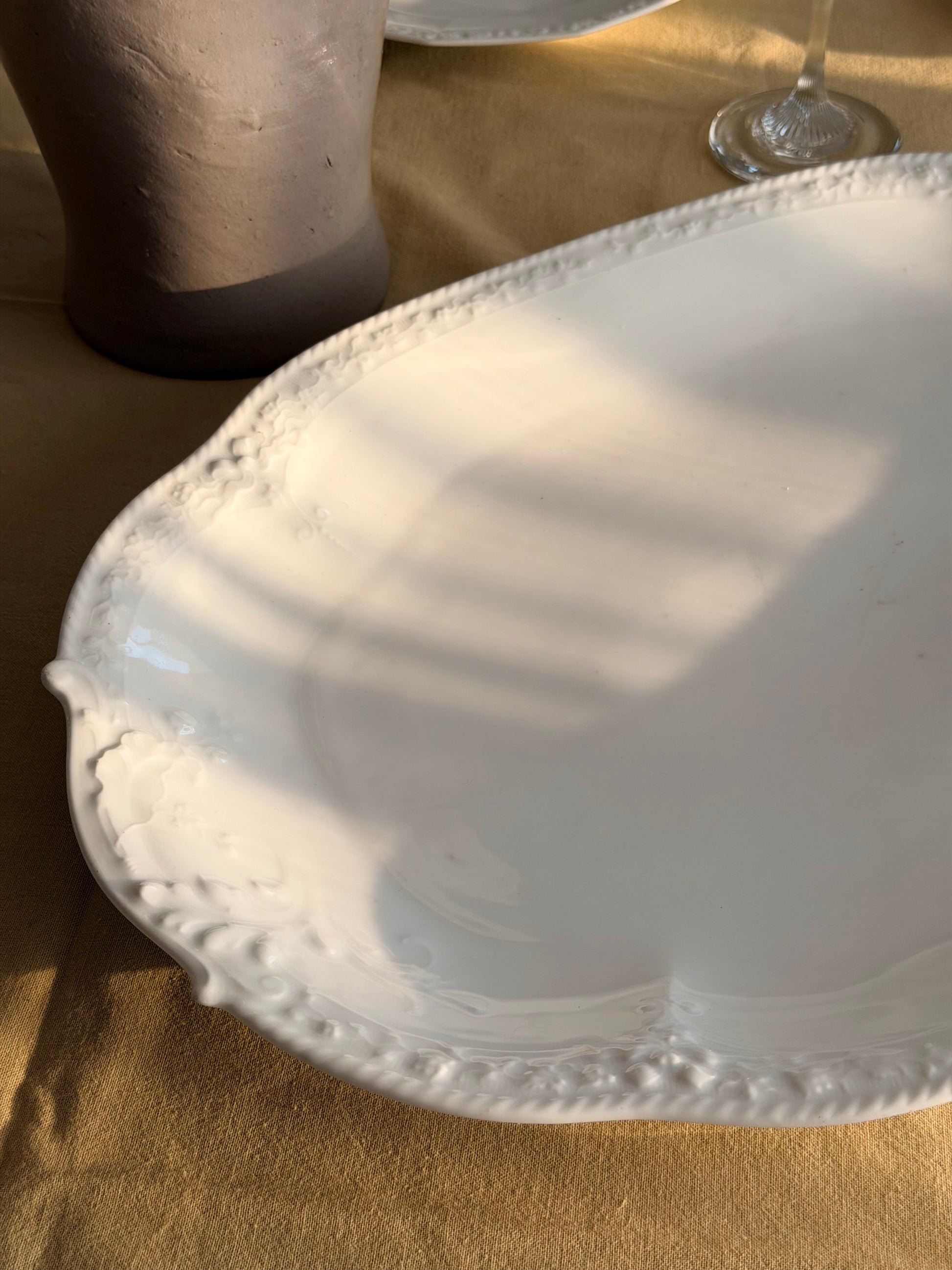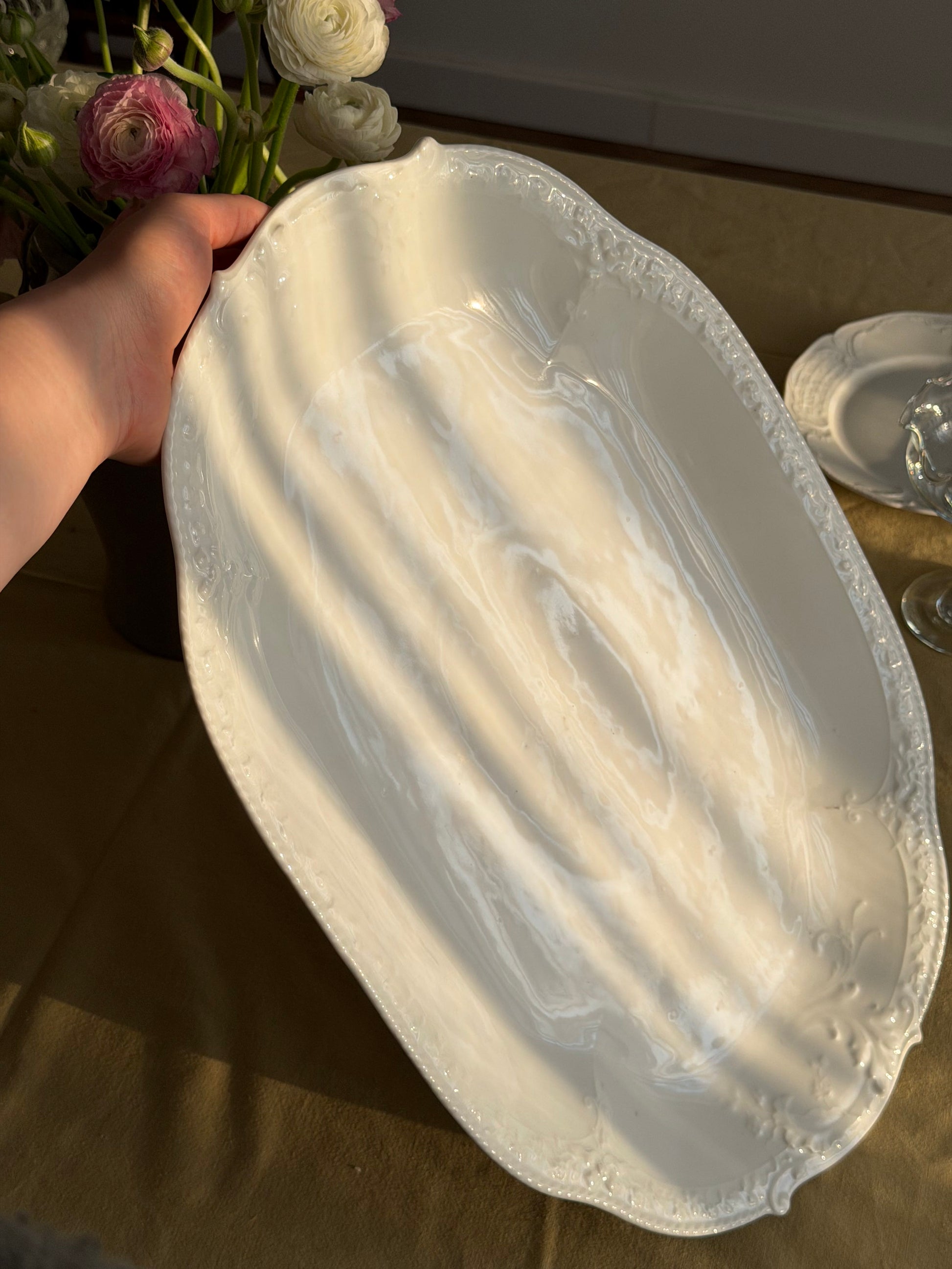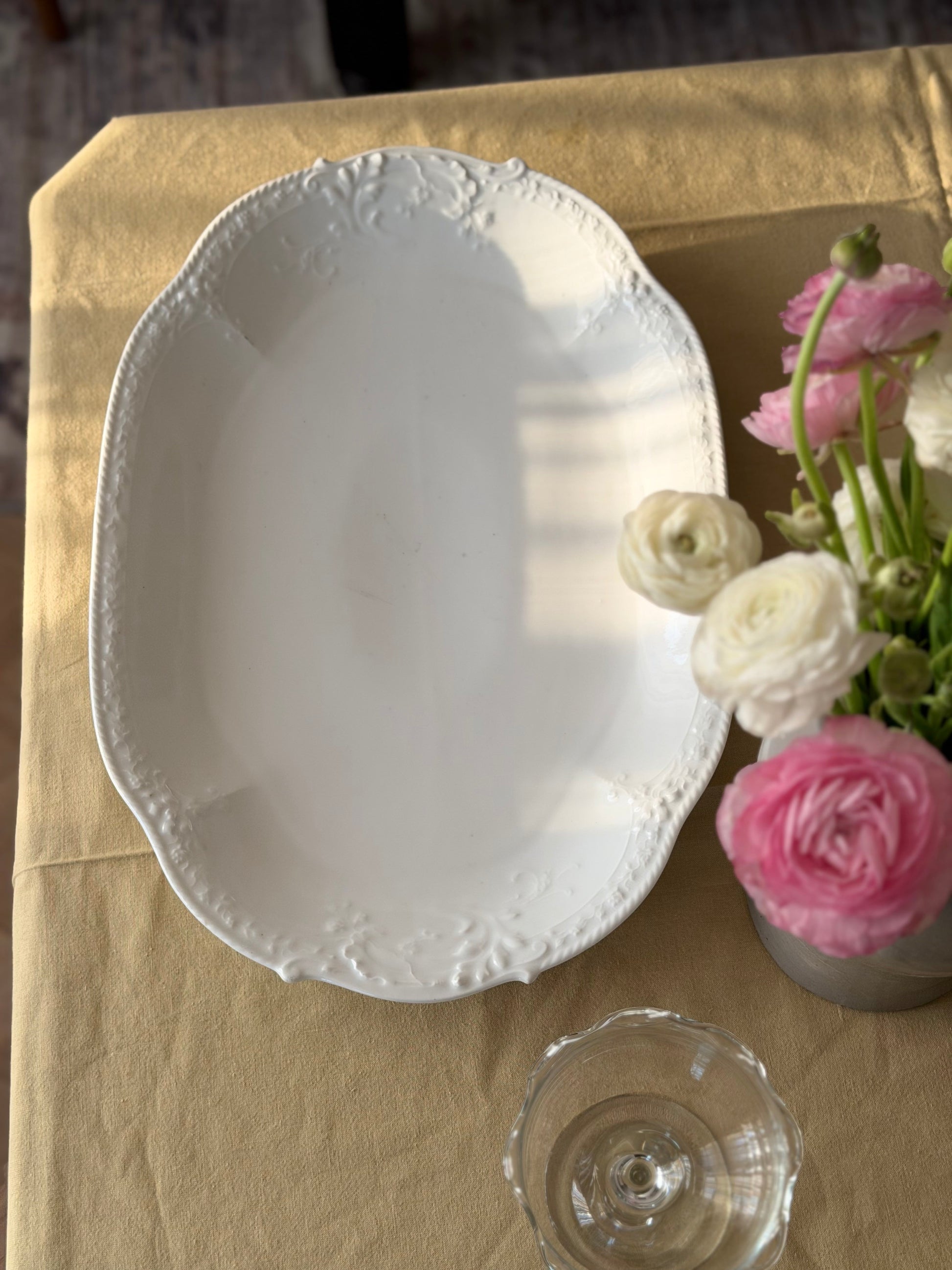 Platou imens din porțelan alb, model floral, perfect pentru mesele numeroase, vara pentru grătare, fripturi sau mesele de sărbători. Suprafață generoasă ideală pentru servirea preparatelor calde sau reci. Design elegant cu detalii florale care adaugă rafinament oricărei mese festive. Ușor de curățat și durabil, potrivit pentru utilizare zilnică sau ocazii speciale.