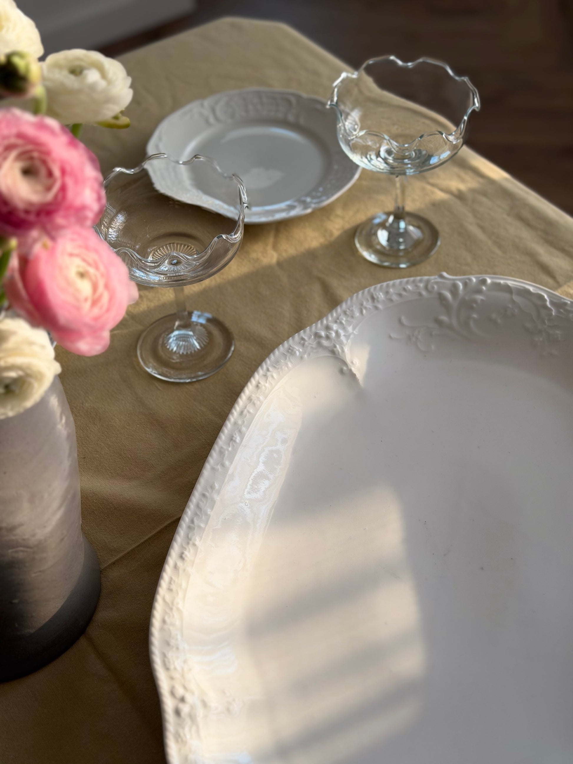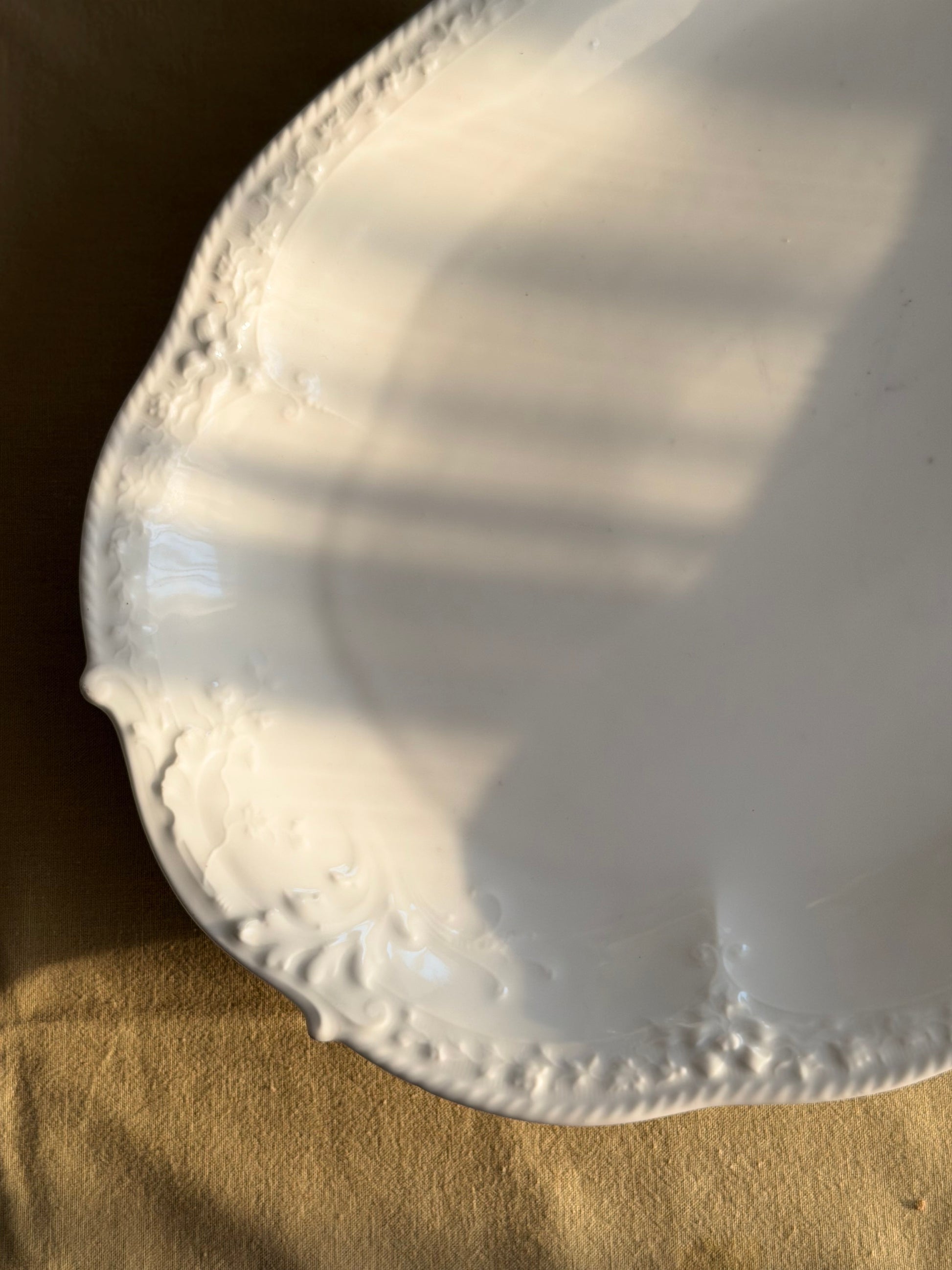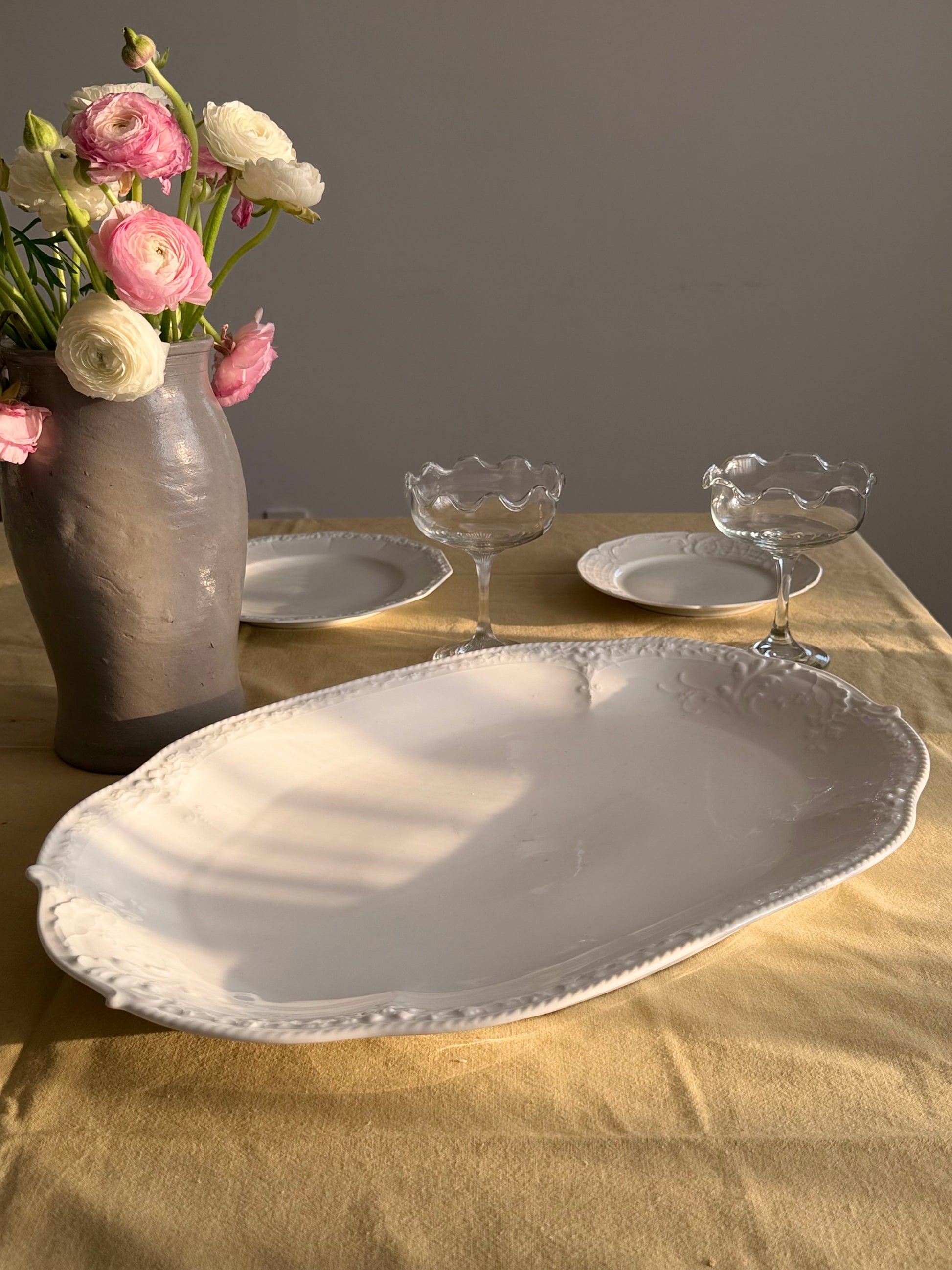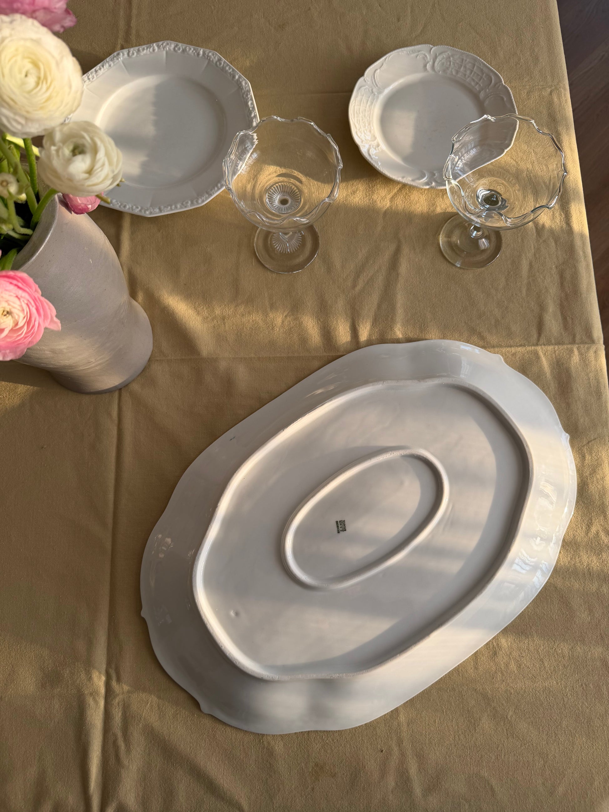 Platou imens din porțelan alb, model floral, perfect pentru mesele numeroase, vara pentru grătare, fripturi sau mesele de sărbători. Suprafață generoasă ideală pentru servirea preparatelor calde sau reci. Design elegant cu detalii florale care adaugă rafinament oricărei mese festive. Ușor de curățat și durabil, potrivit pentru utilizare zilnică sau ocazii speciale.