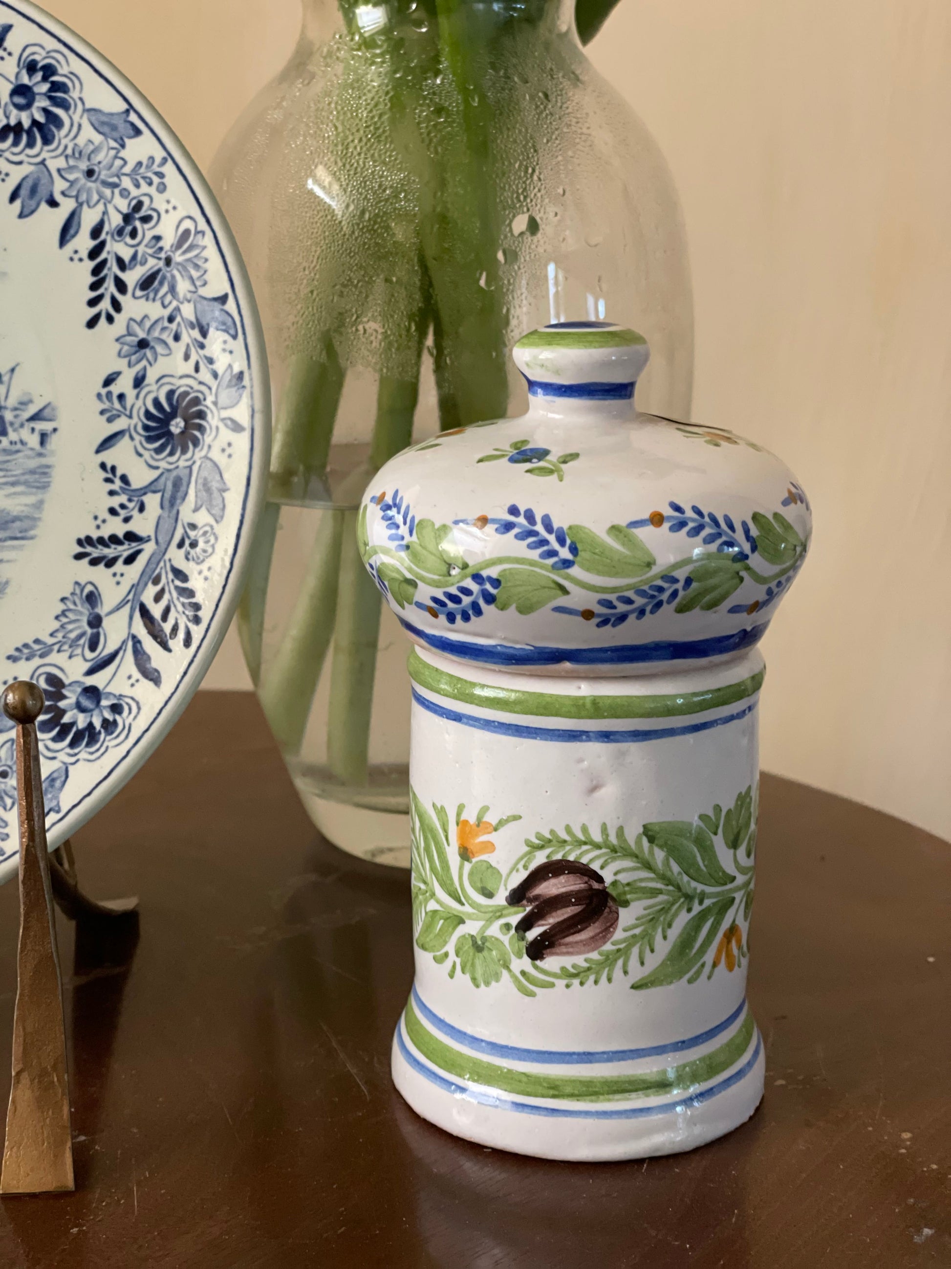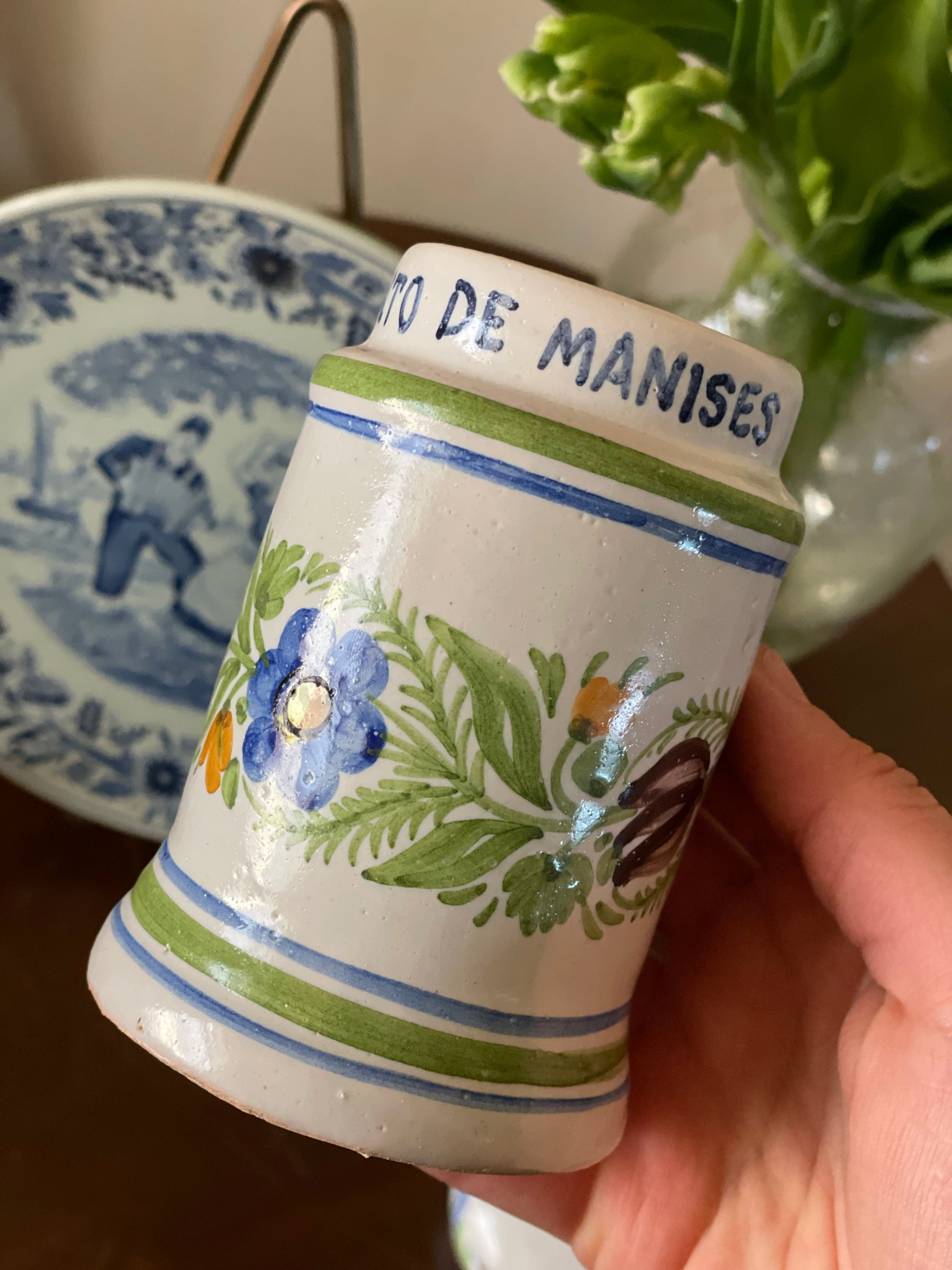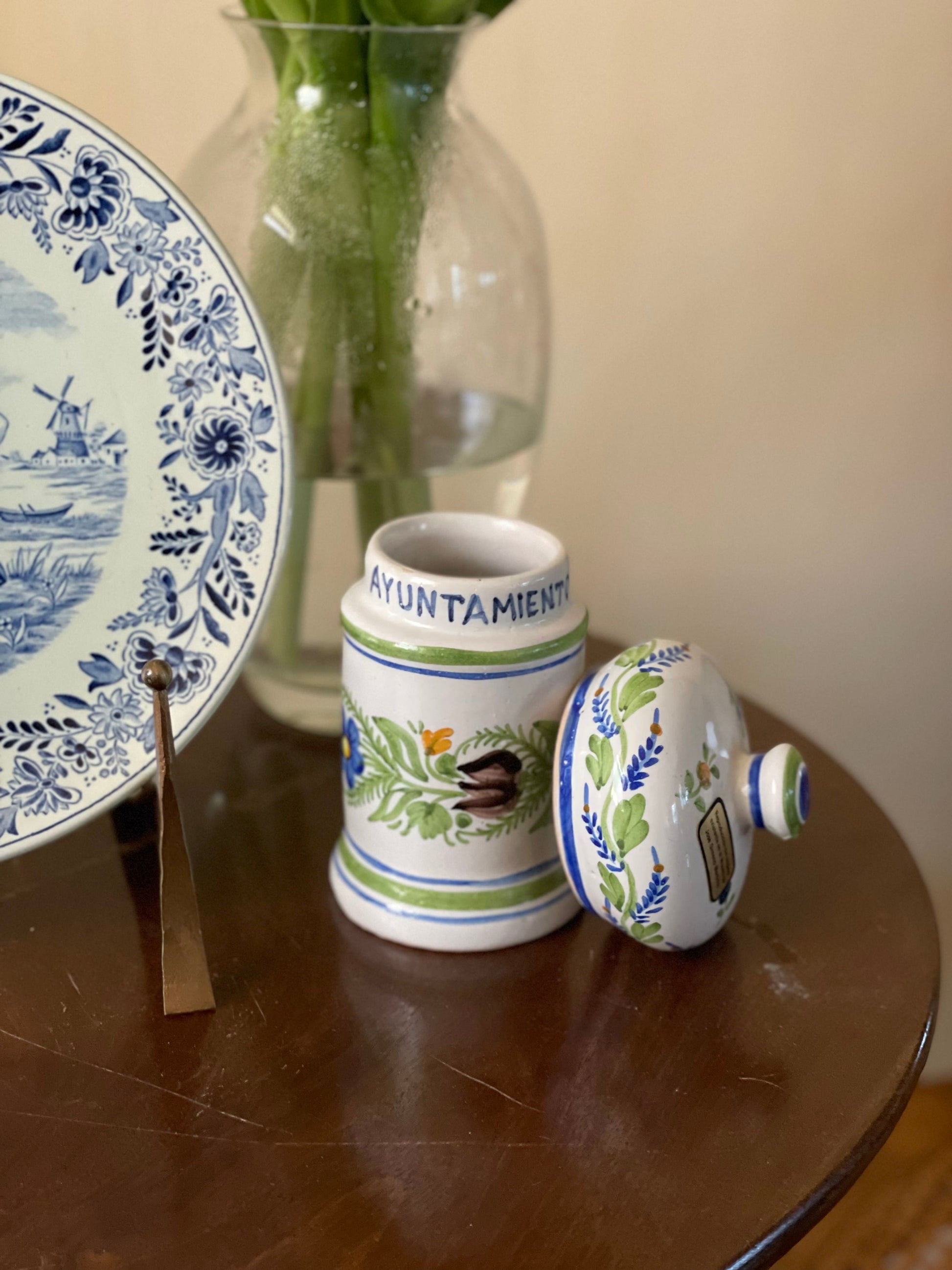 Recipient/Borcan din ceramică antică din Manises, artizanal cu capac, confecționat prin tehnici tradiționale și decorat cu motive florale pictate manual. Realizat din ceramică de înaltă calitate, acest recipient se distinge prin finisajul rafinat și durabilitate. Ideal pentru păstrarea condimentelor, mierii, zahărului sau altor ingrediente.