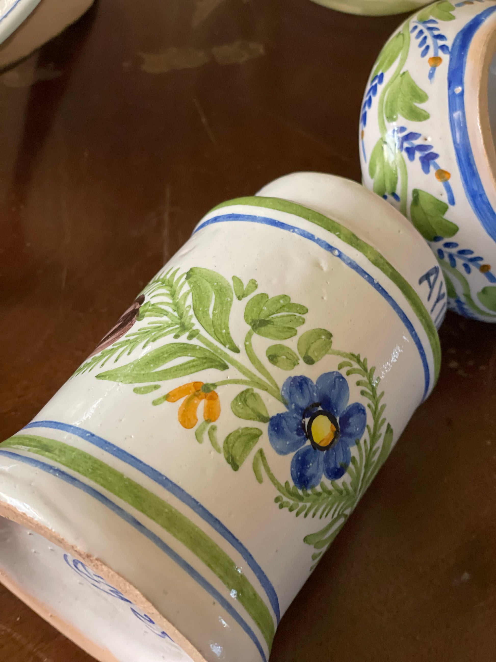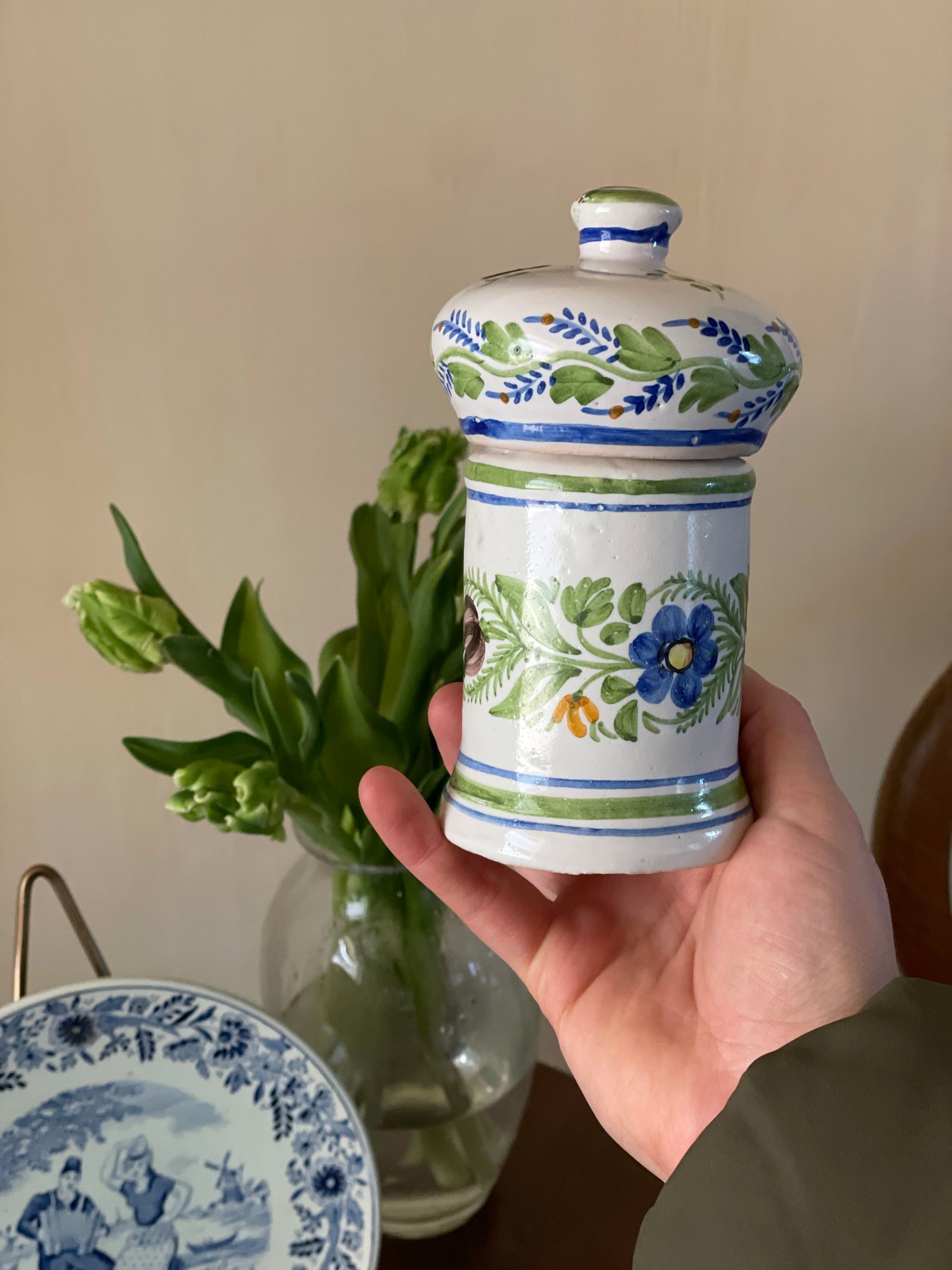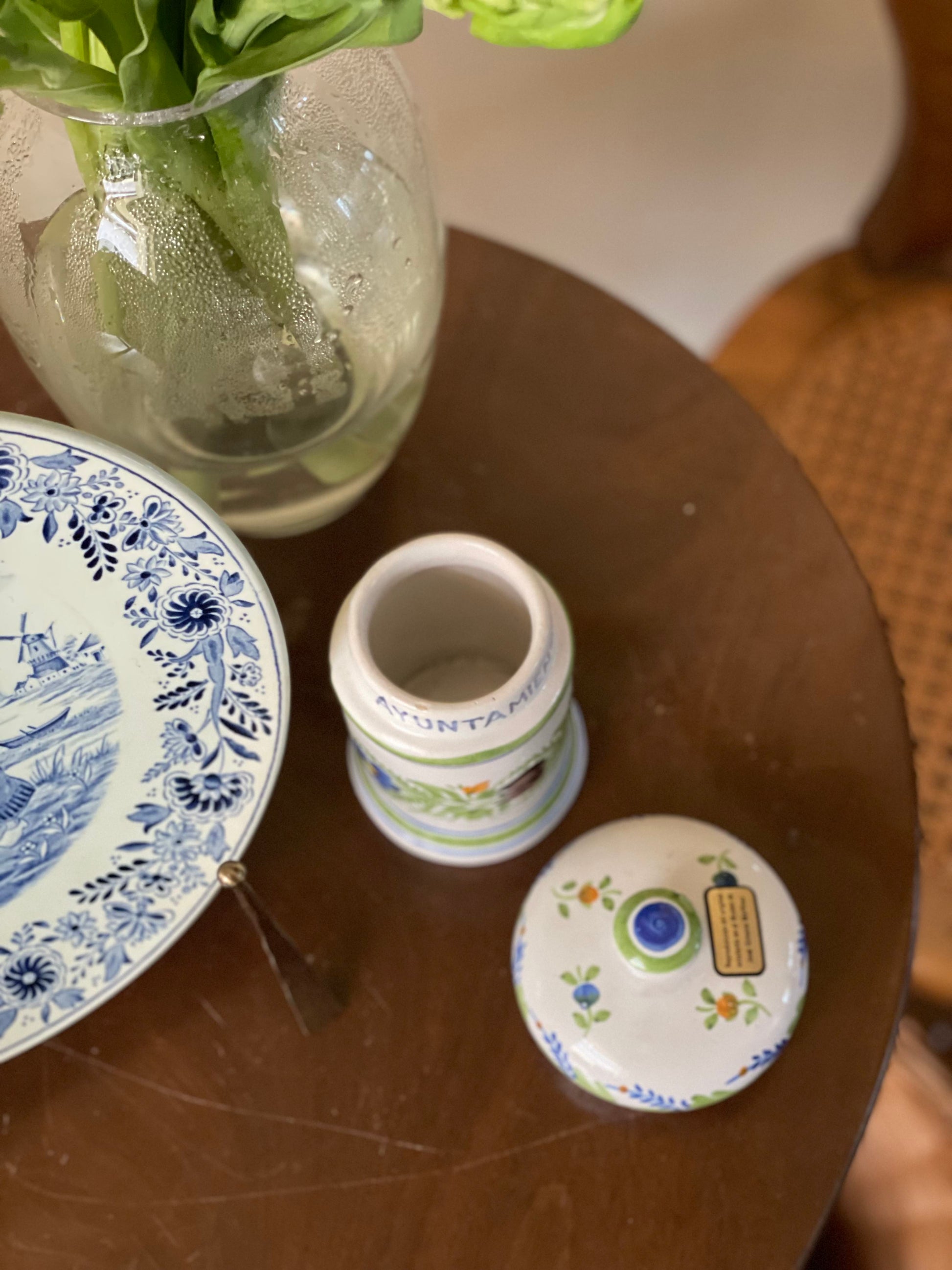 Recipient/Borcan din ceramică antică din Manises, artizanal cu capac, confecționat prin tehnici tradiționale și decorat cu motive florale pictate manual. Realizat din ceramică de înaltă calitate, acest recipient se distinge prin finisajul rafinat și durabilitate. Ideal pentru păstrarea condimentelor, mierii, zahărului sau altor ingrediente.