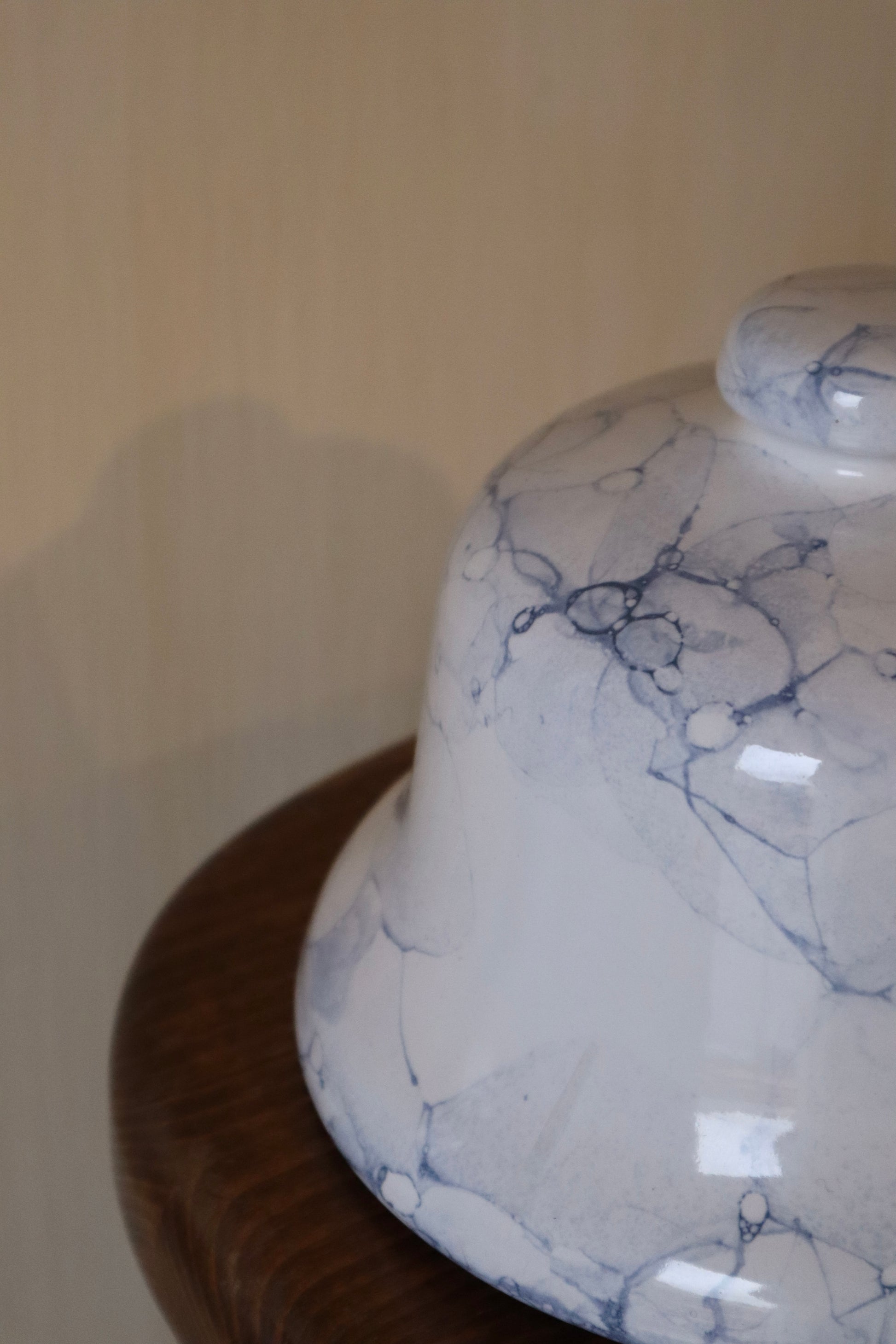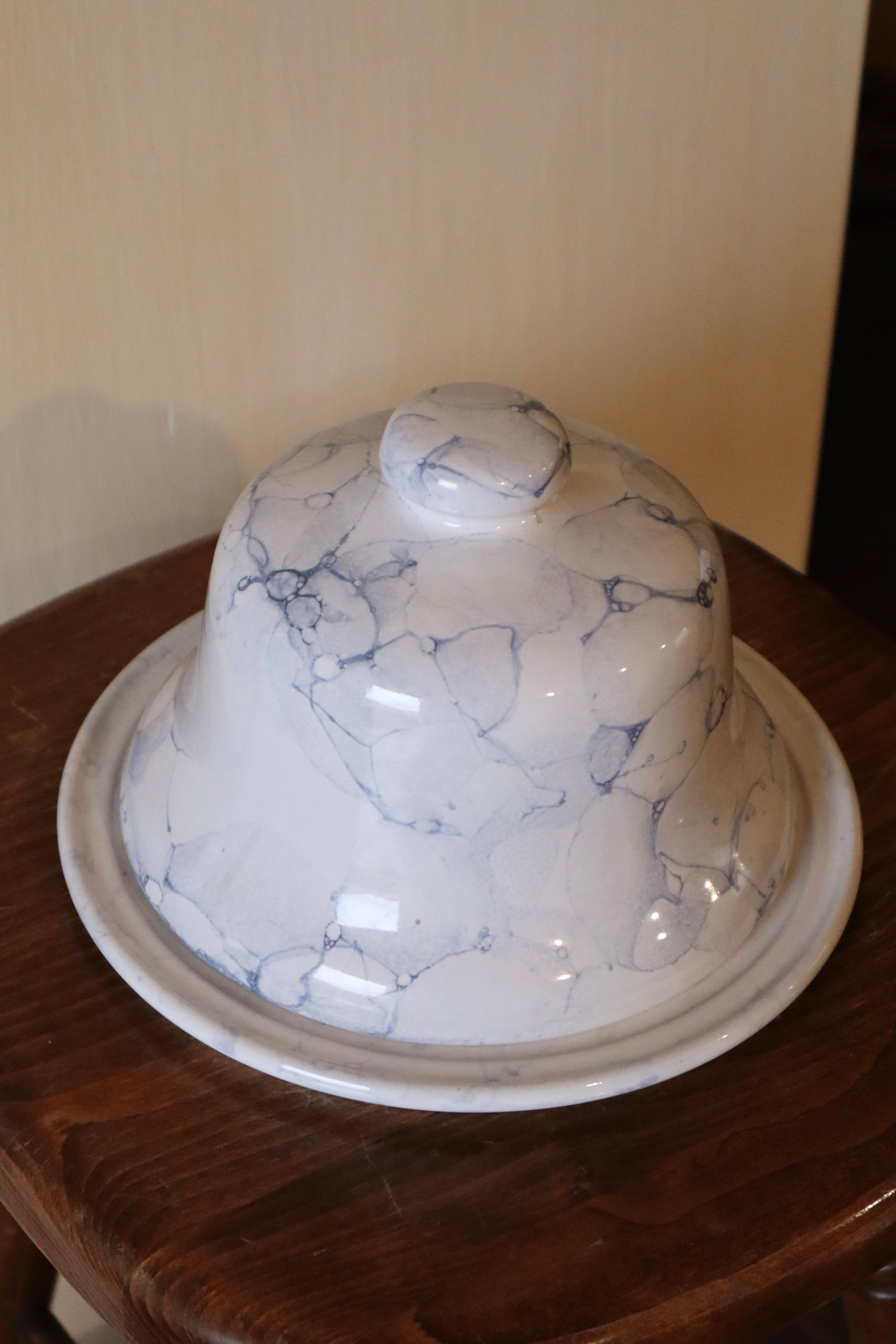 Serviciu elegant de brânzeturi realizat din ceramică cu finisaj marmurat, cuprinzând o tavă sofisticată și un capac protector în formă de clopot.