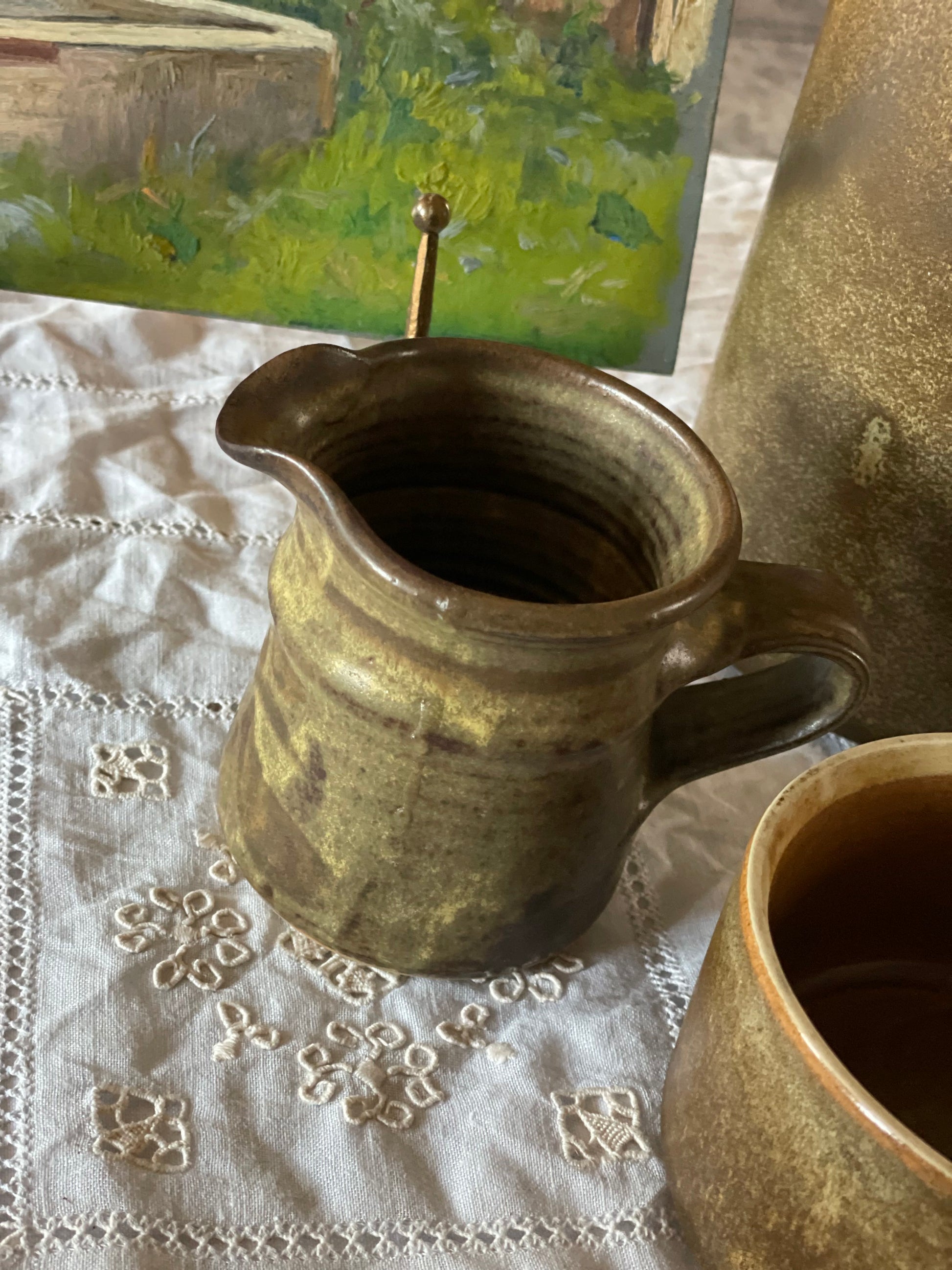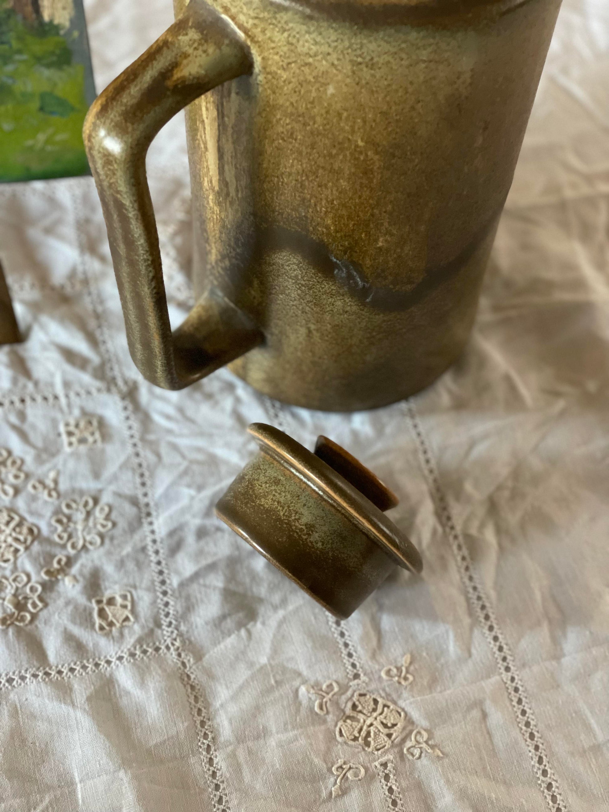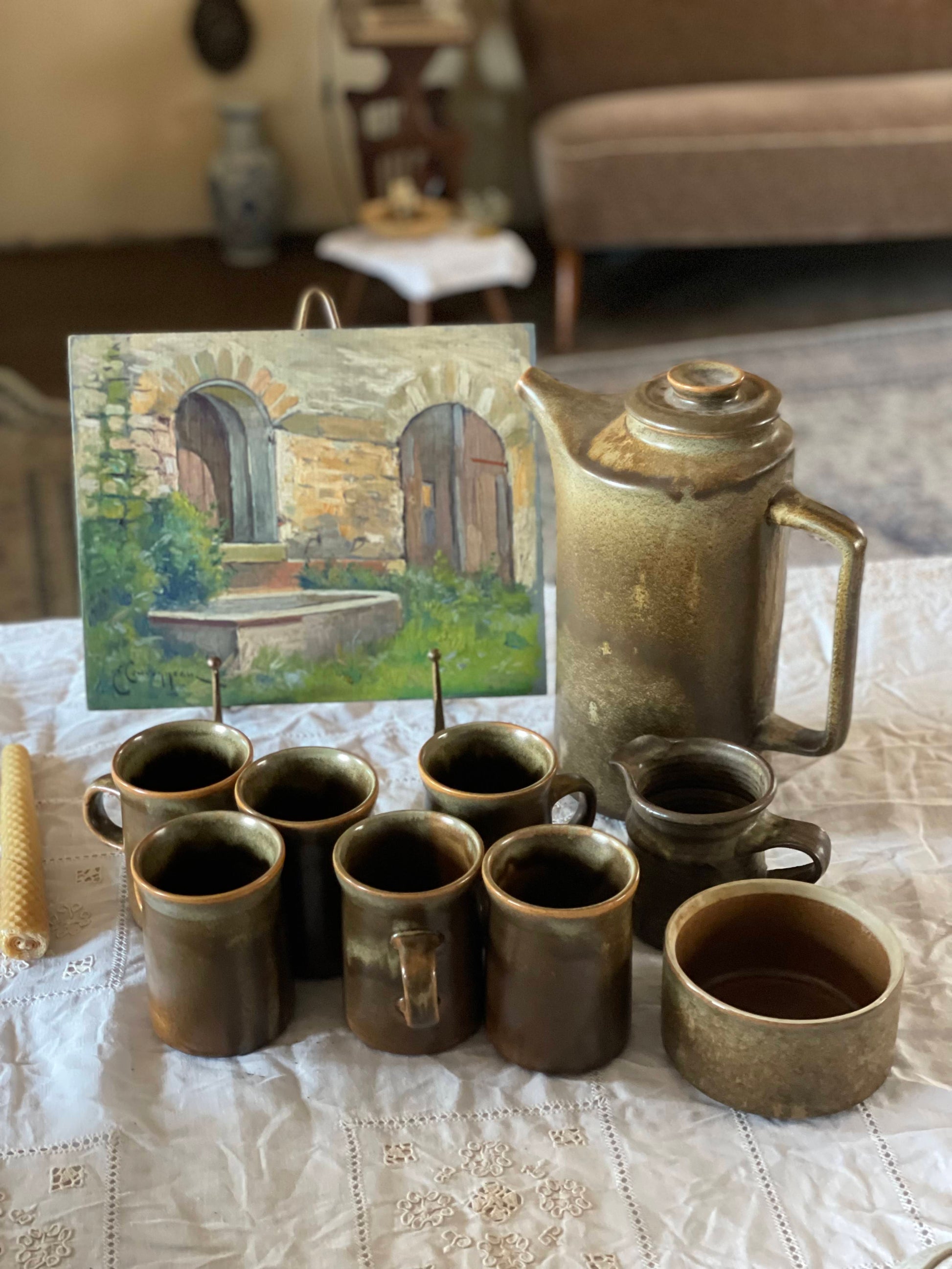 Colecție completă de servire ceai compusă din nouă piese de ceramică artizanală, incluzând ceainic, șase cești, recipient pentru lapte și bol pentru zahăr. Fiecare element prezintă o finisare glazurată distinctivă, rezultatul unui proces manual de confecționare care garantează unicitate și calitate superioară.