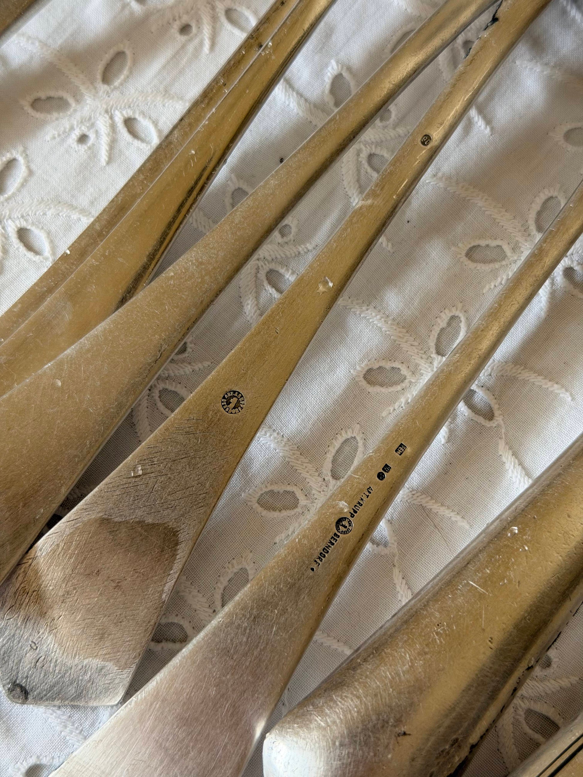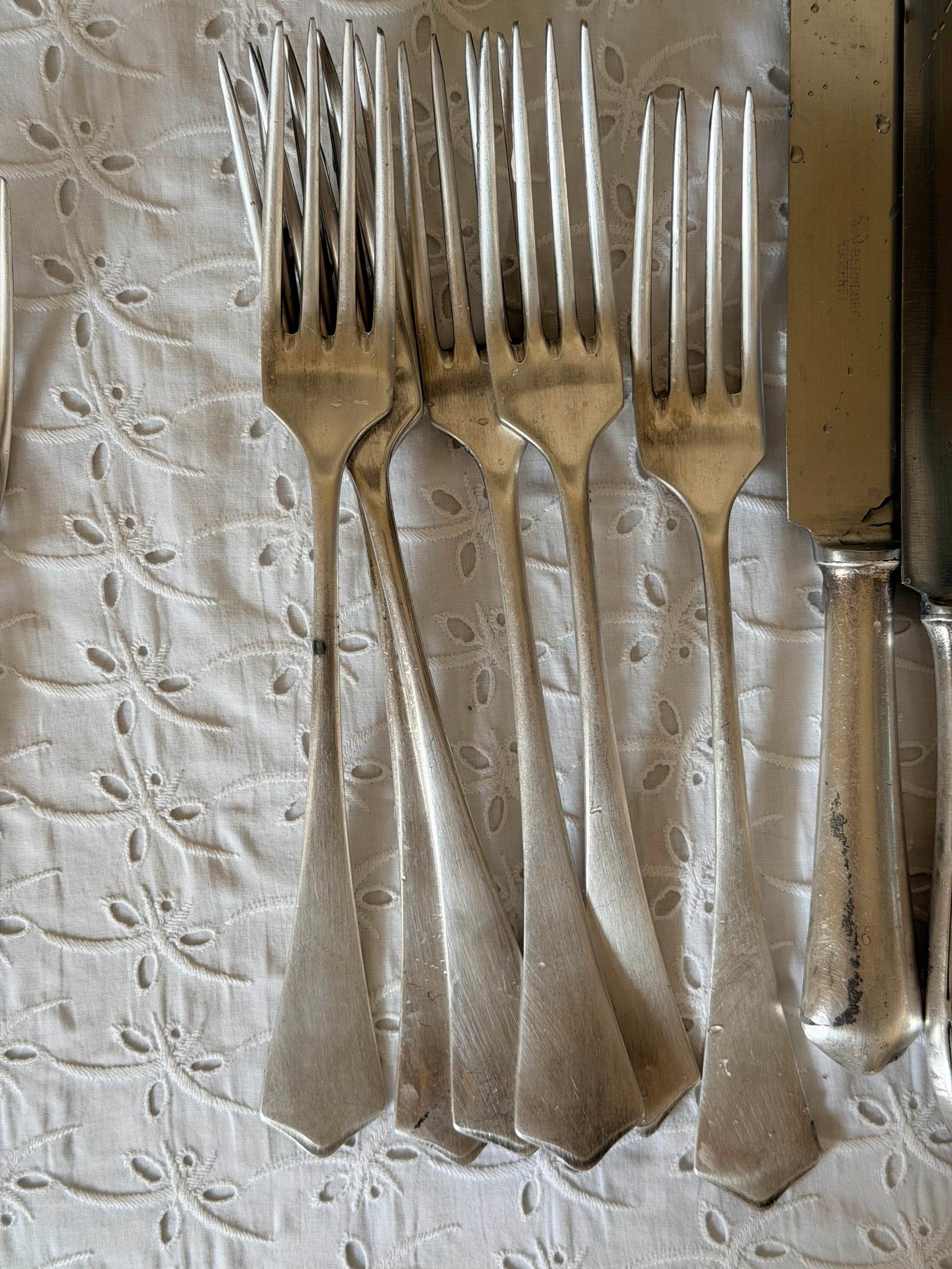 Set de 21 tacâmuri vintage argintate mix&match, piesă de colecție din perioada veche, cu finisaj superior și marcă de prestigiu. Setul include 11 furculițe elegante și 10 cuțite rafinate, ideale pentru colecționari sau pentru a adăuga o notă de eleganță clasică mesei dumneavoastră. Fiecare piesă reflectă calitatea materialelor folosite în perioada de fabricație. Potrivit pentru ocazii speciale, expunere în vitrine de colecție sau ca și cadou pentru iubitorii de antichități și design vintage.