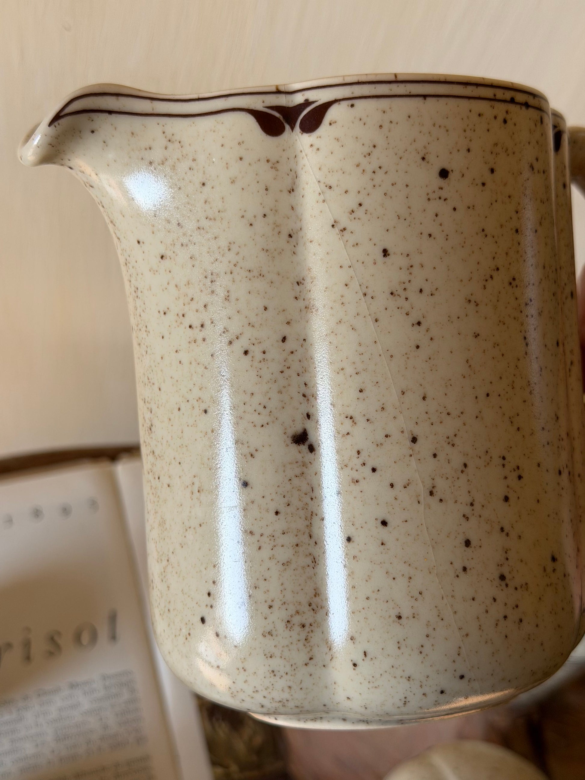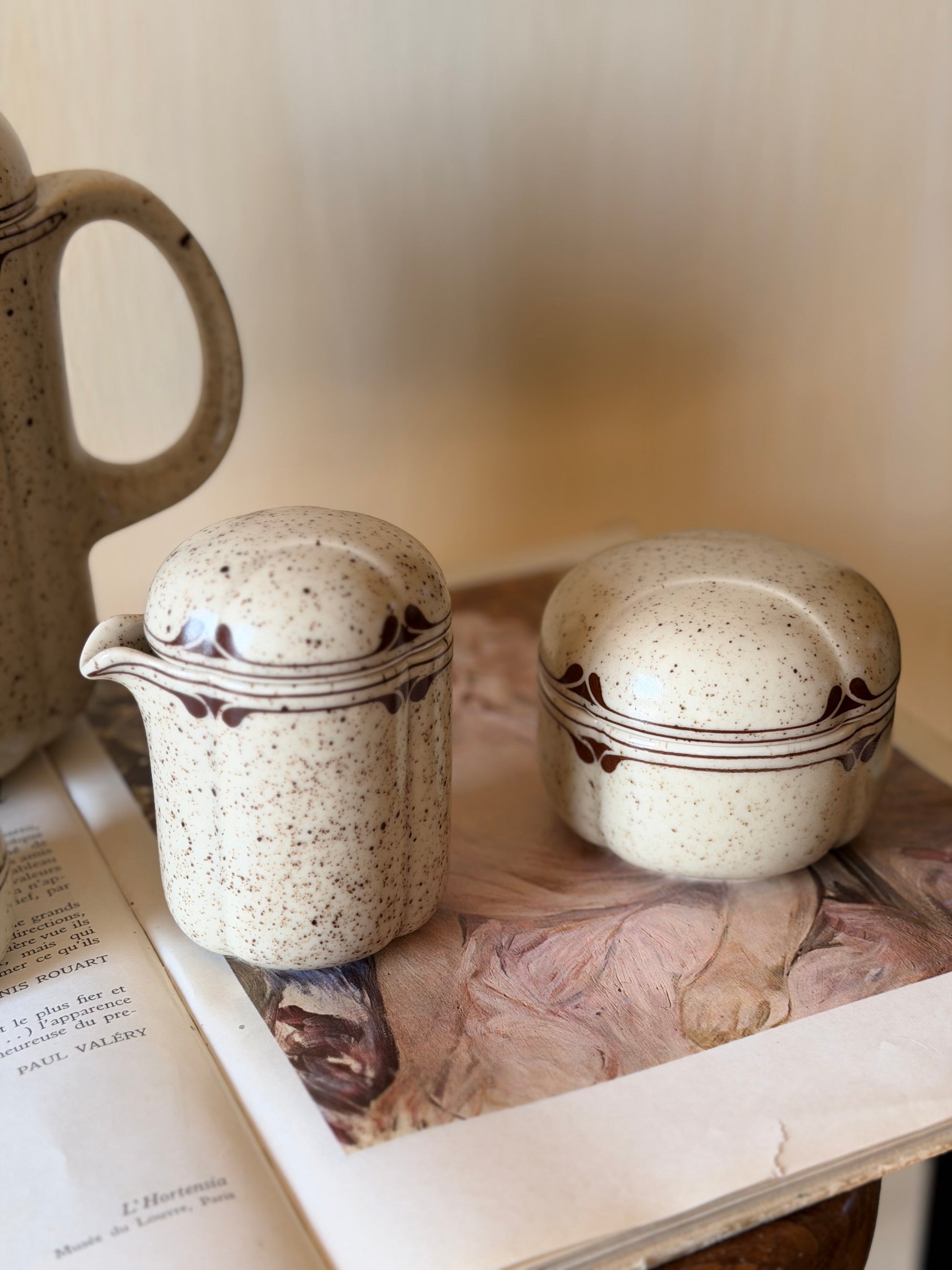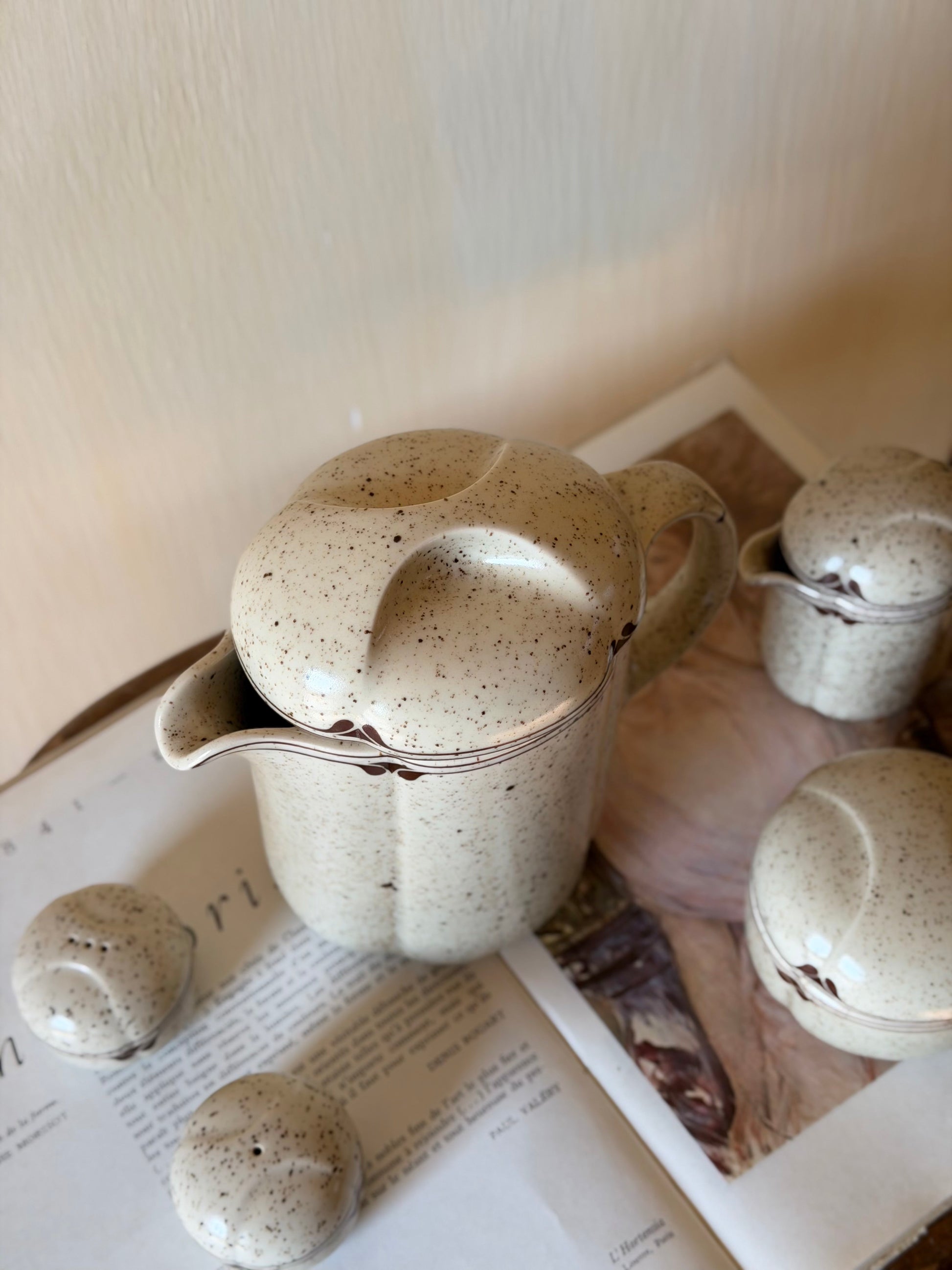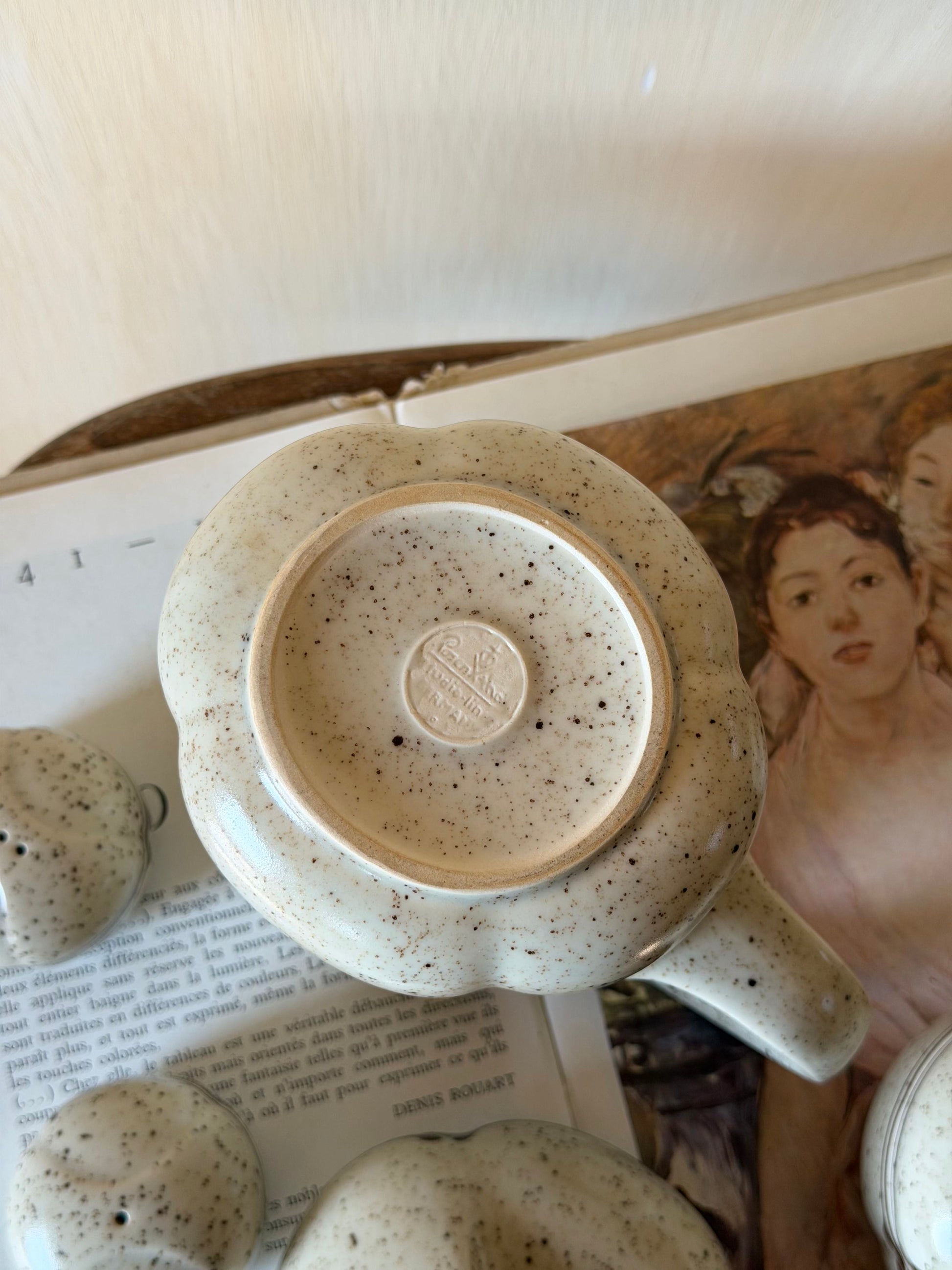 Set de ceai vintage din 1970, creat de designerul Bjørn Wiinbad pentru Rosenthal. Colecția cuprinde cinci piese din porțelan gros de calitate superioară: ceainic(1.2l), recipient pentru sare și piper, latieră(200ml) și zaharniță(h4.5cm). Fiecare element reflectă atenția la detaliu și eleganța caracteristică perioadei. Ceainicul prezintă o mică fisură care nu afectează funcționabilitatea datorită grosimii materialului. Piesă ideală pentru colecționari și iubitori de design clasic scandinav.