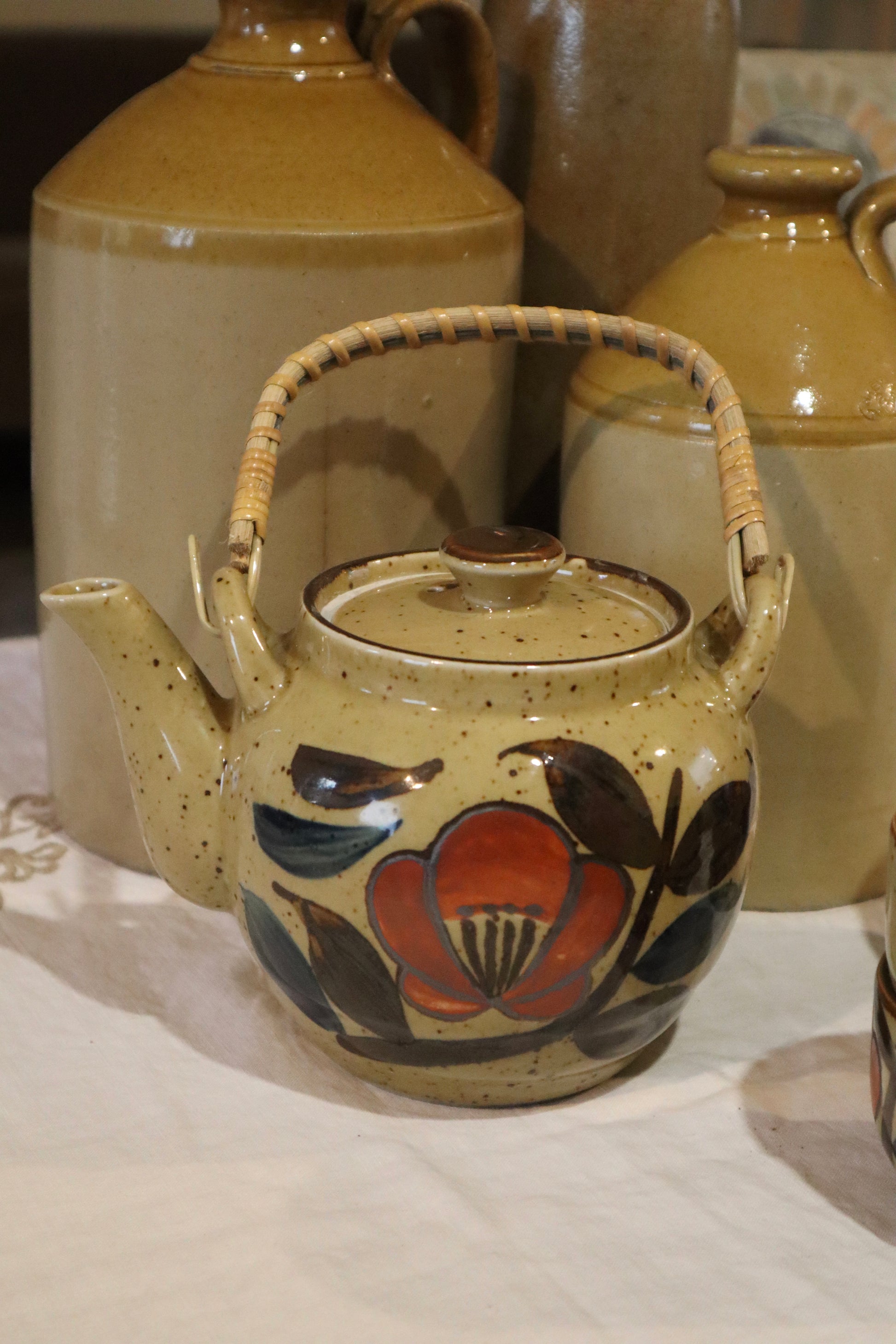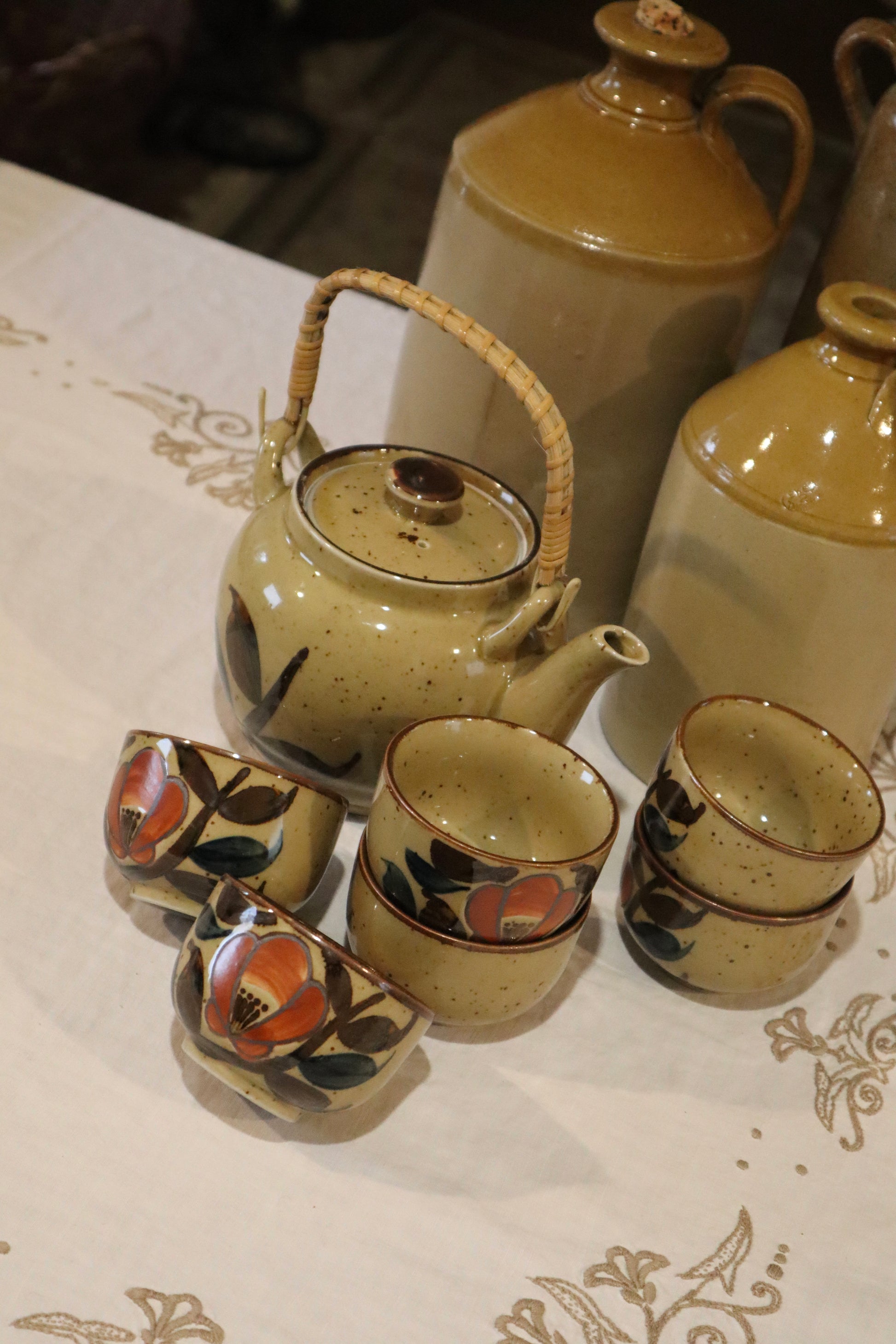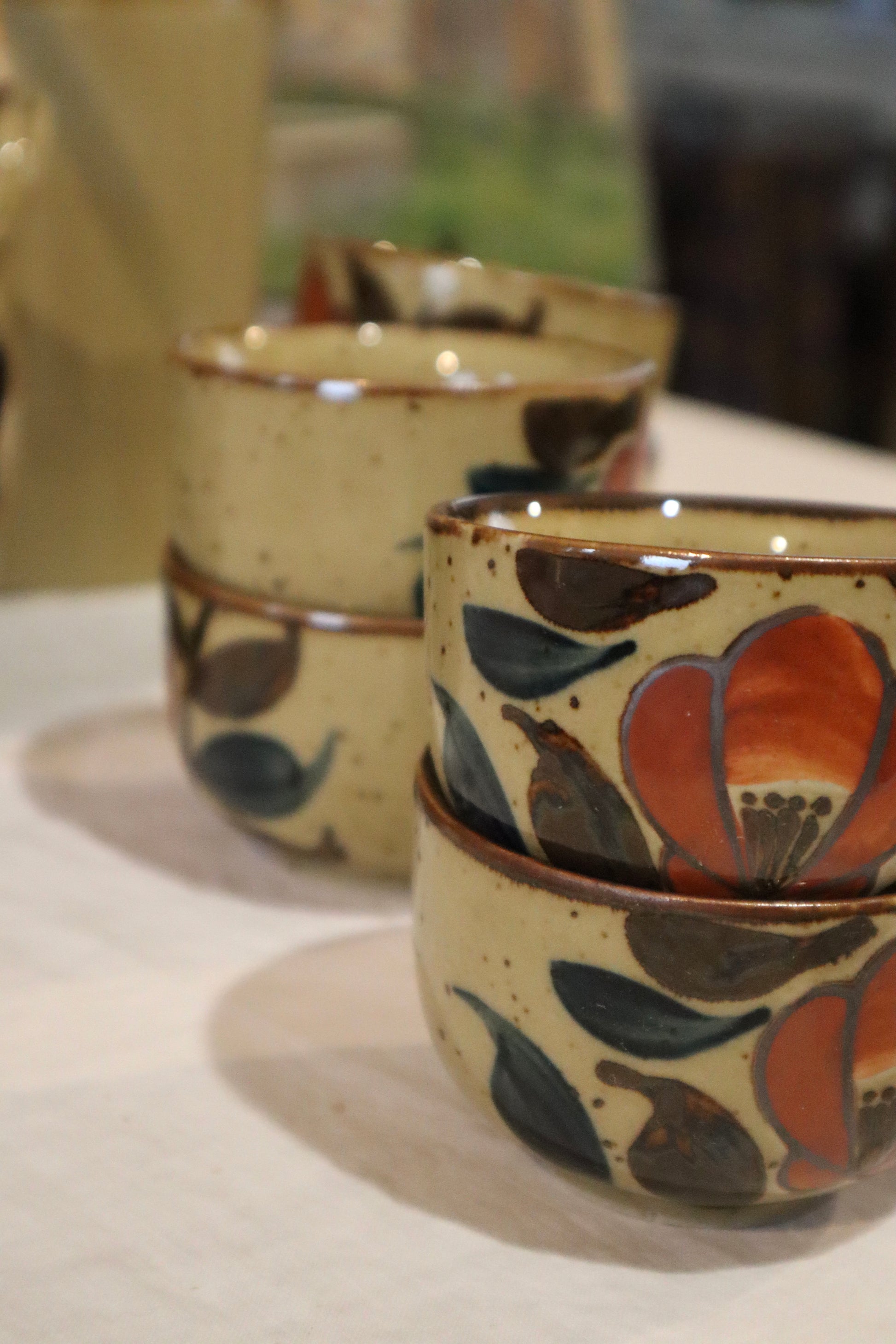 Colecție de ceramică artizanală cu decor floral, compusă dintr-un ceainic și șase căni asortate.