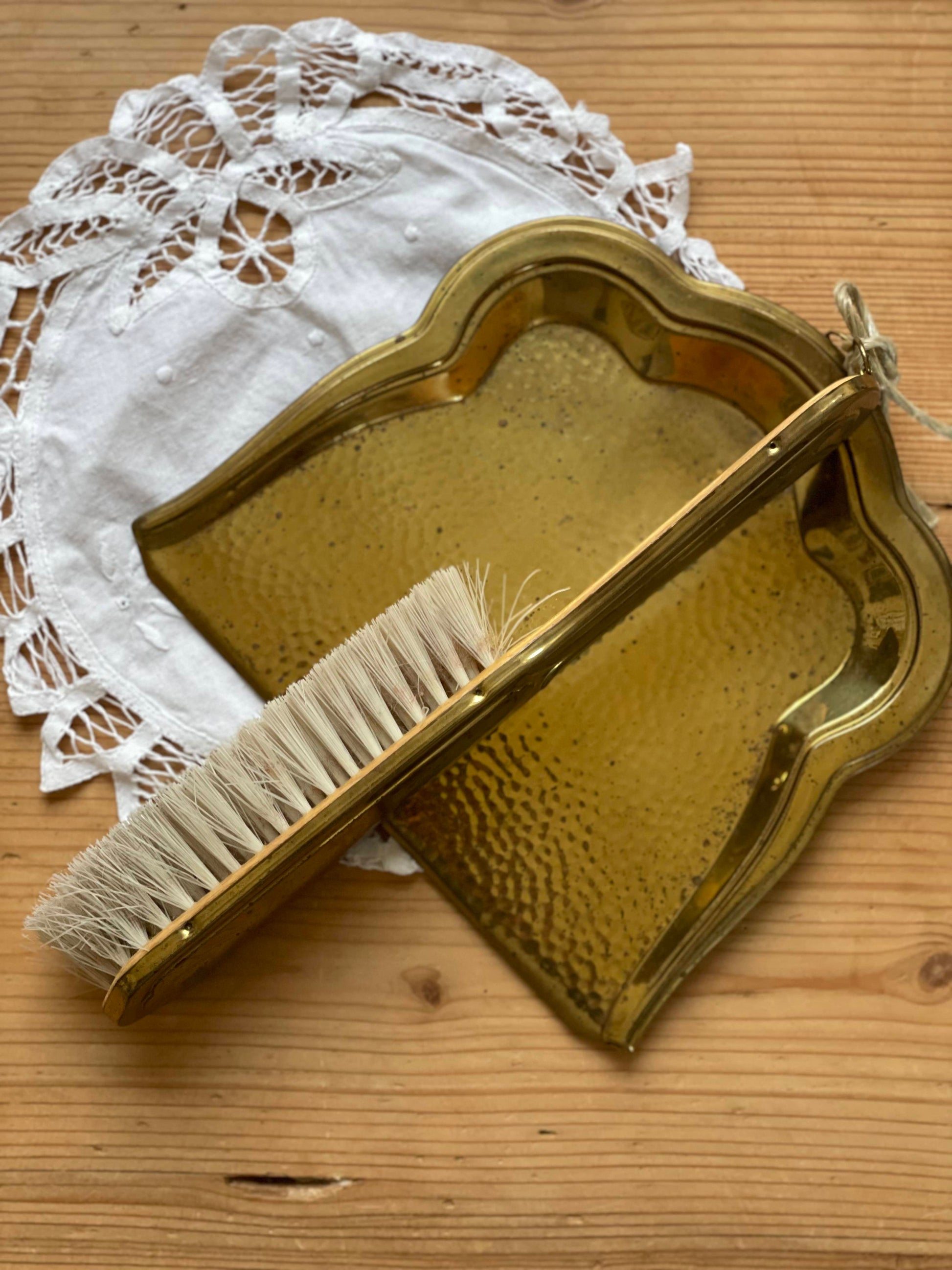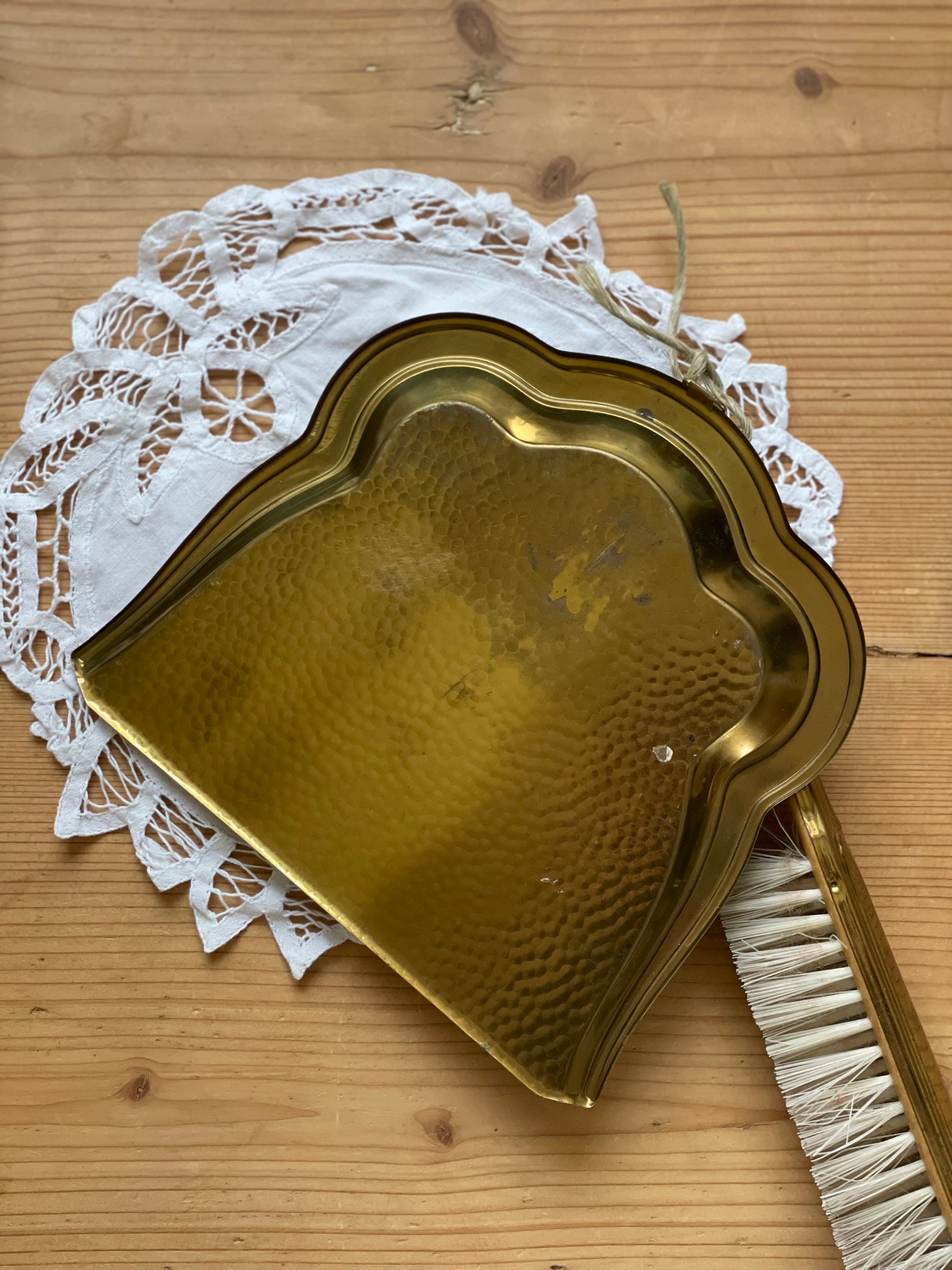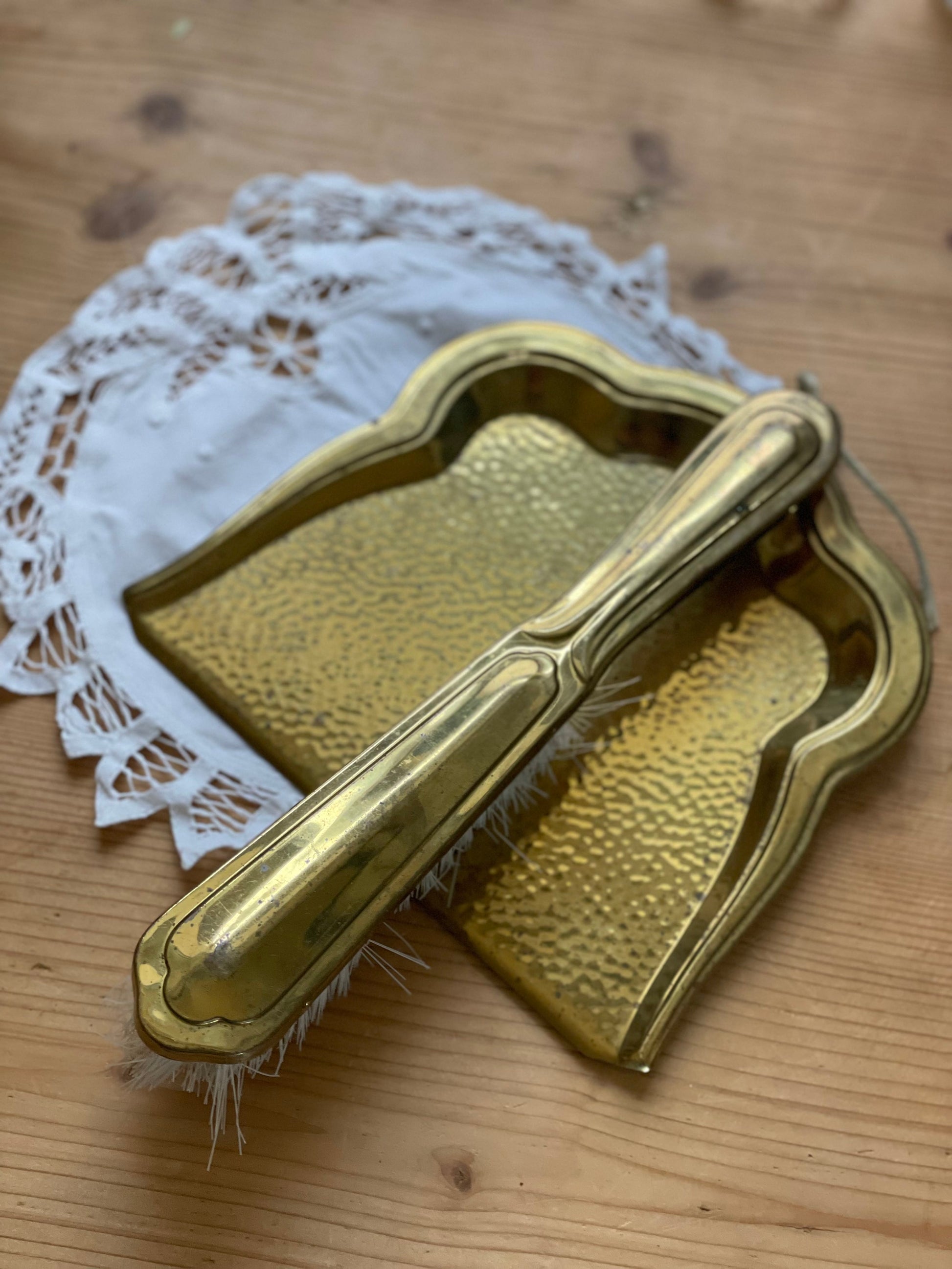 Ansamblu de curățenie din perioada anilor 1950, compus din făraș de masă și mătură potrivită, confecționat din metal cu finisaj tip alamă. Piese autentice care reflectă designul funcțional și eleganța caracteristică epocii, ideale pentru a adăuga o notă vintage spațiului dumneavoastră.