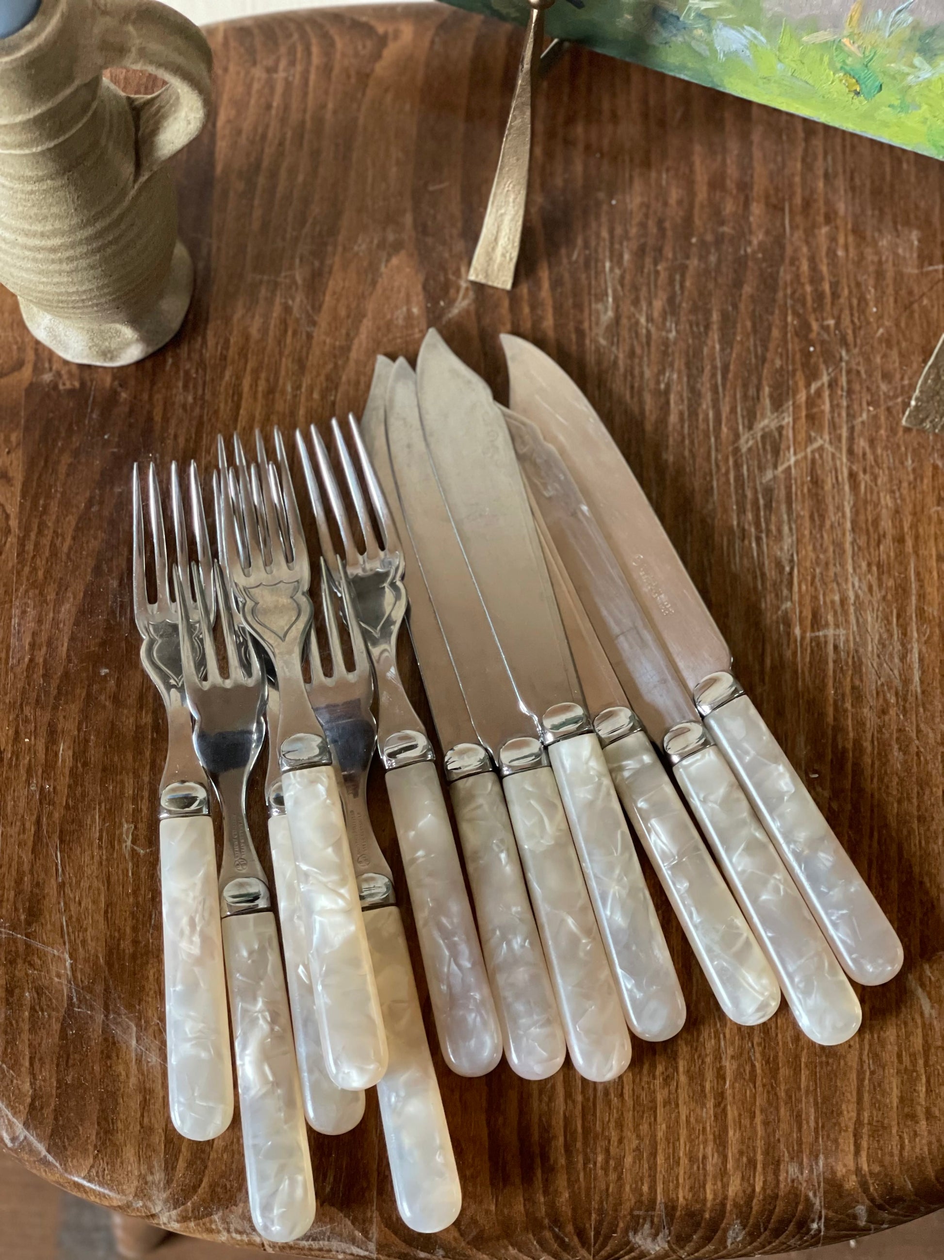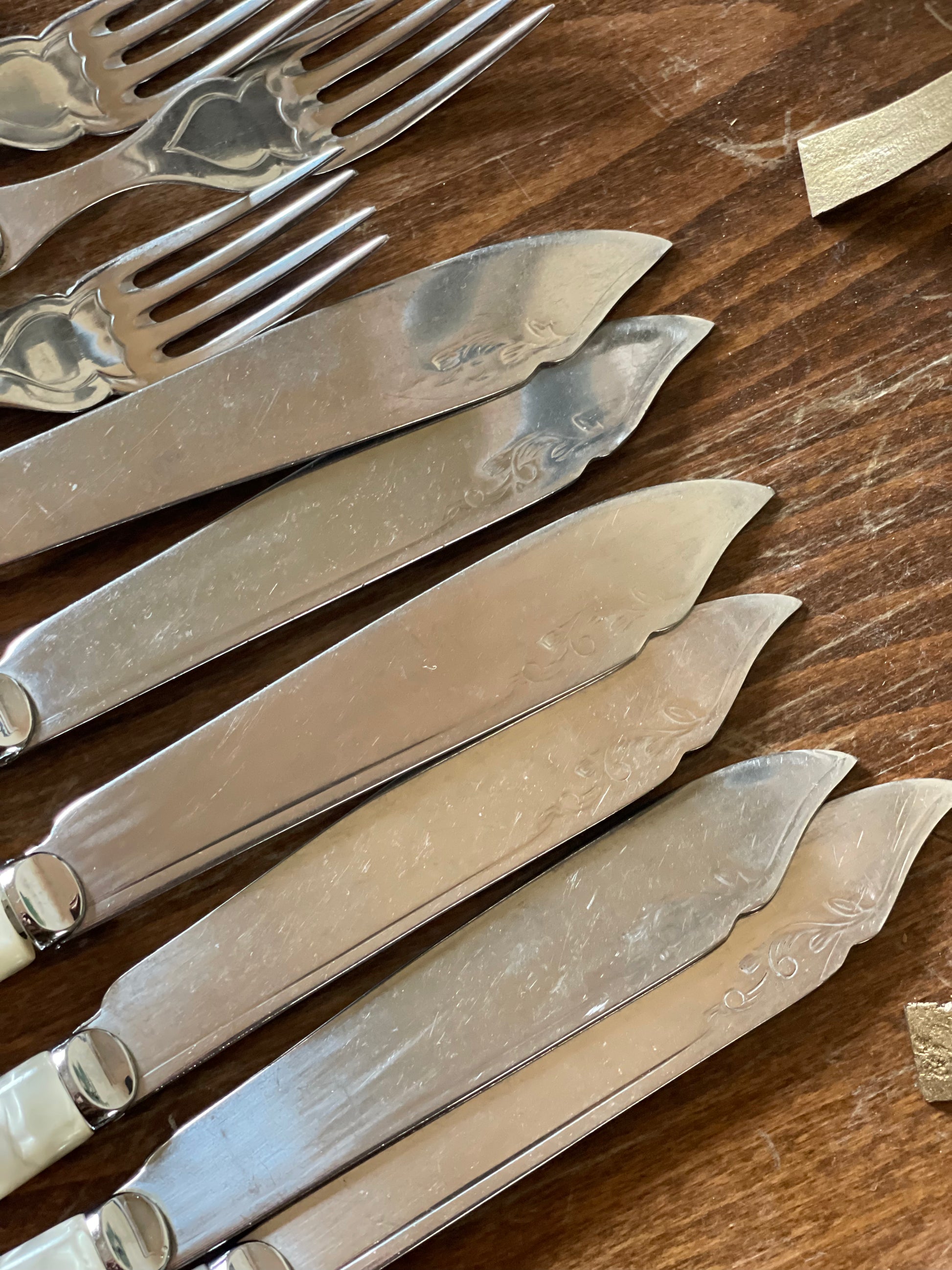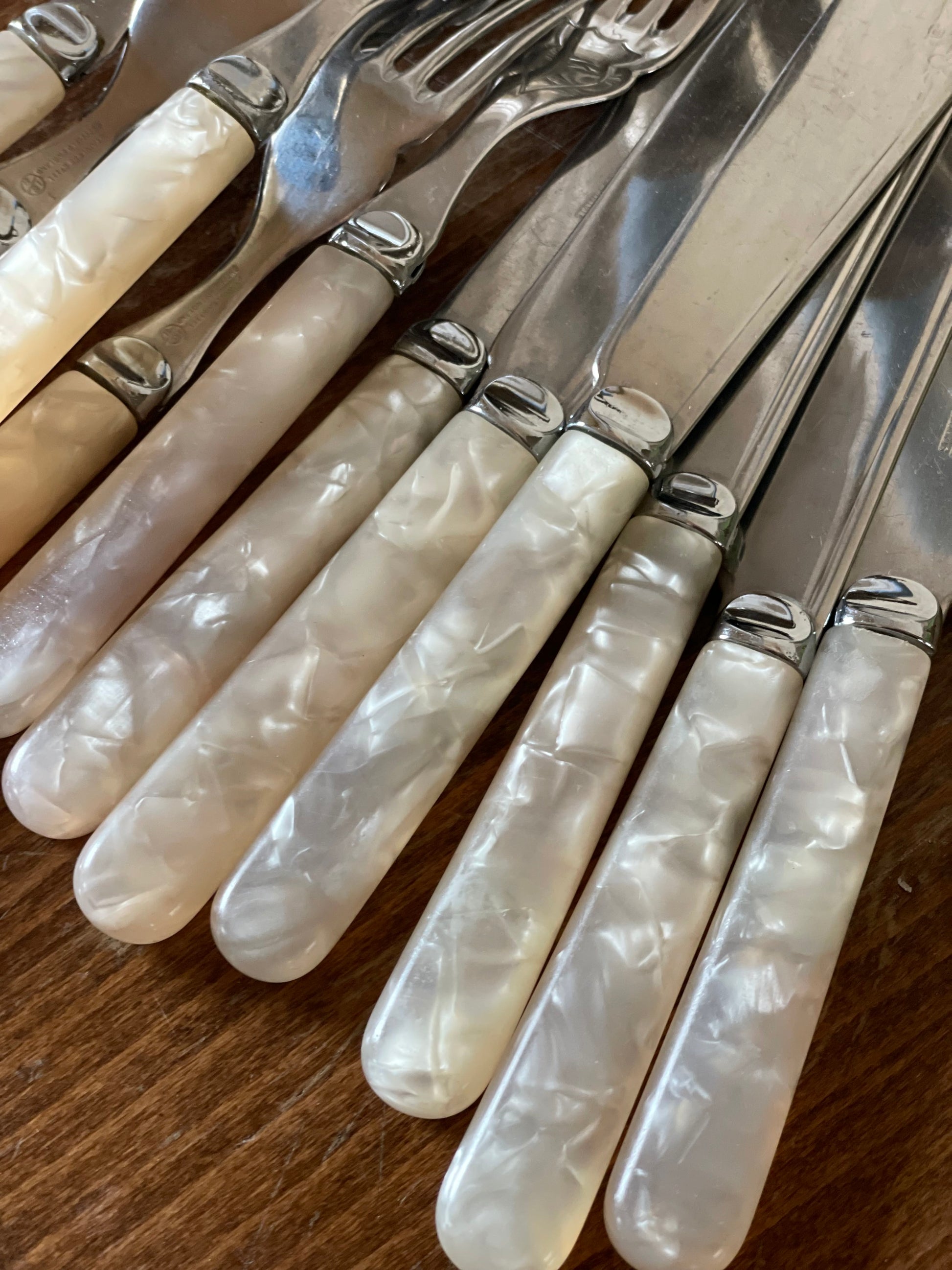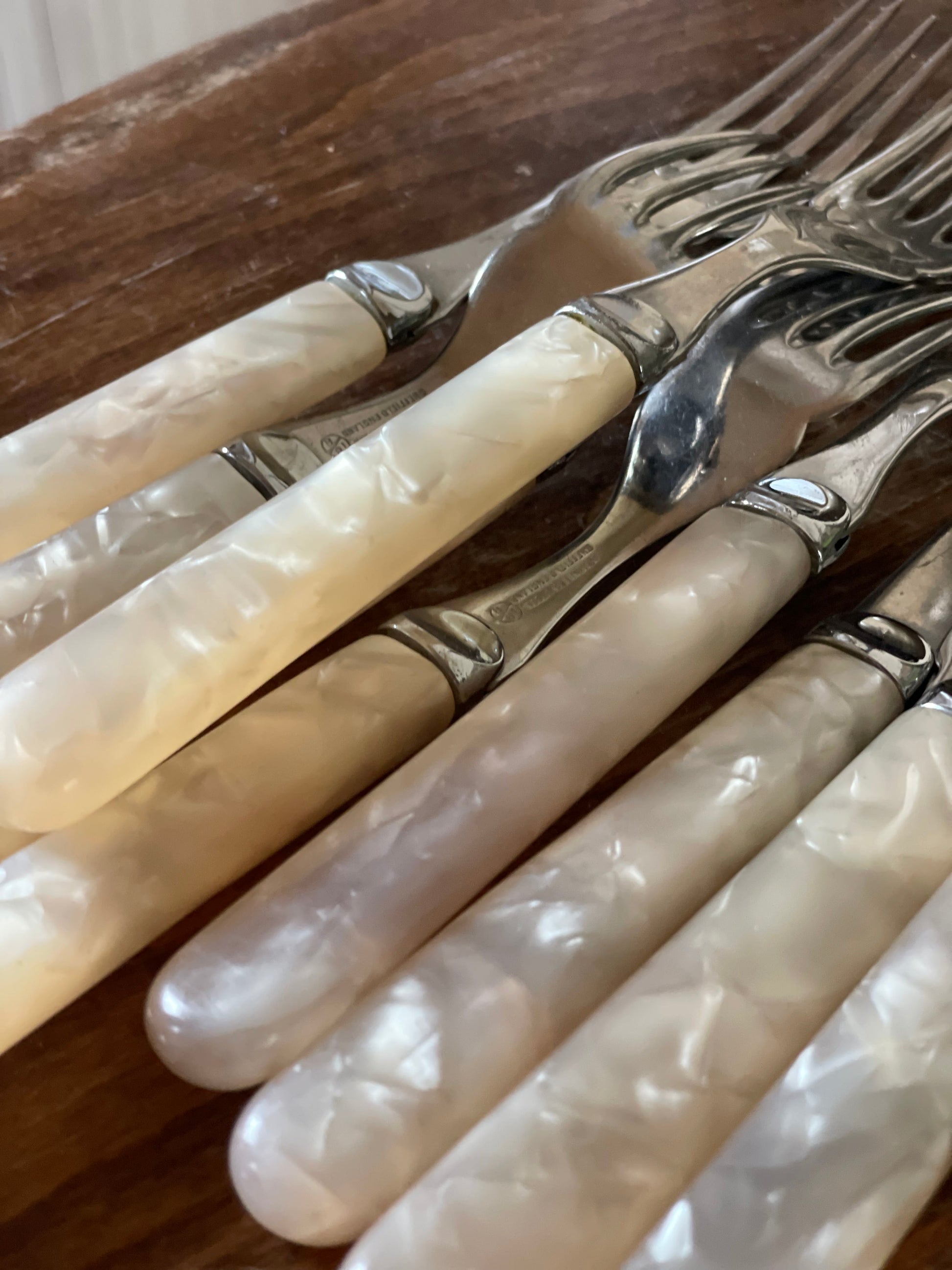 Set vintage de 12 tacâmuri din sidef, argintate-Sheffield Makers Mark M&CO.
