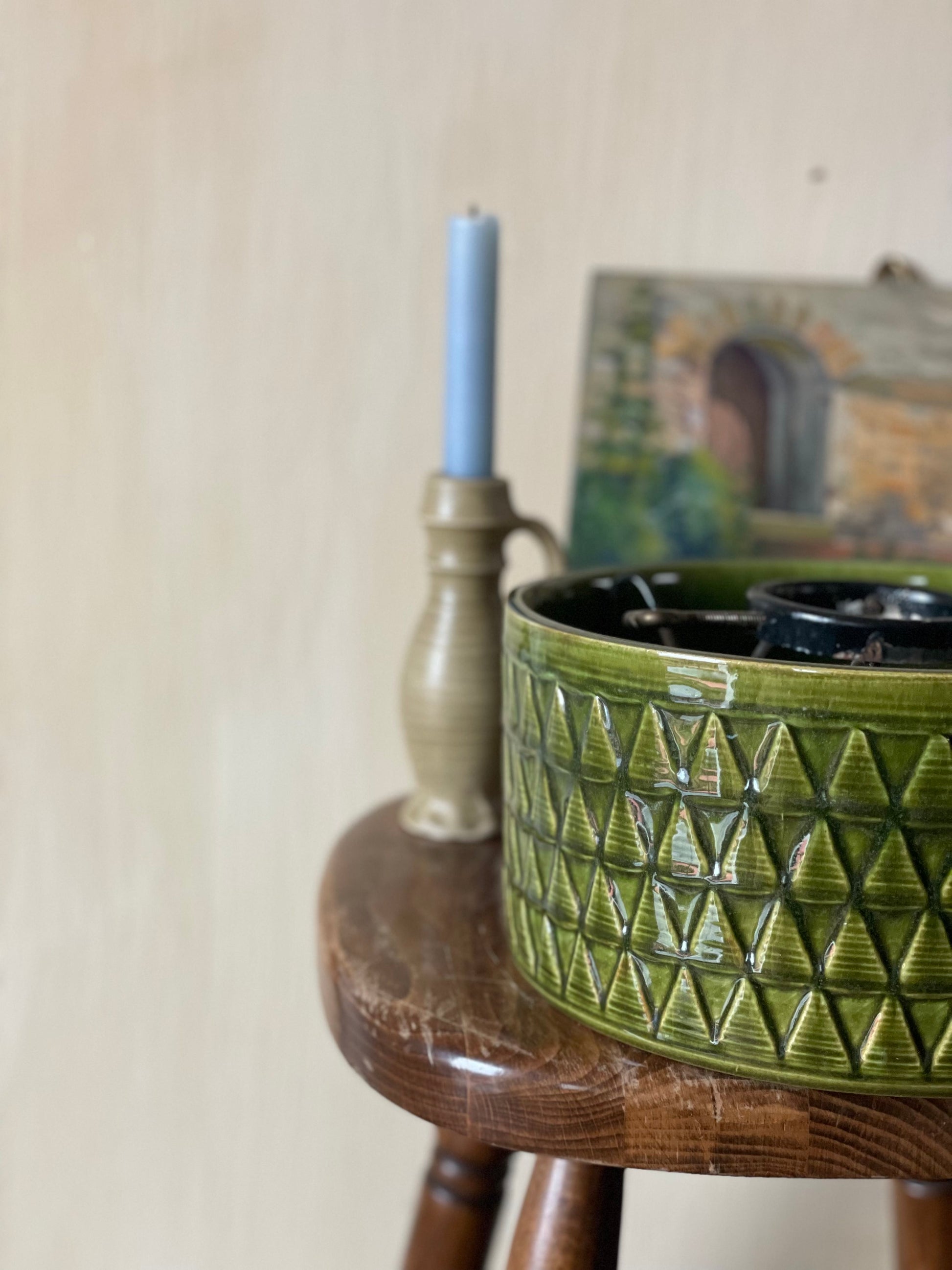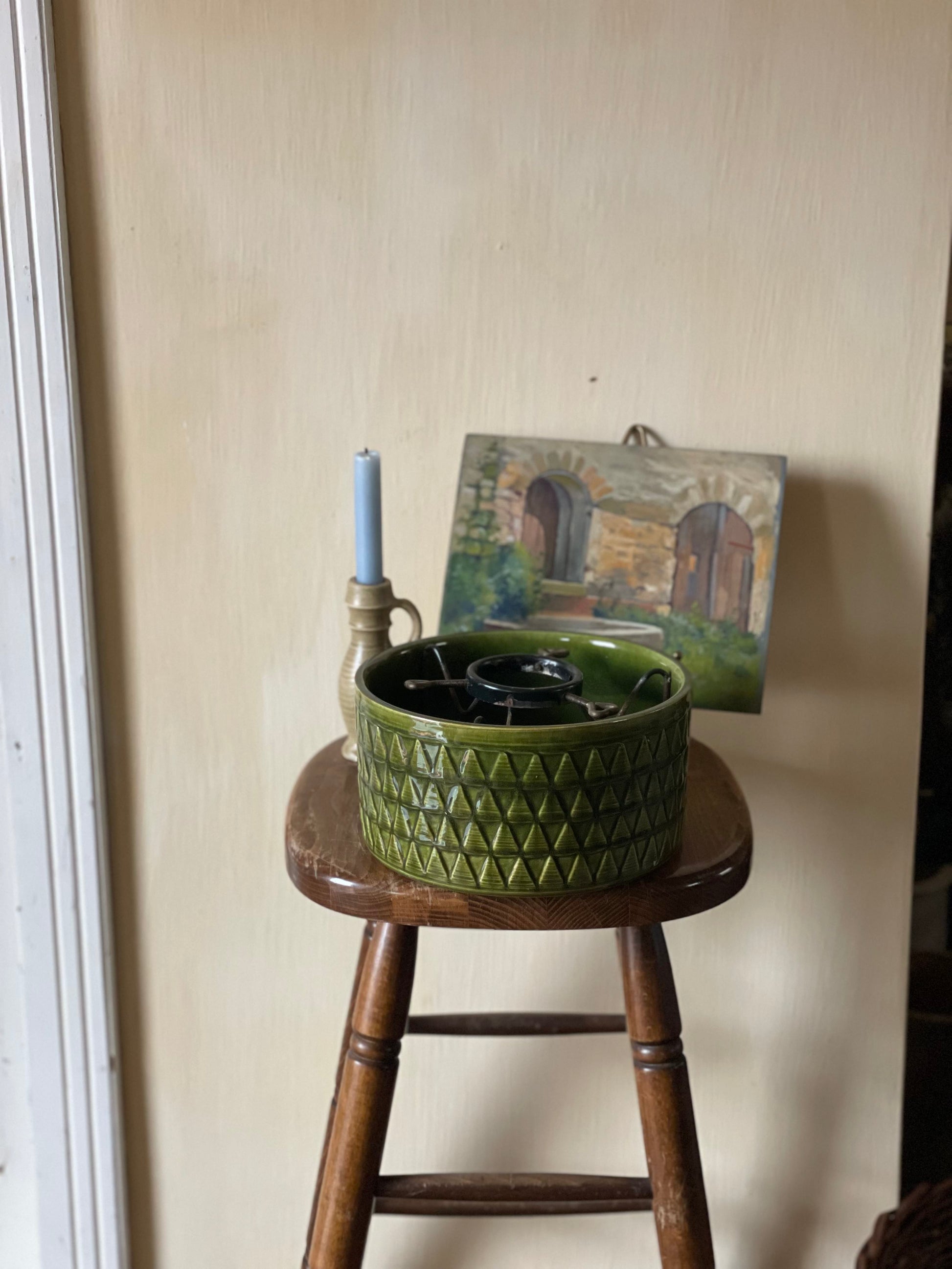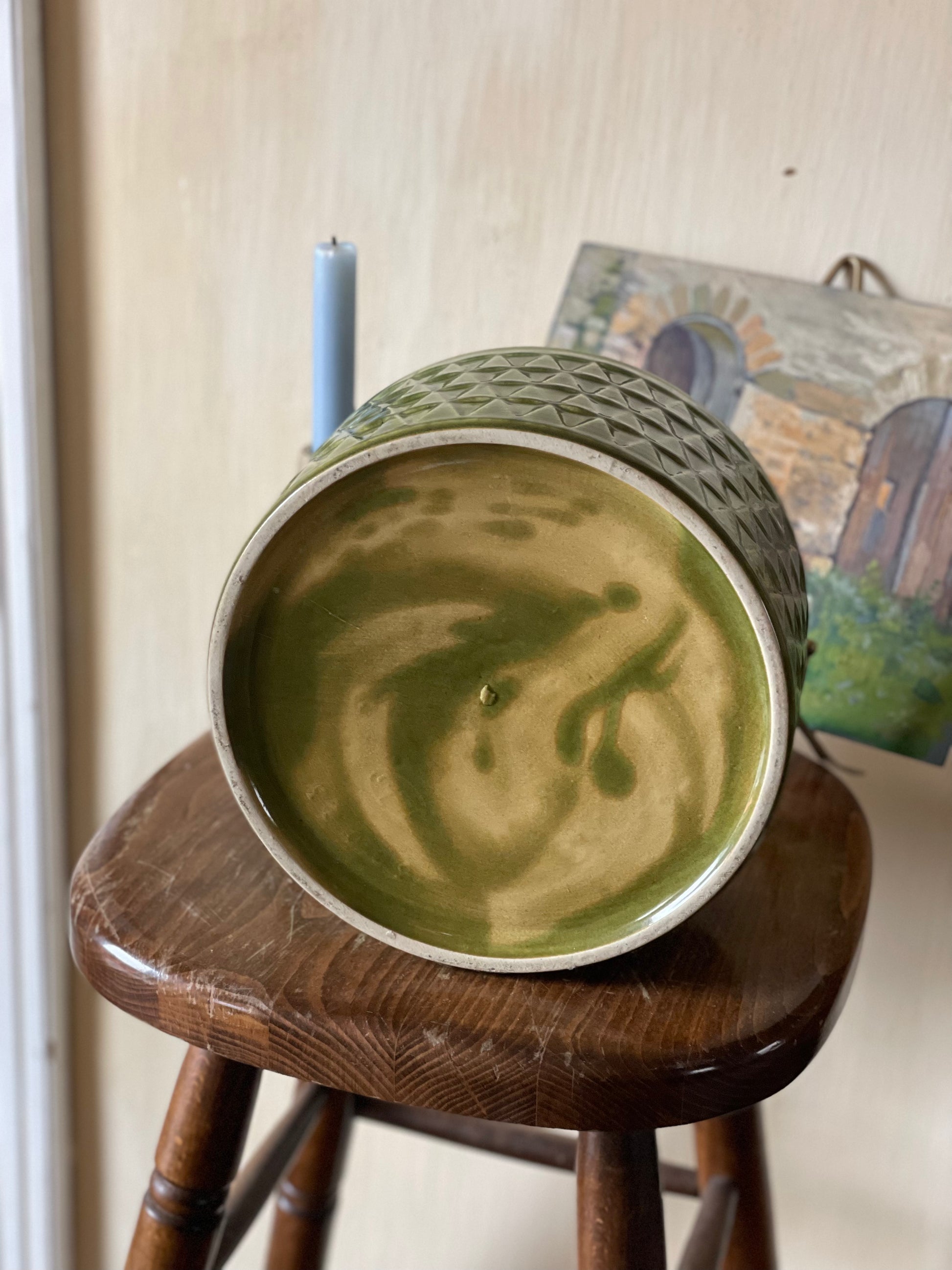 Suport vechi din ceramică cu glazură verde pentru brad de Crăciun, model-forme geometrice în relief.