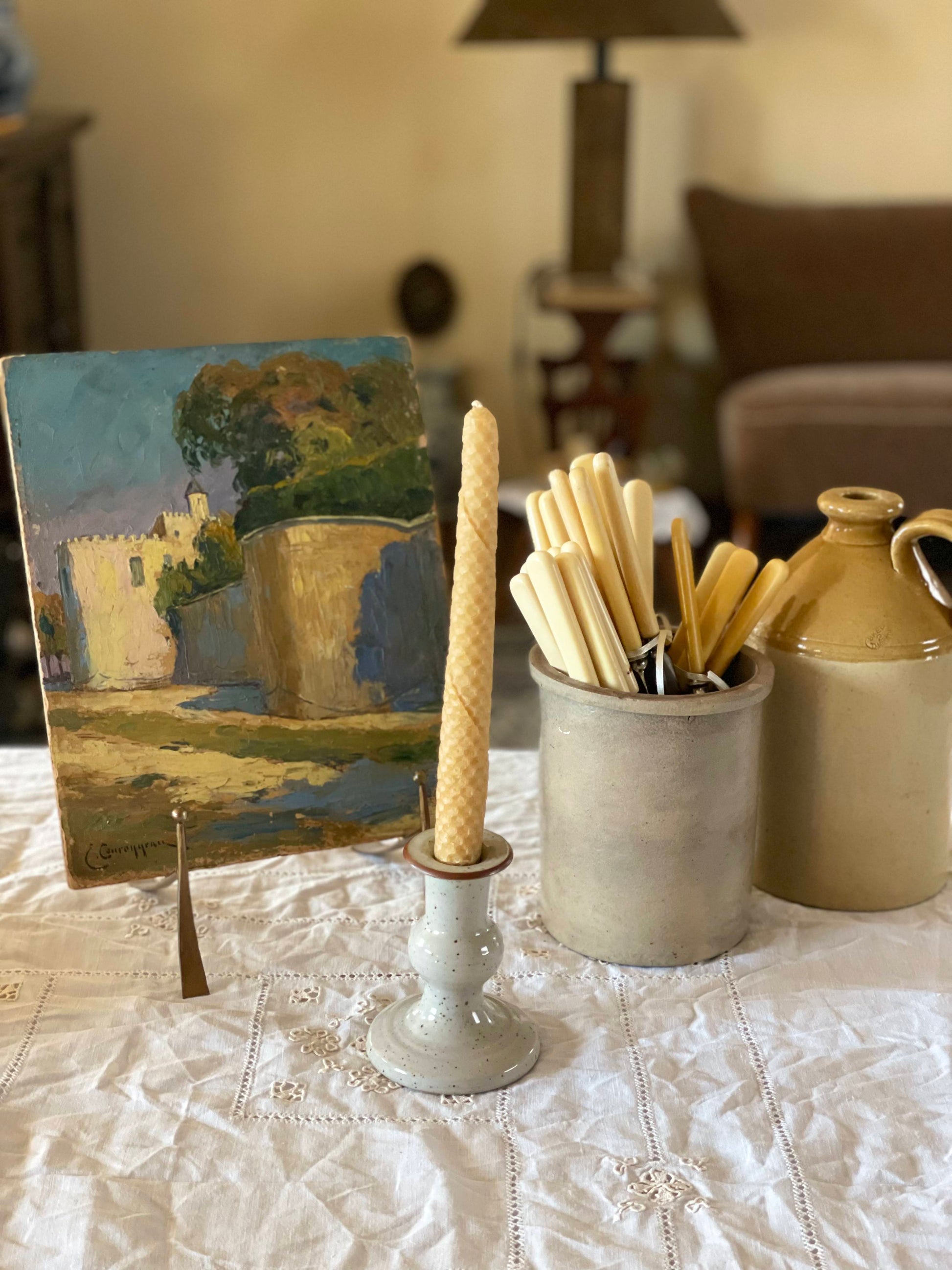 Suport de lumânare vintage, din ceramică lucrată manual, glazurată și pistruiată.