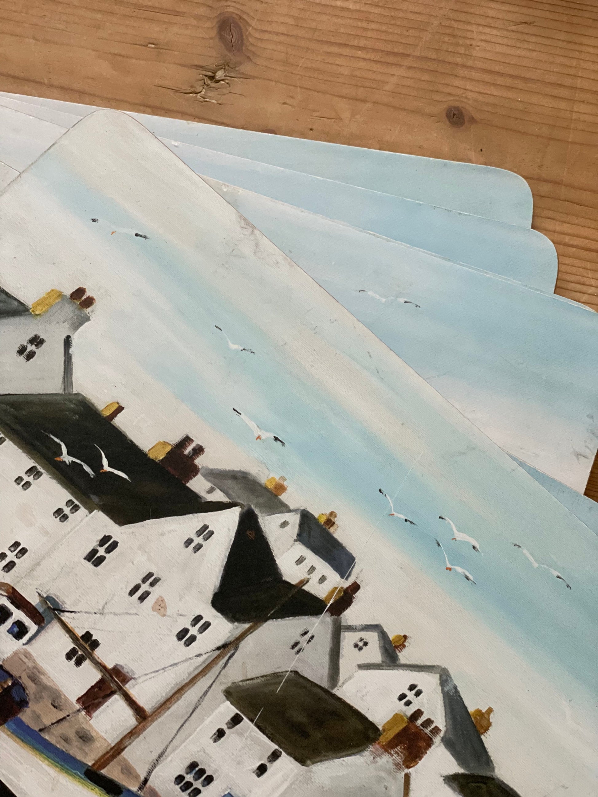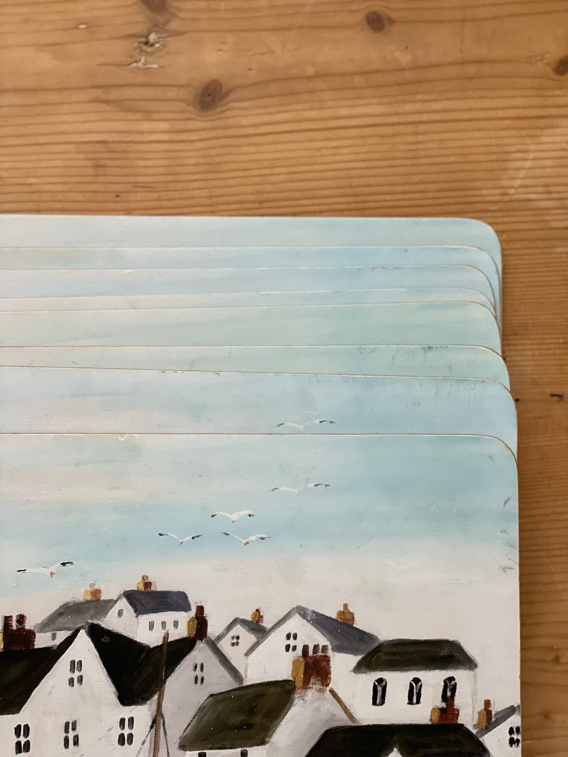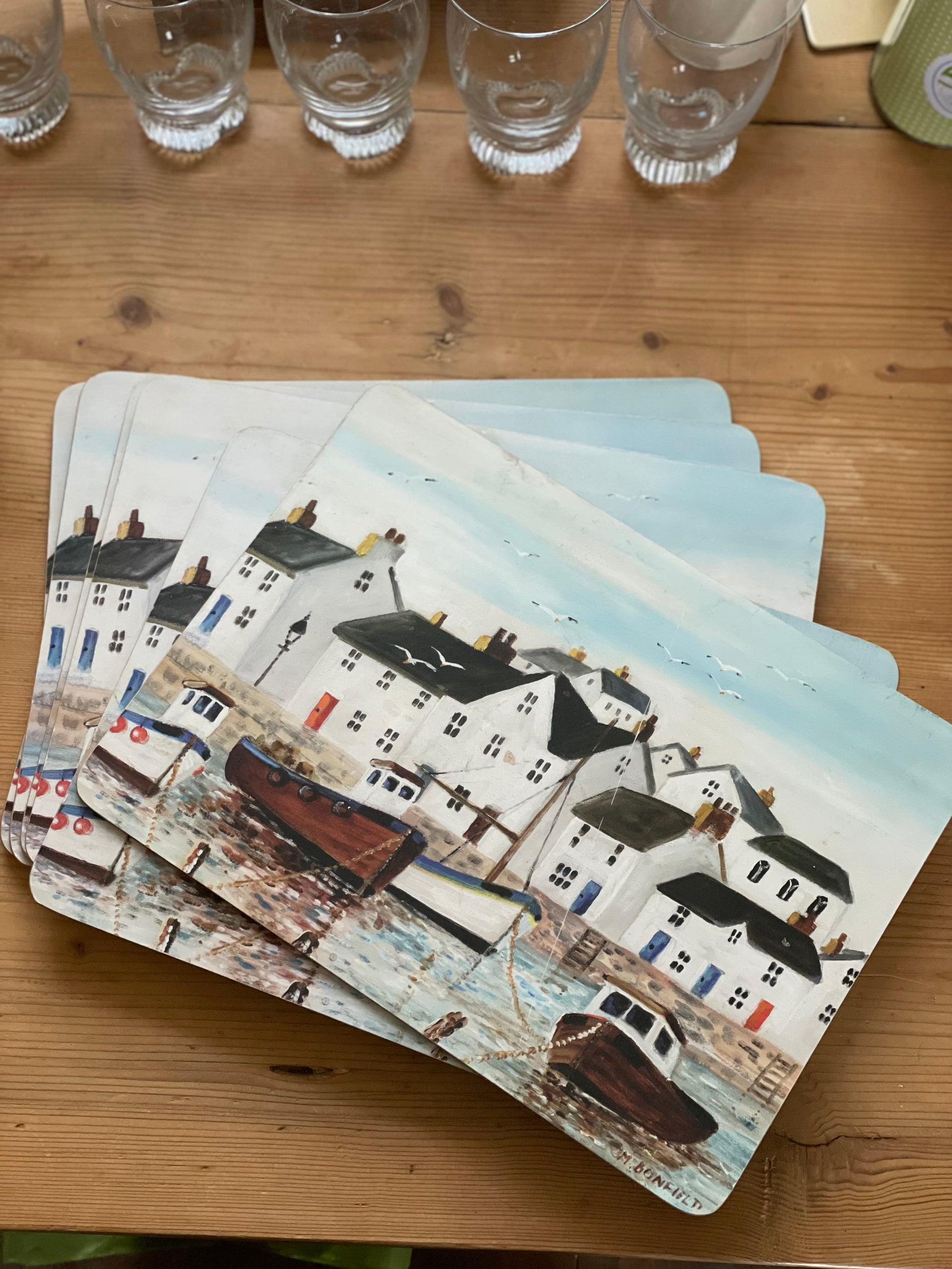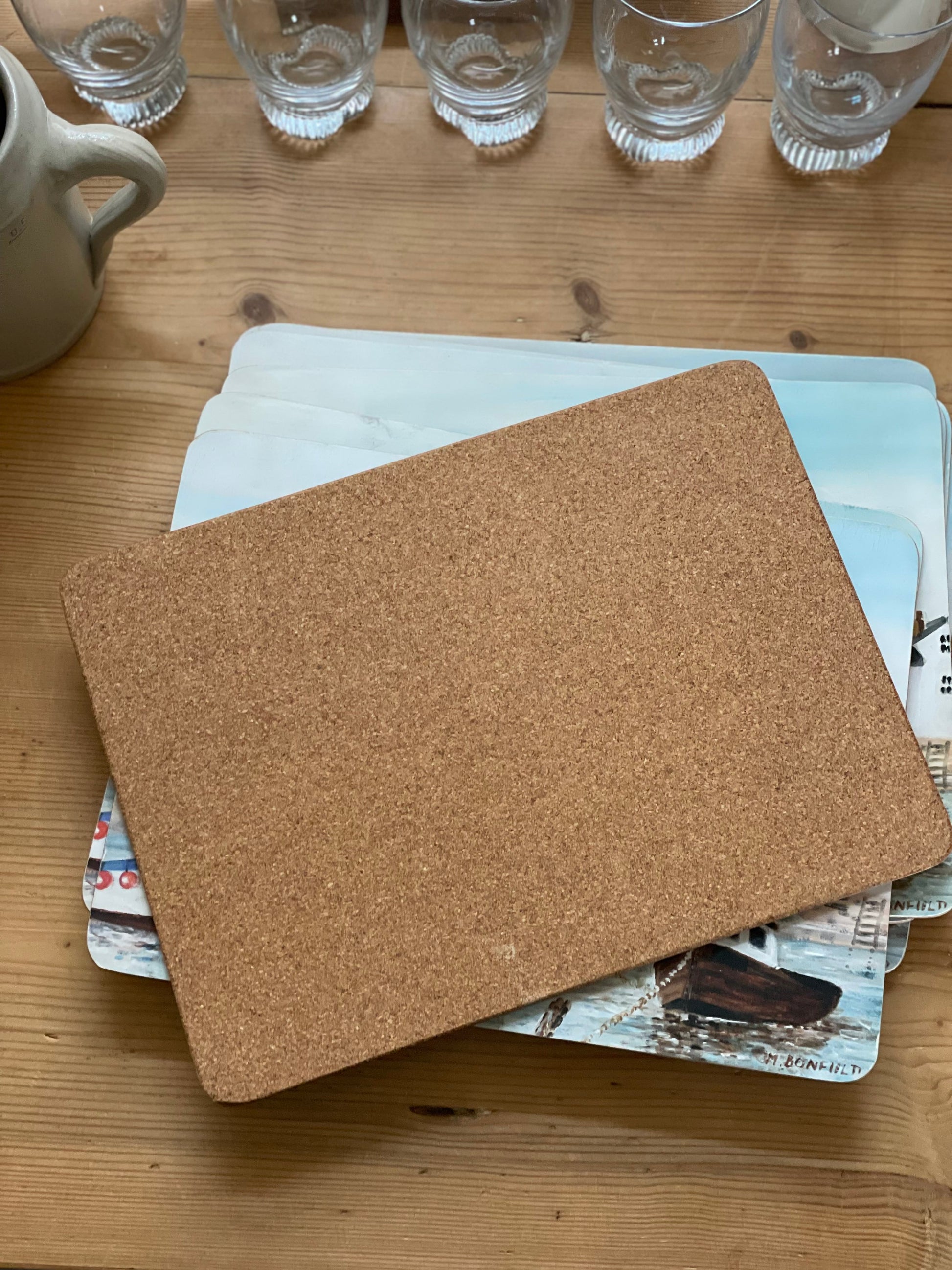 Covorașe de masă din plută cu peisaj nautic semnate Maureen Bonfield, ușor de întreținut.