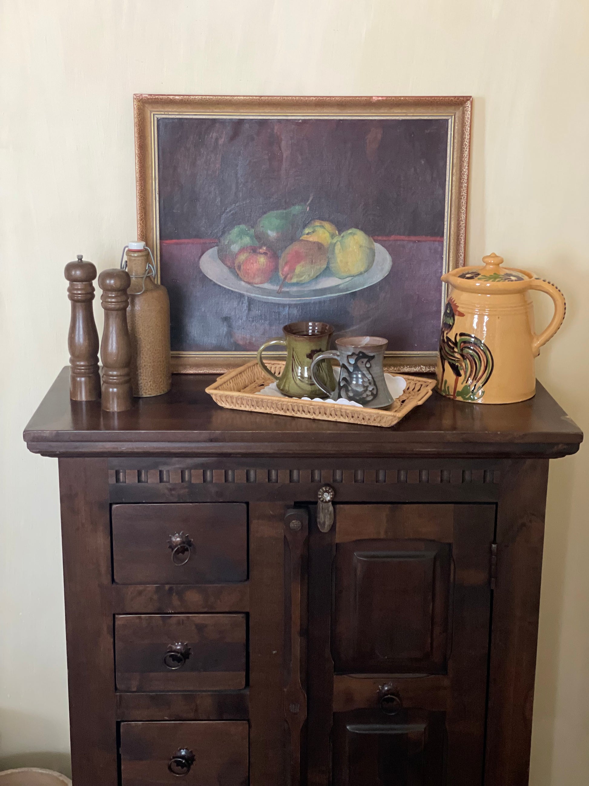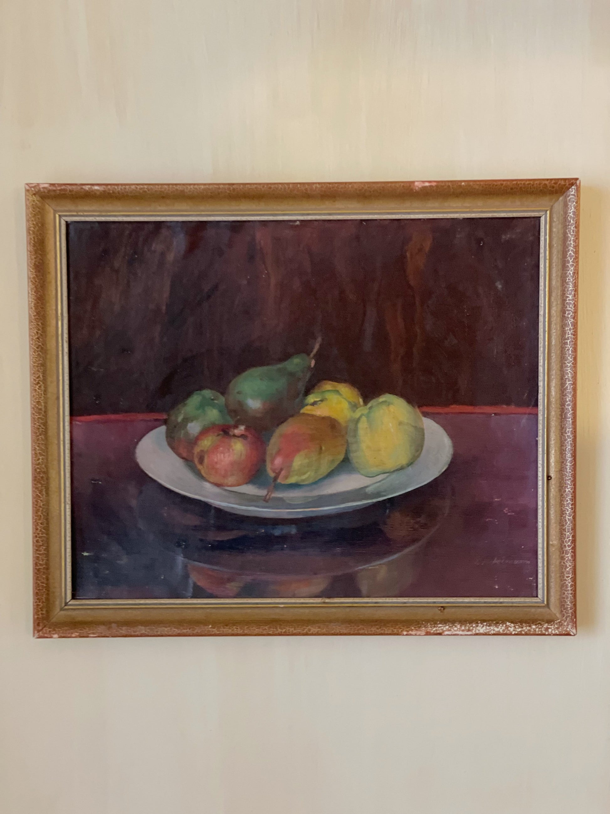 Tablou vechi pictat în ulei, natură statică-Bol cu fructe