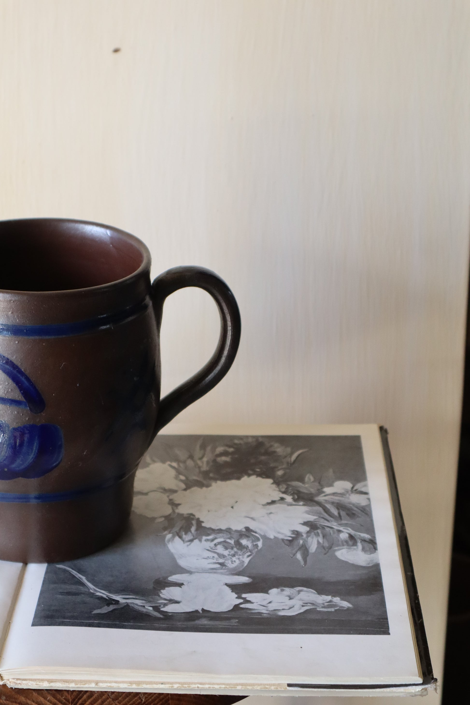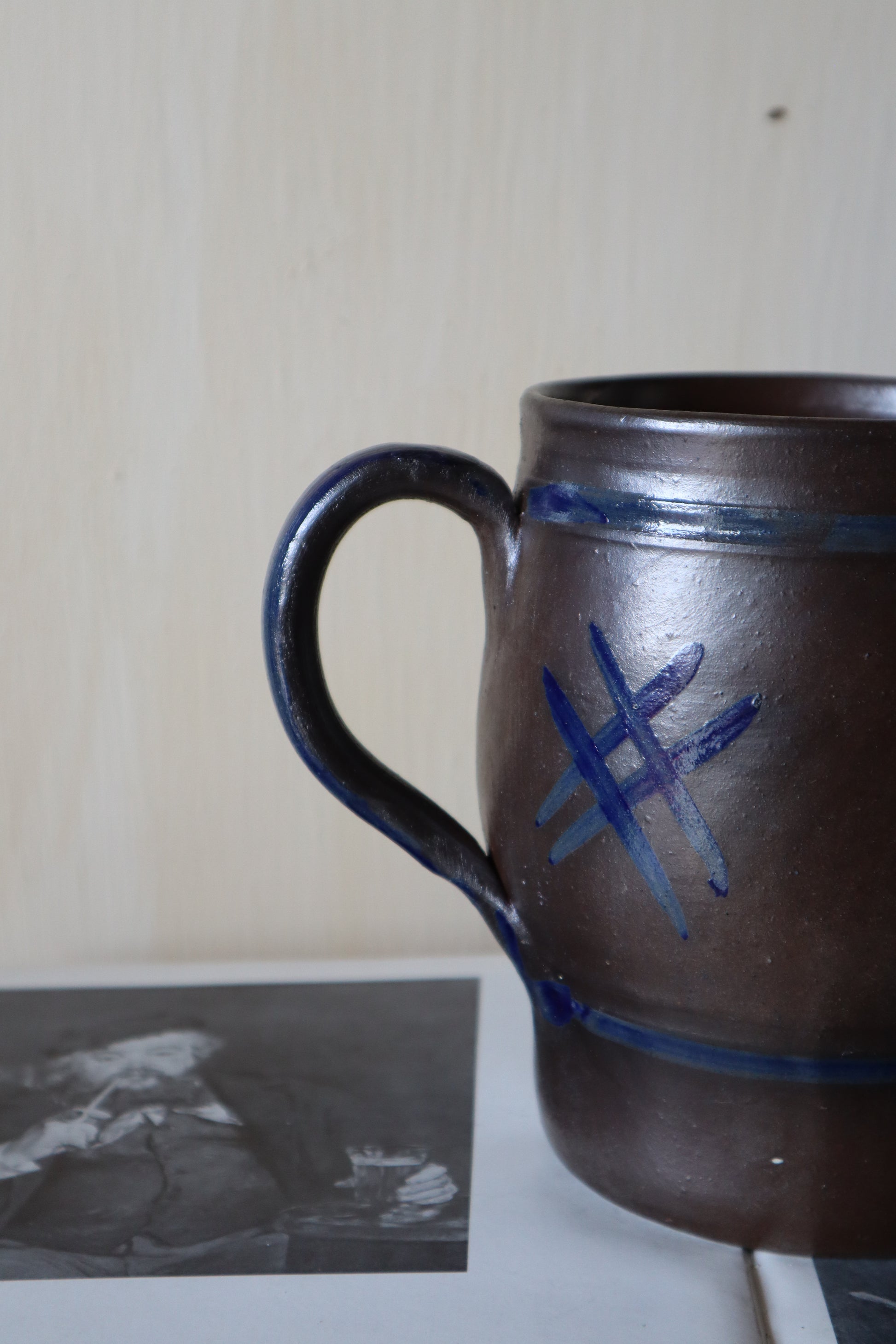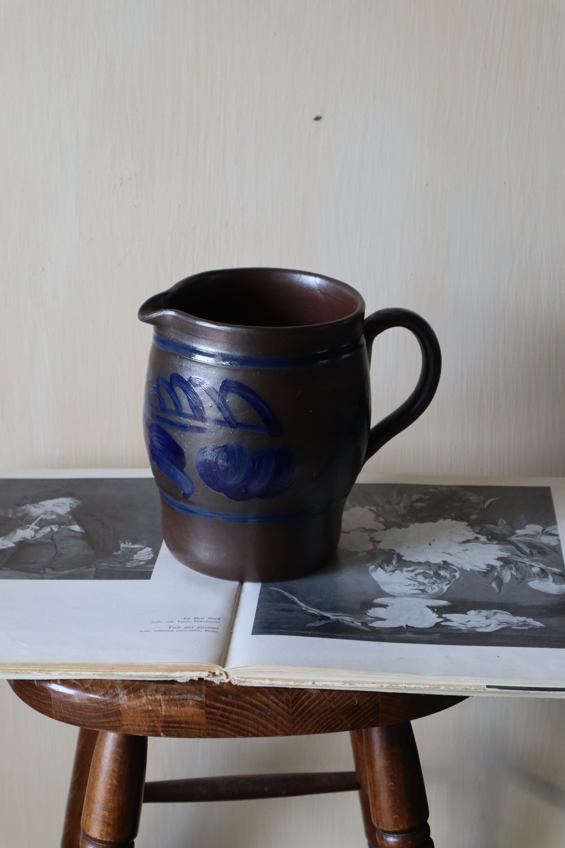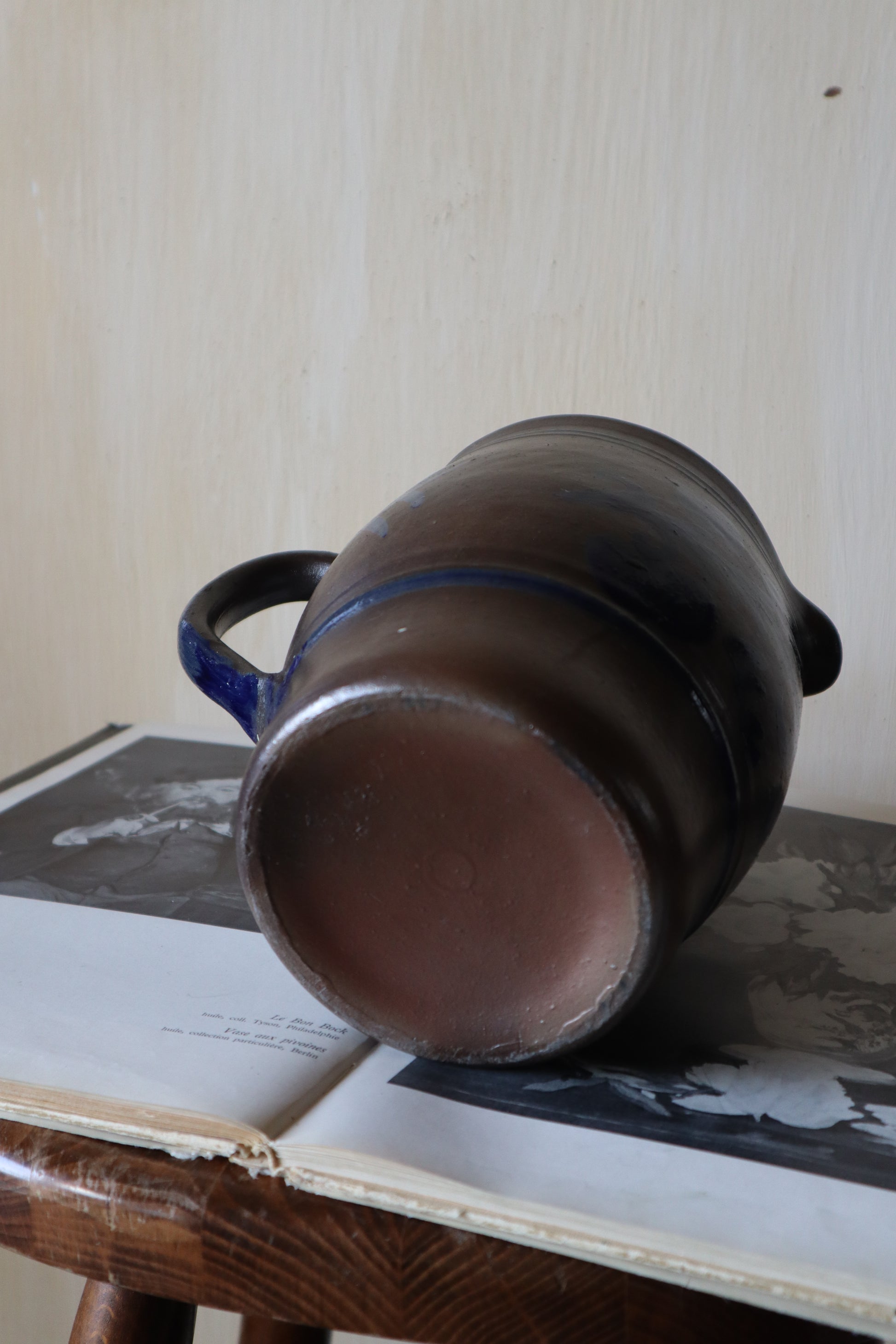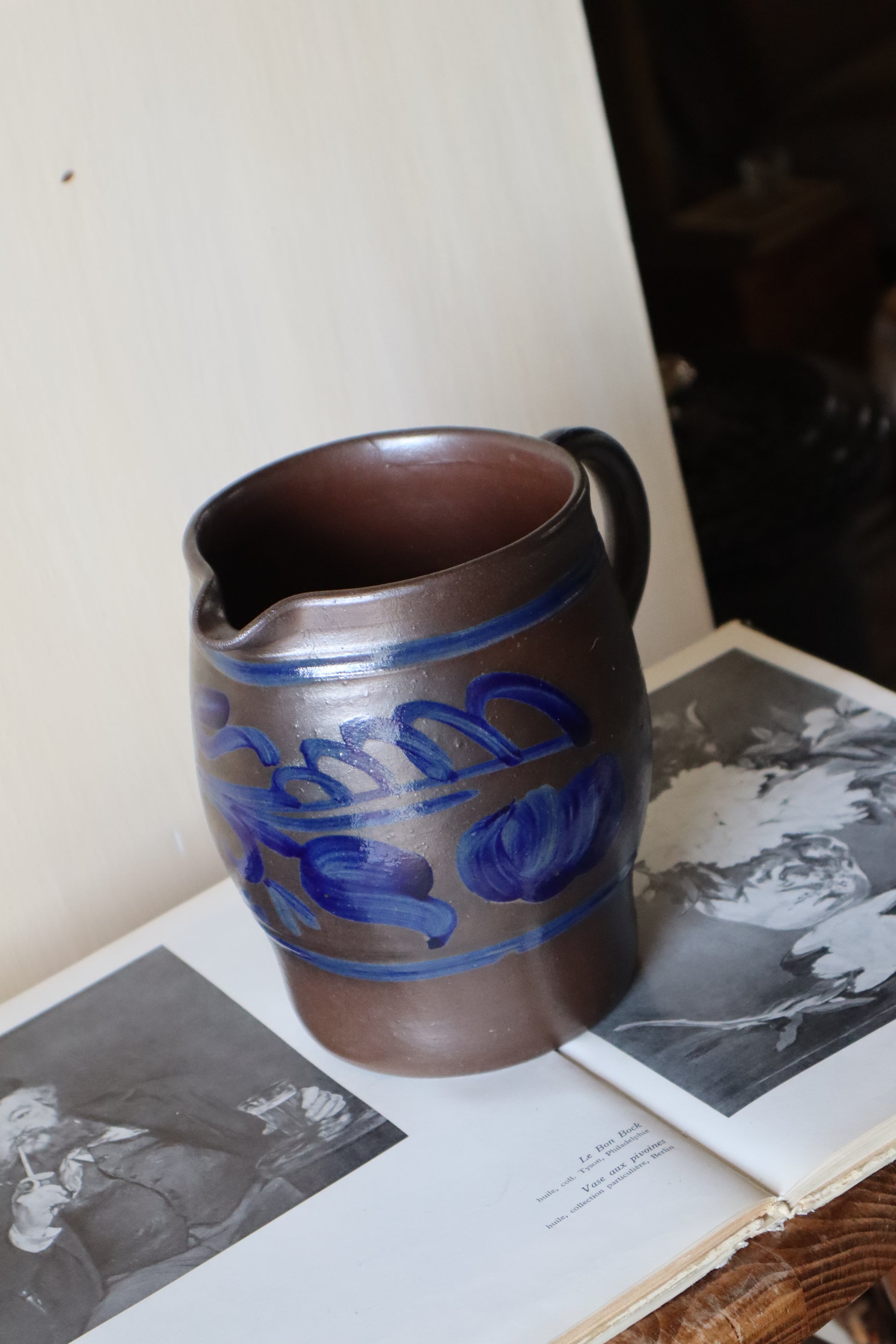 Ulcior/recipient pentru depozitare cu toarta din lut glazurat cu sare, în frumoase tonuri de maro și bleumarin-motive florale.
