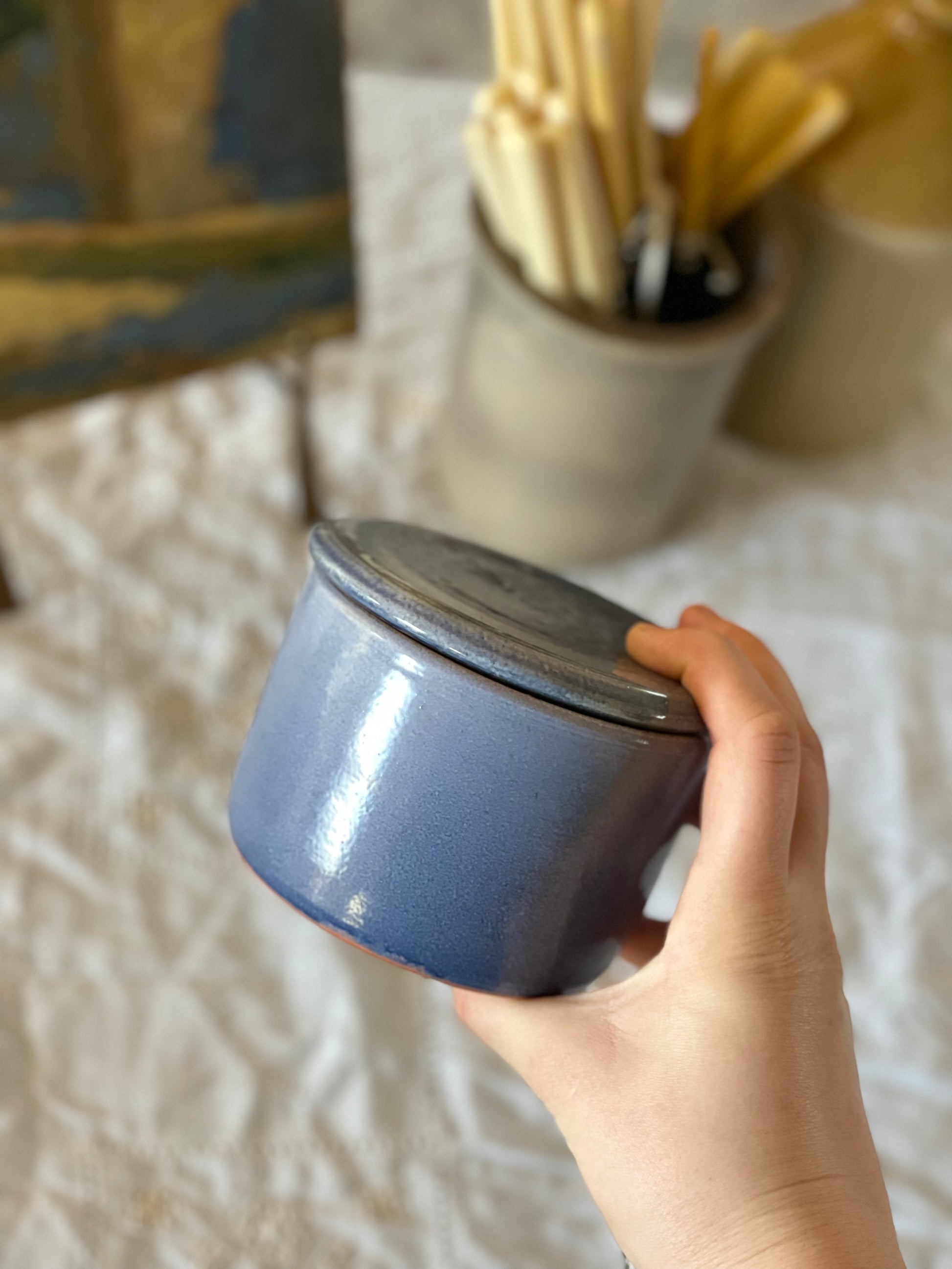 Această untieră franceză din ceramică, lucrată manual, combină funcționalitatea și eleganța vintage. Structura sa din două compartimente: unul pentru unt și altul pentru apă, permite menținerea untului la consistența ideală pentru servire.
