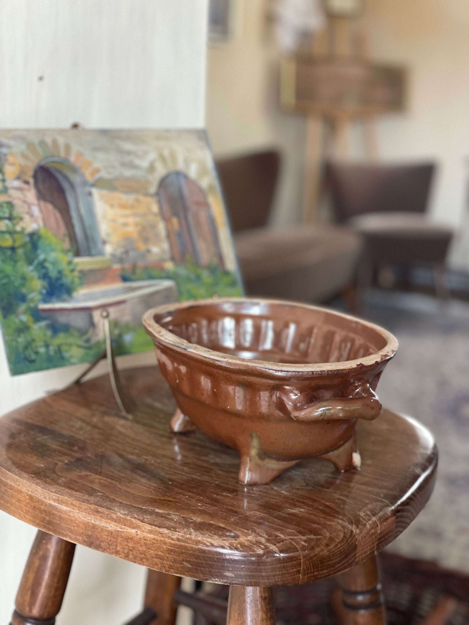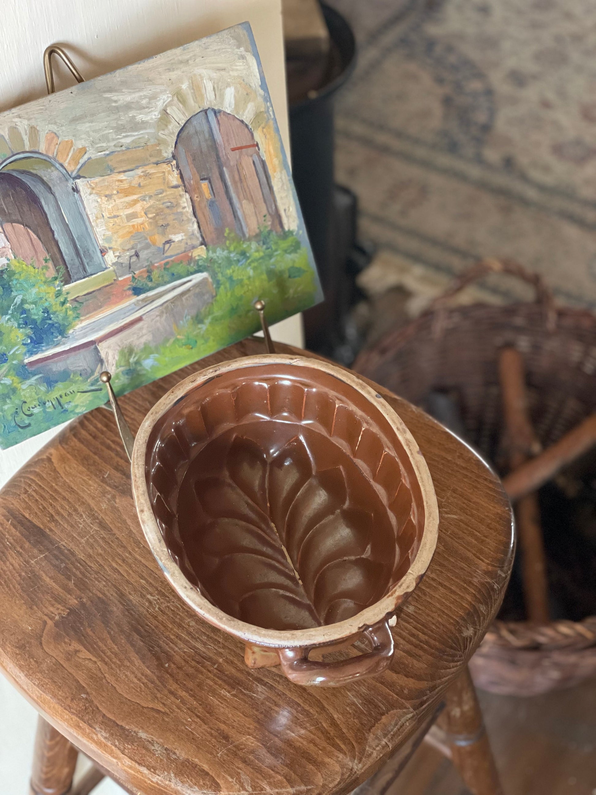 Vas pentru copt/matriță glazurată cu mânere și picioare, model floral.