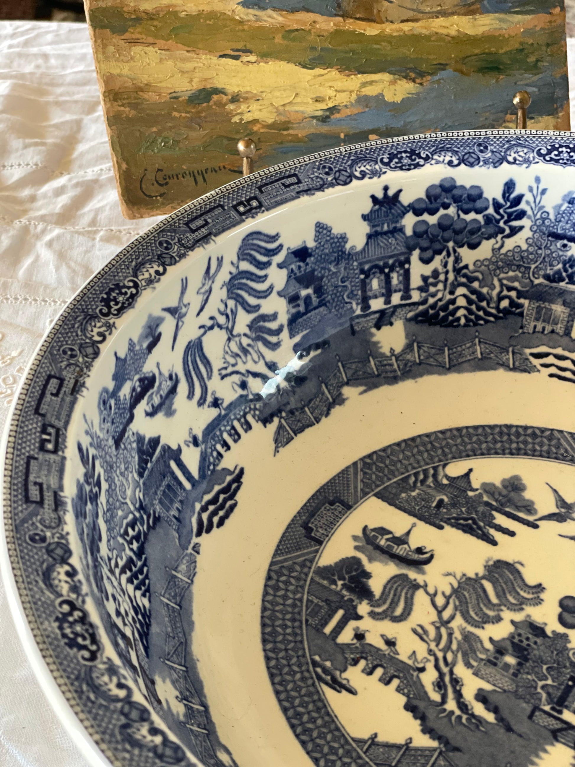 Vas de frământat din ceramică englezească de epocă, o piesă rară și căutată de colecționari. Această creație din secolul al XIX-lea combină eleganța designului chinezesc cu craftsmanship-ul englez, fiind inițial utilizată ca lavoar în gospodării de prestigiu.